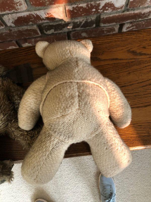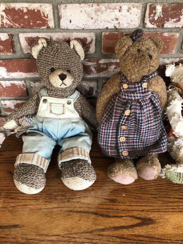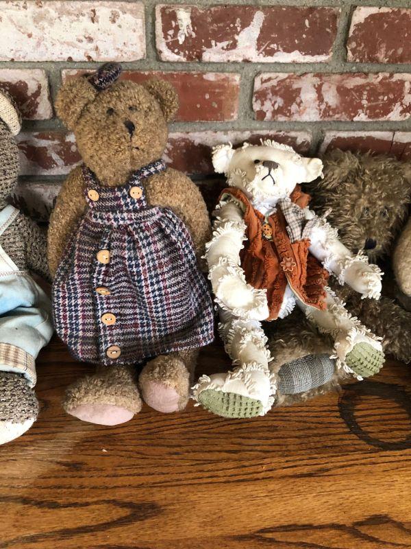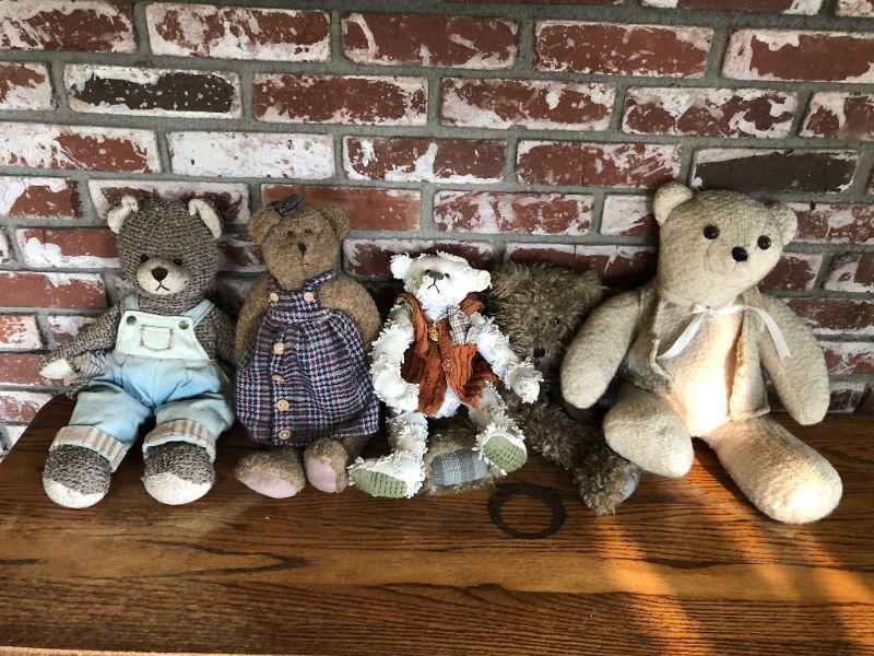 5 plush teddy bears. Each one different from the rest. Previously displayed so they may be dusty.
