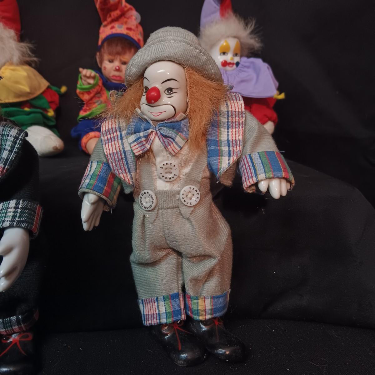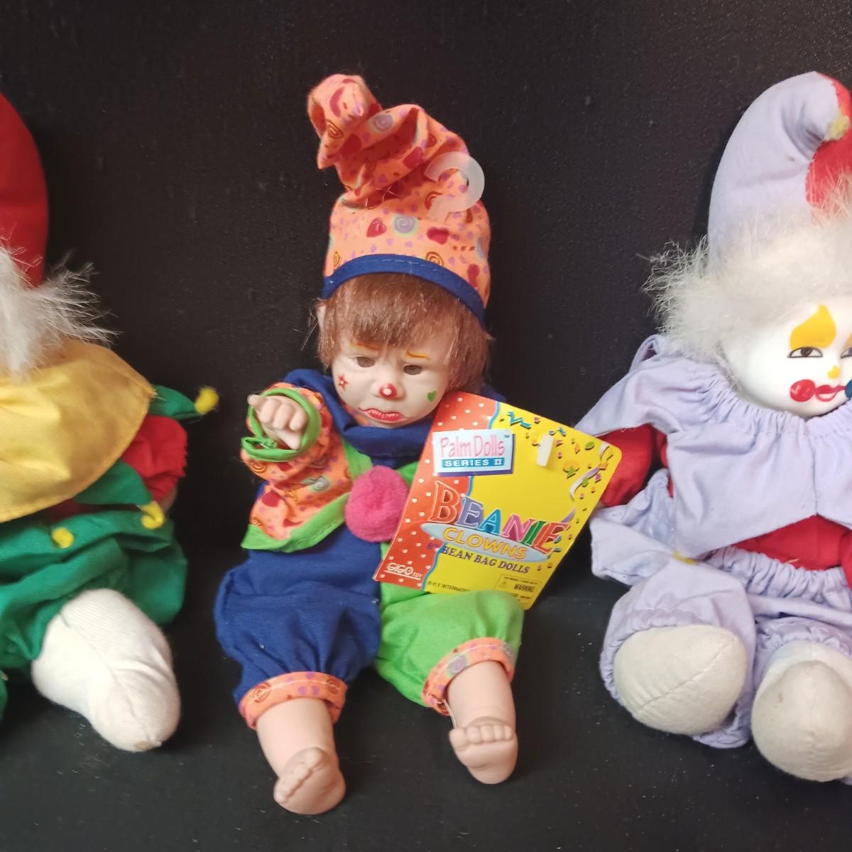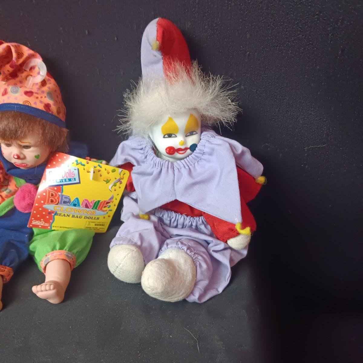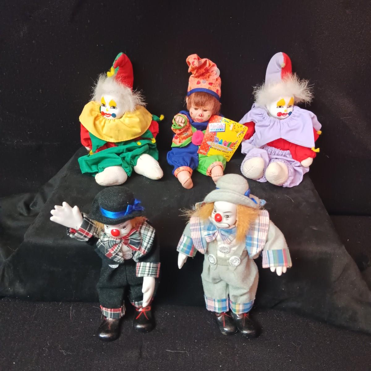 5 PORCELAIN HEAD AND FEET CLOWNS AND 1 BEAN BAG CLOWN APPROX 8"