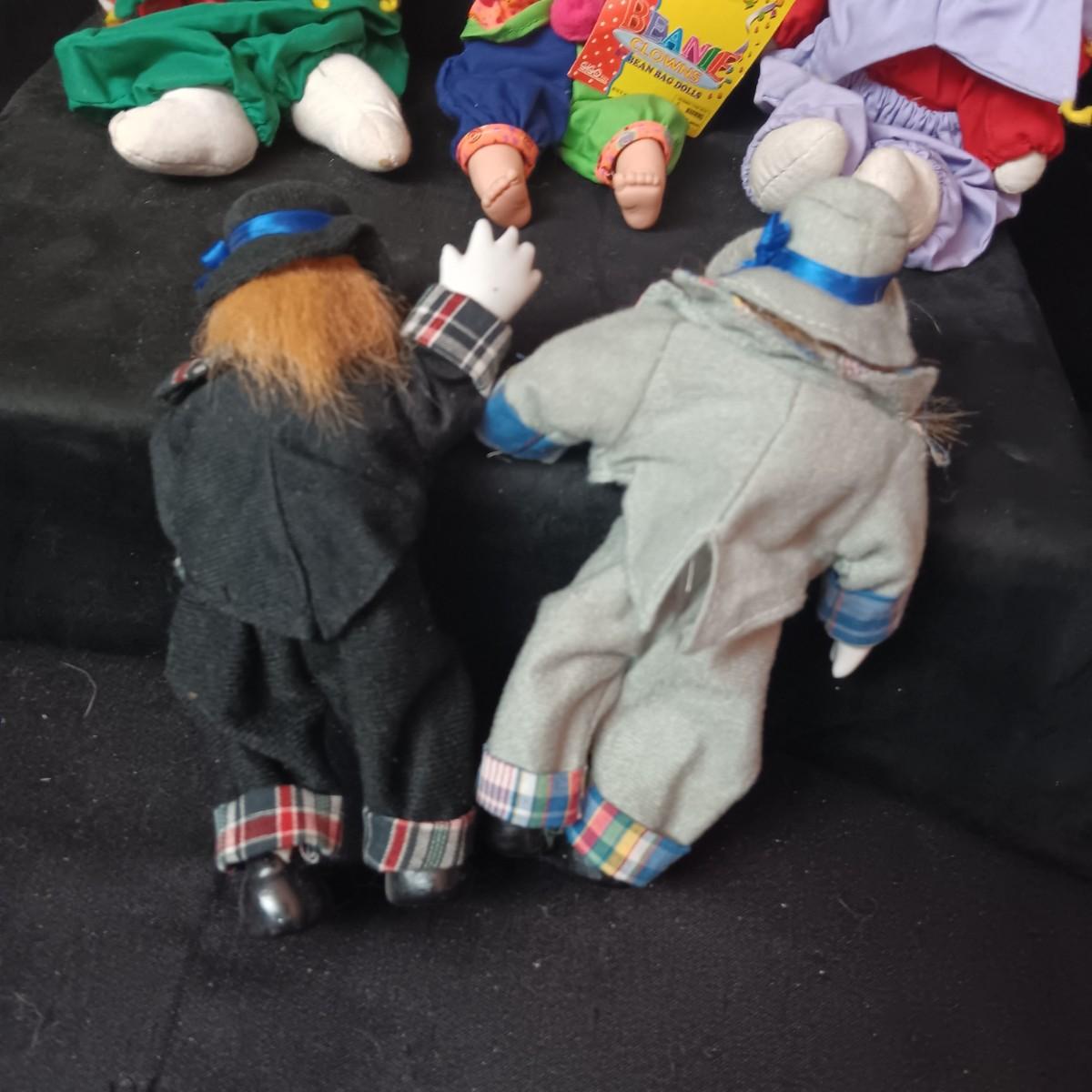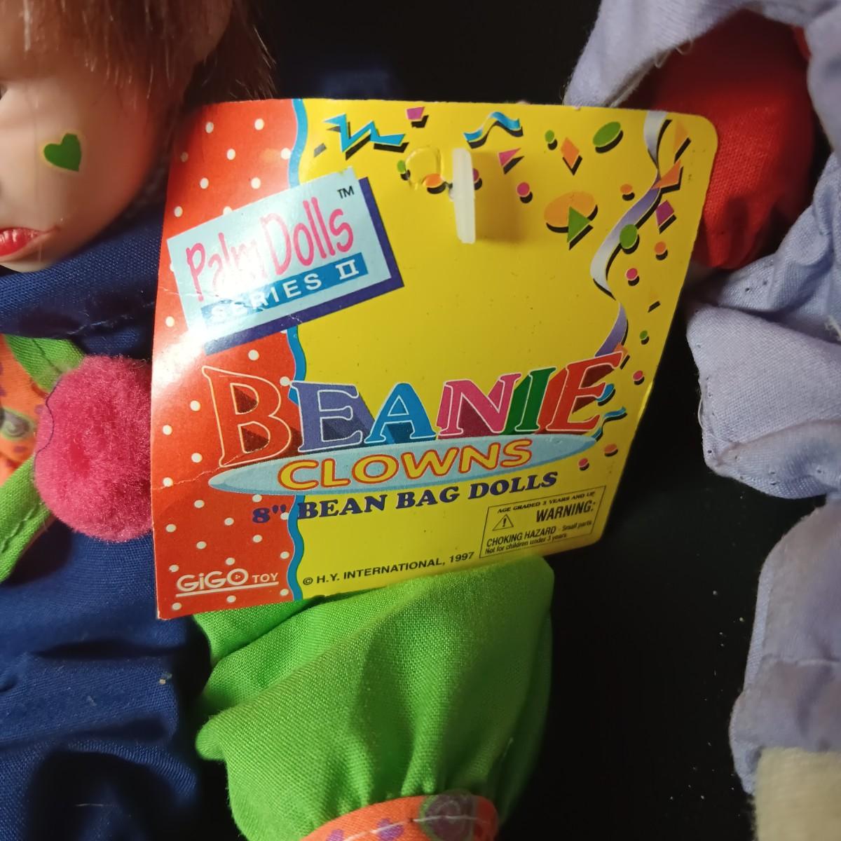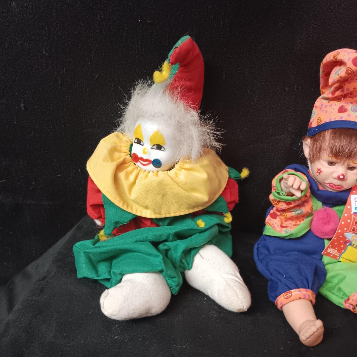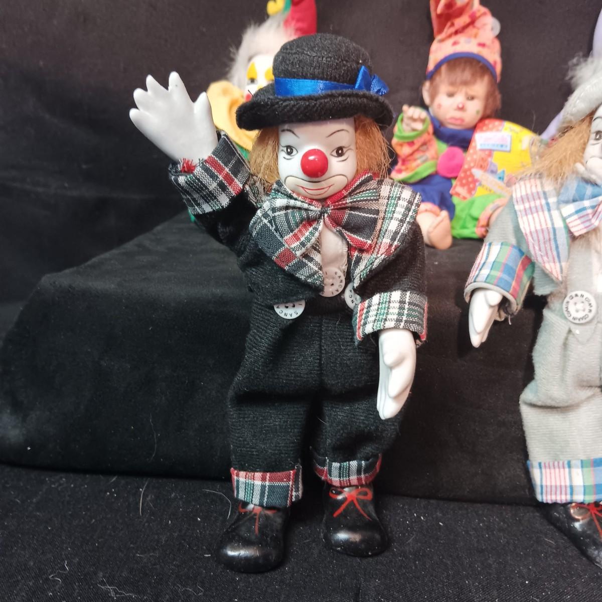 5 PORCELAIN HEAD AND FEET CLOWNS AND 1 BEAN BAG CLOWN APPROX 8"