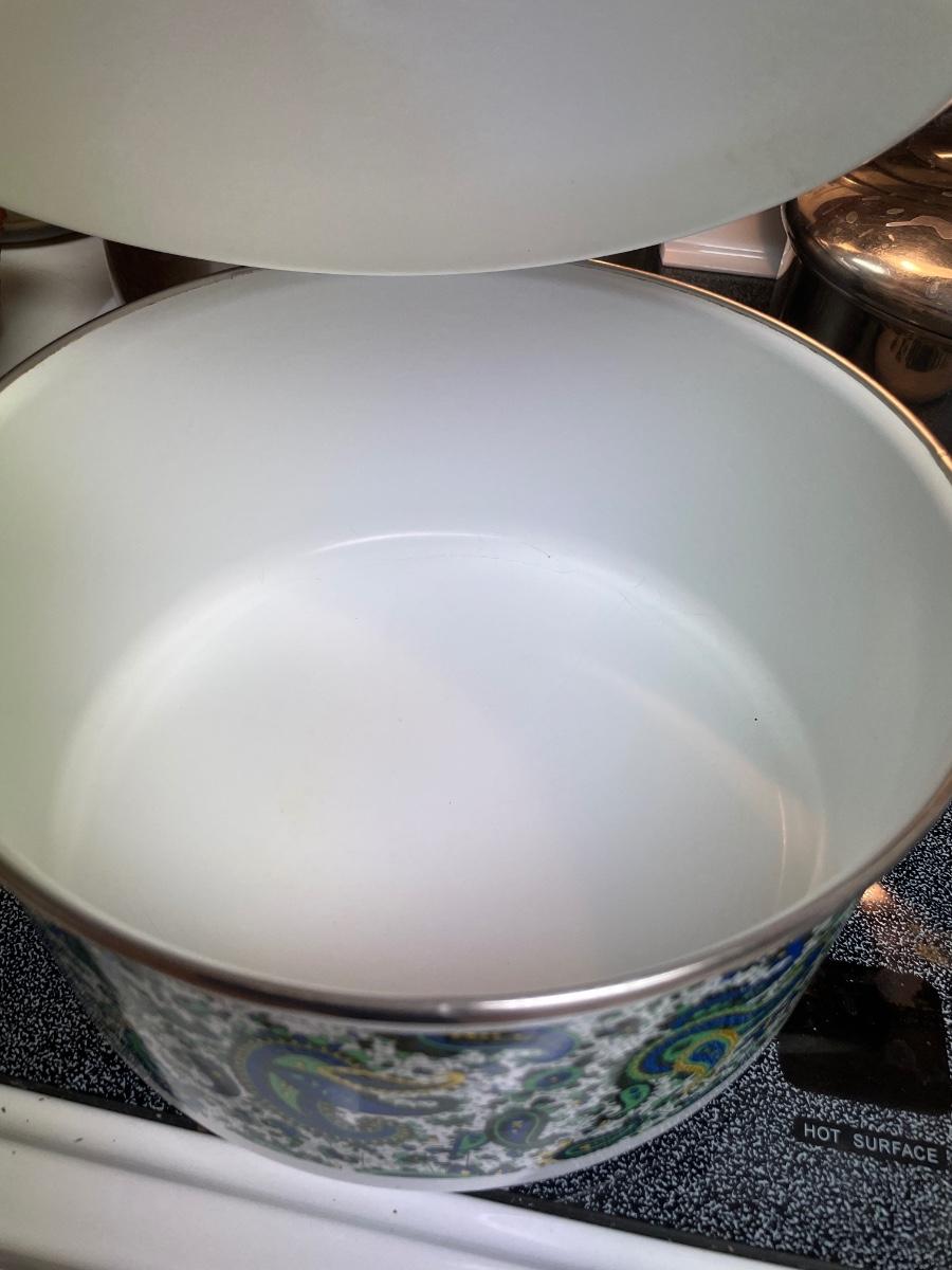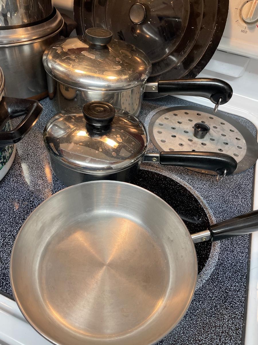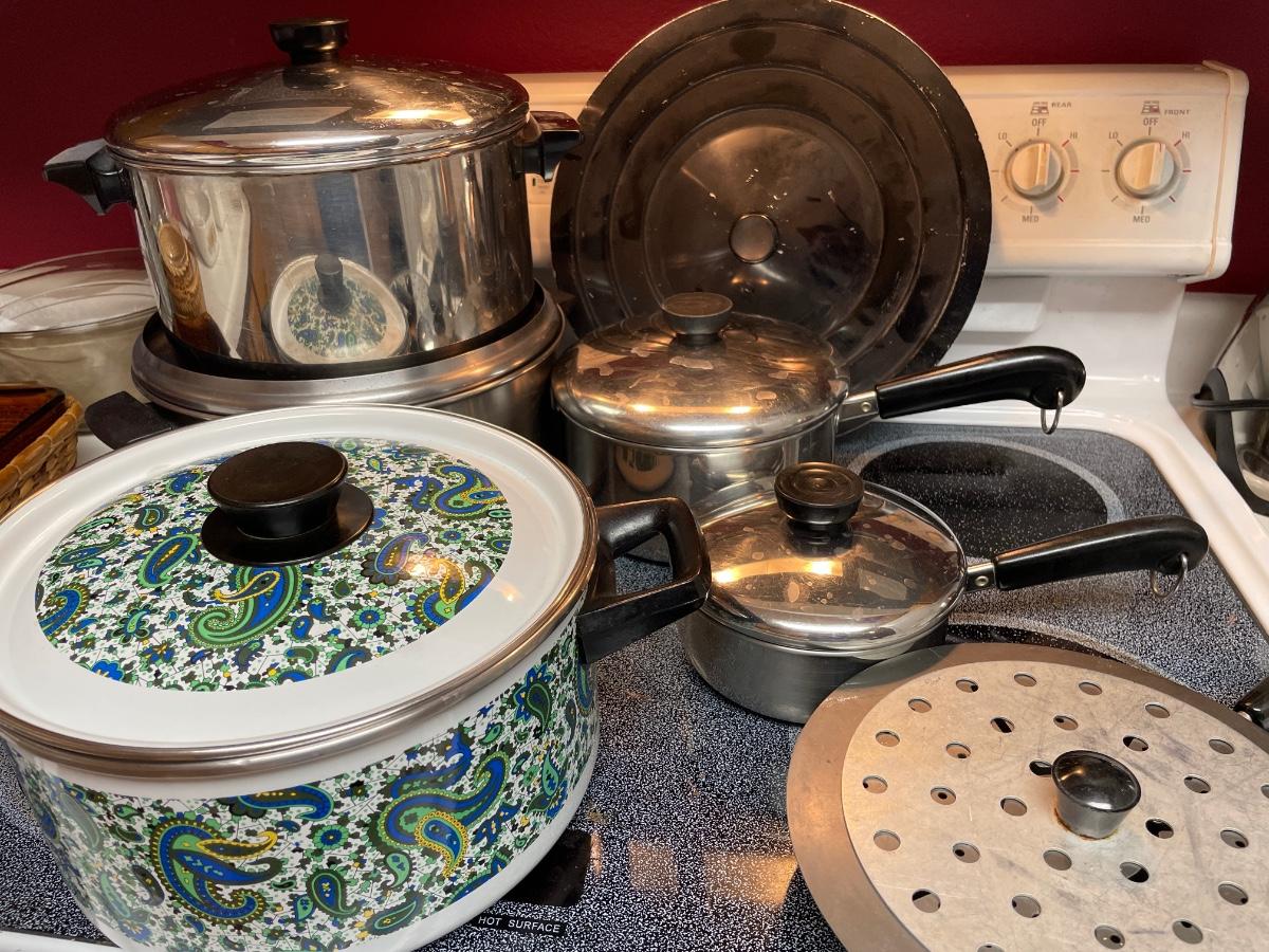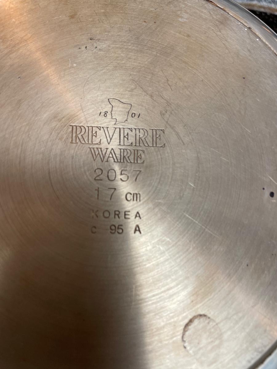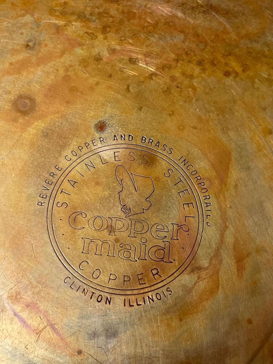 4 Revere pots & 1 deep pan, 1 large pot is Copper maid & paisley pot is unmarked