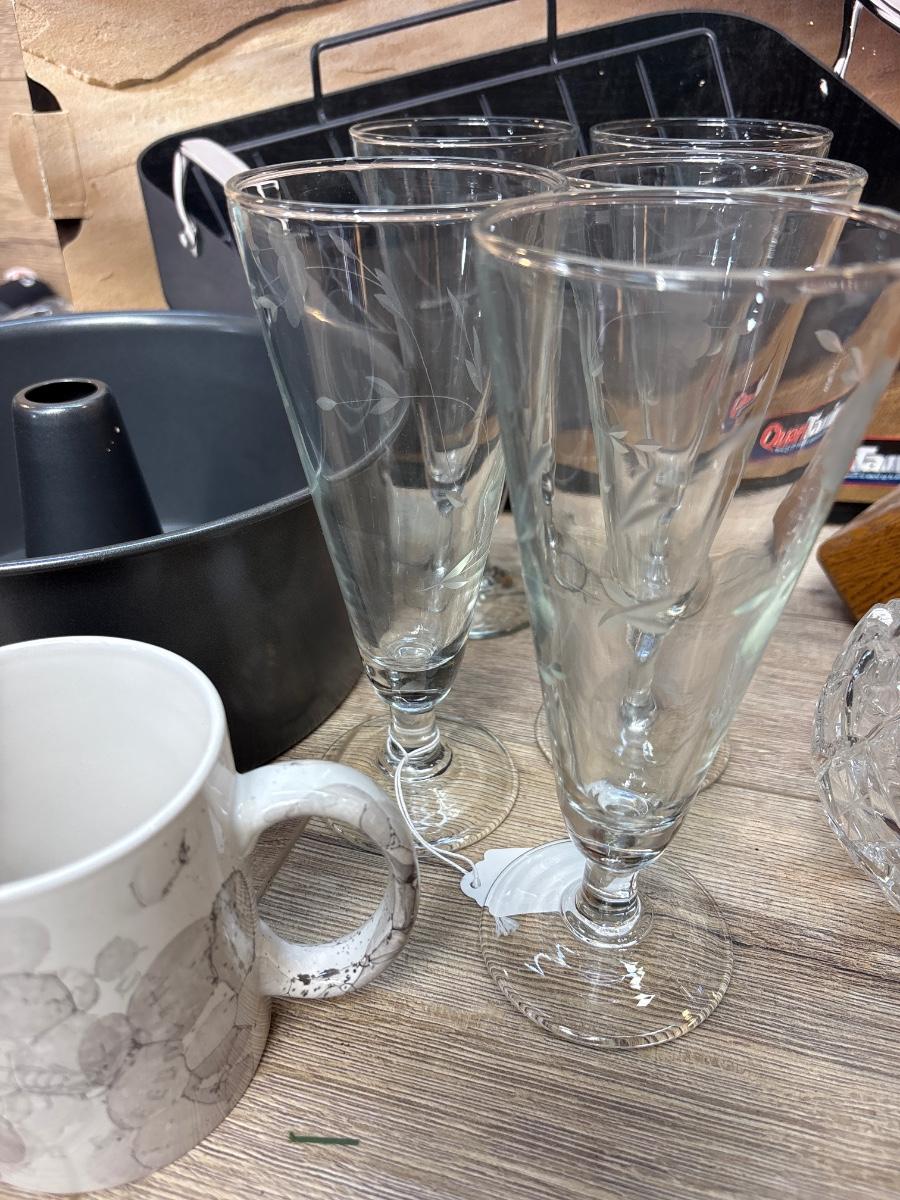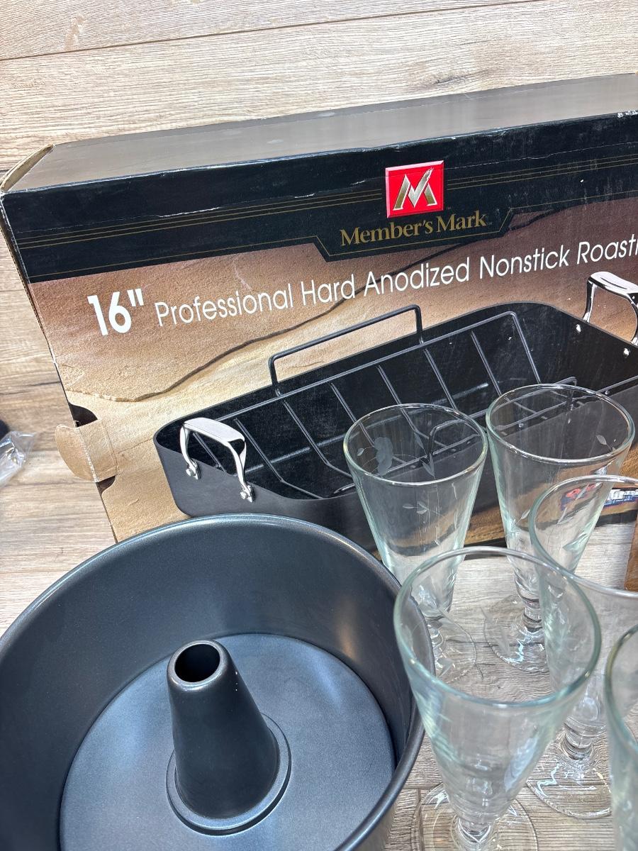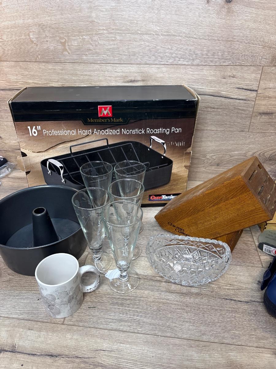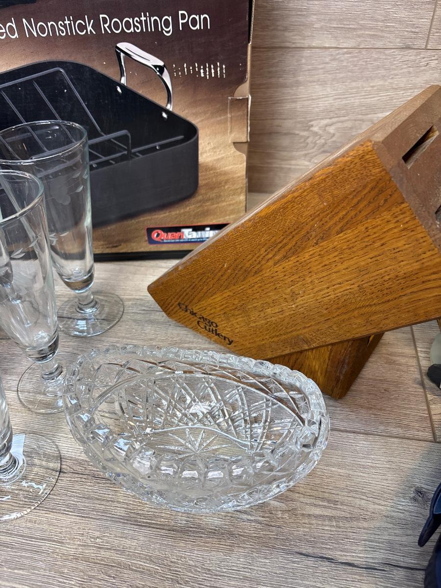 5 Princess House beer mugs, NIB roasting pan, Chicago Cutlery knife block
