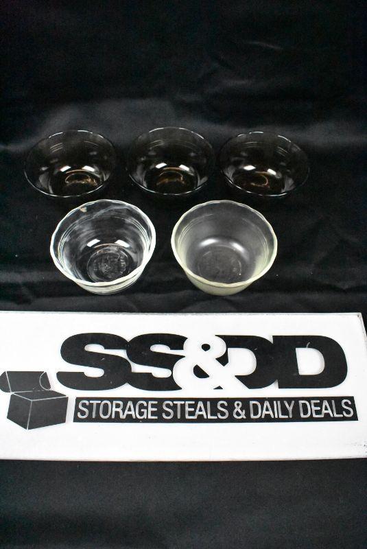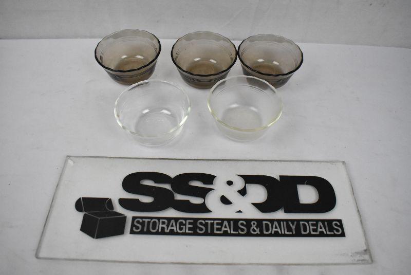 5 Pyrex Ramekins (small glass bowls): 2 Clear, 3 Smoky Brown
