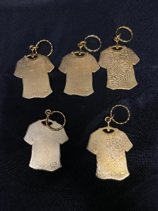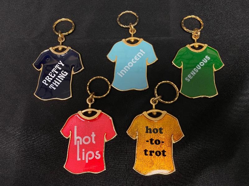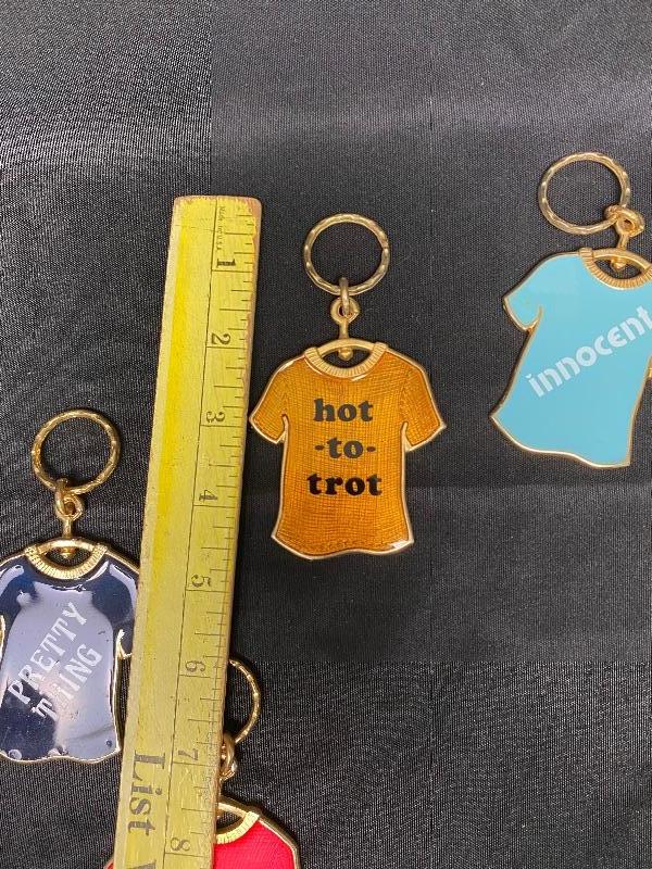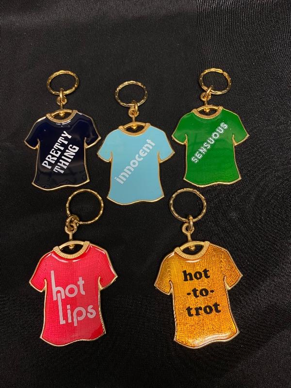 Set of 5 Slogan Keychains. T-Shirt shaped. Slogans are "innocent" "hot lips" "sensuous" "hot to trot" & "pretty thing". Different colors.
