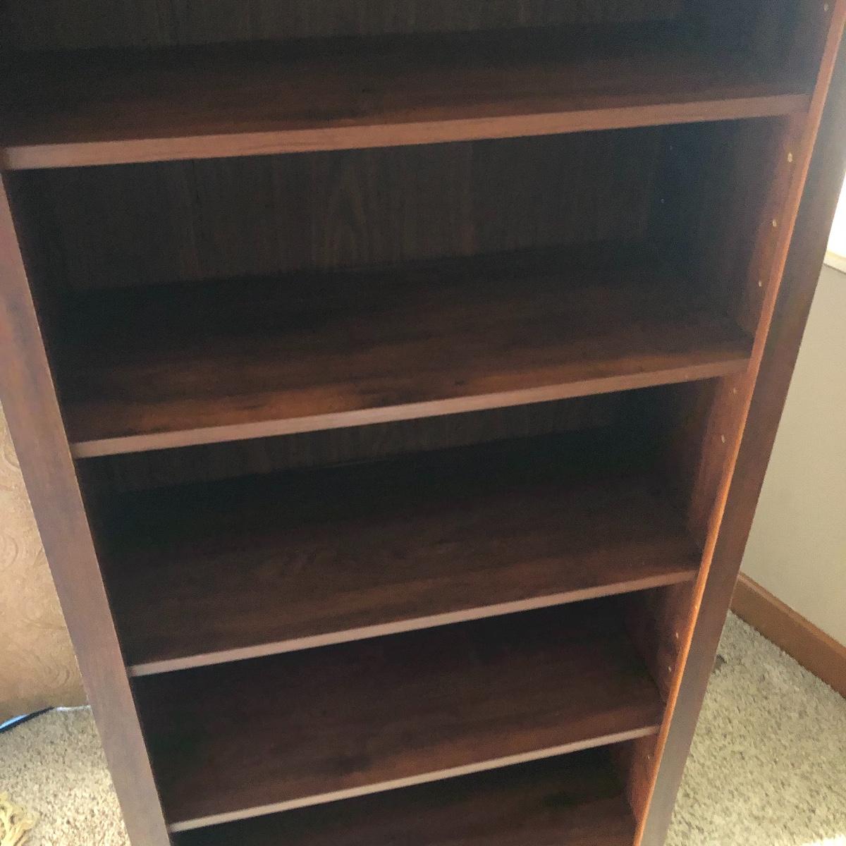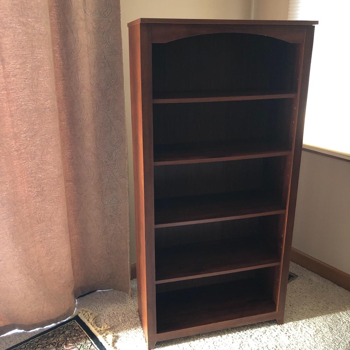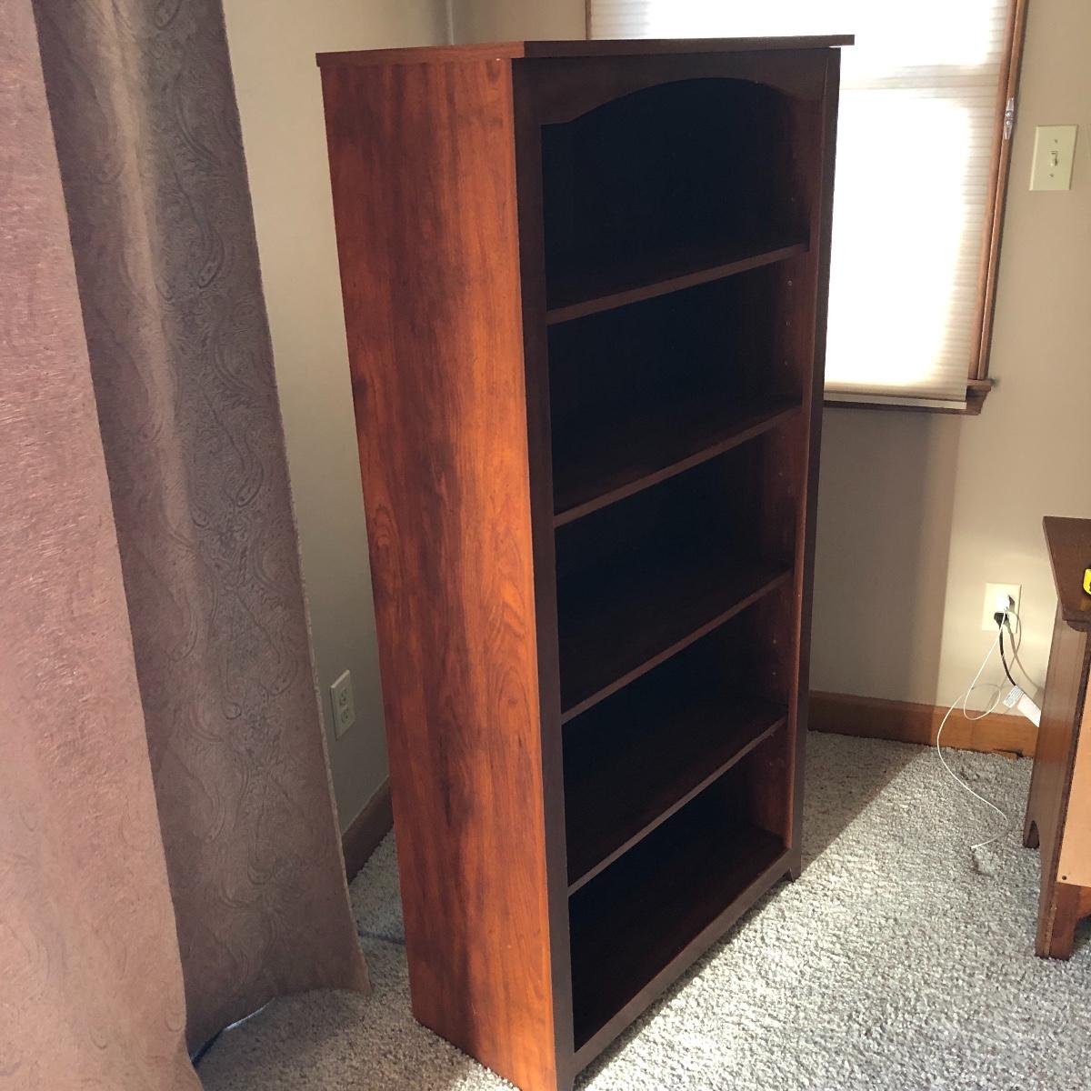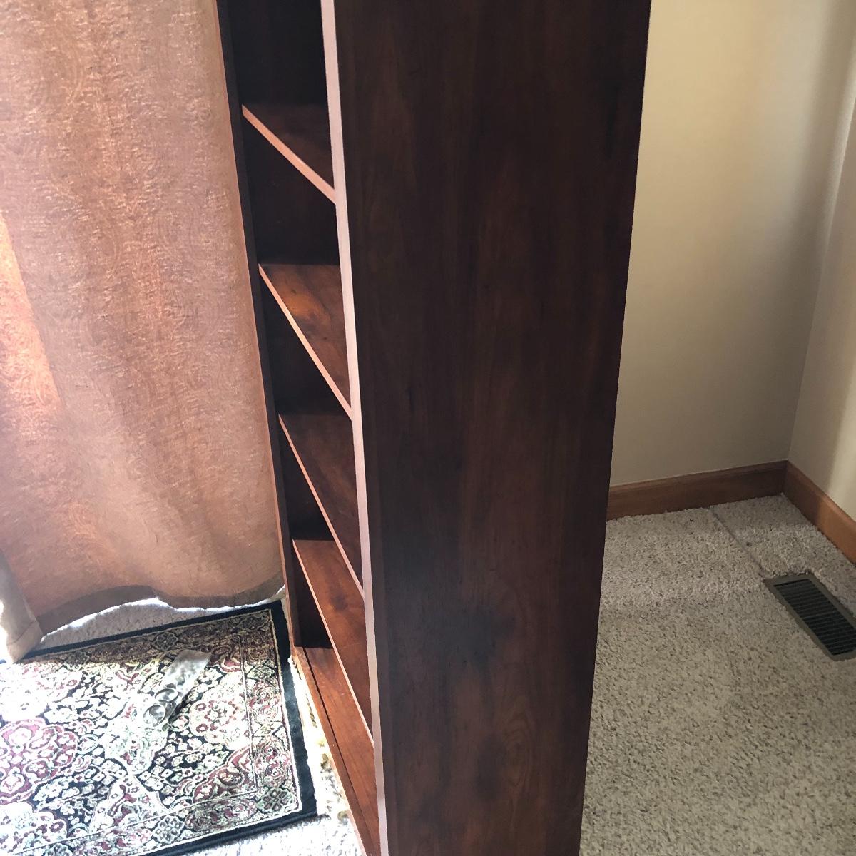 This book case has five shelves and measures 28.5” x 13.5” x 58. It is made of manufactured wood and veneer. Shelves are adjustable. Local pick up only.