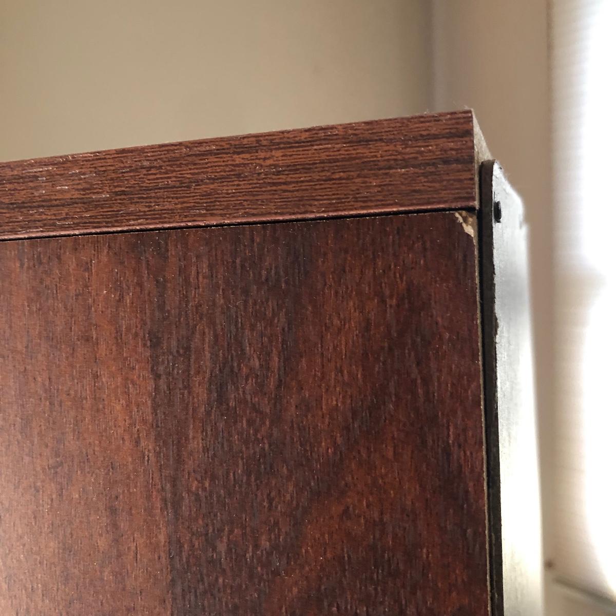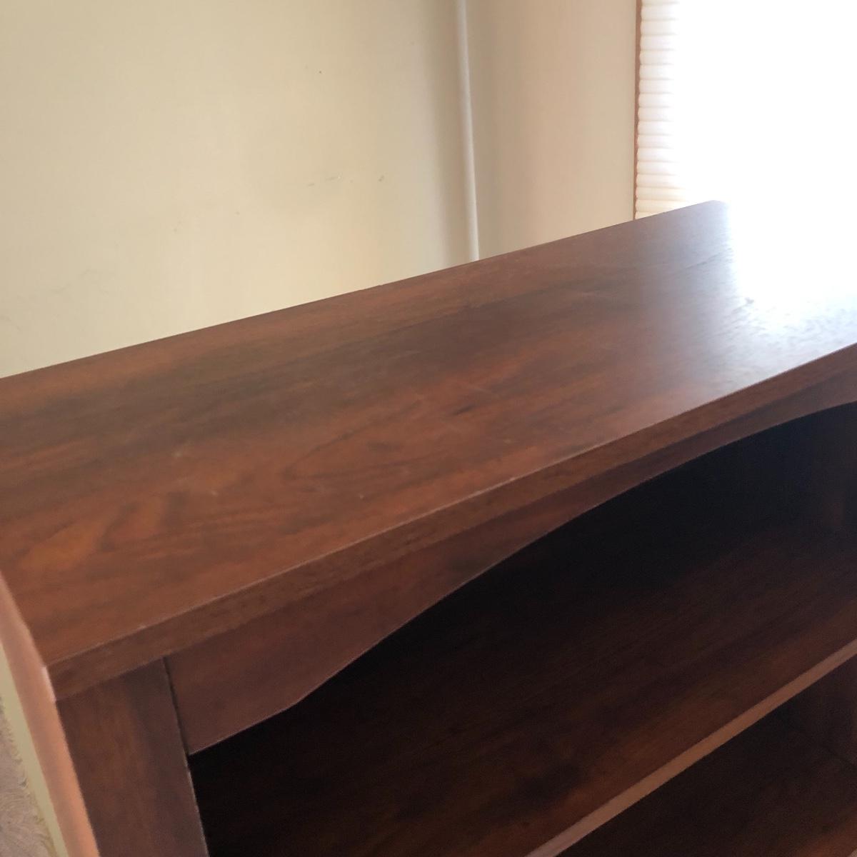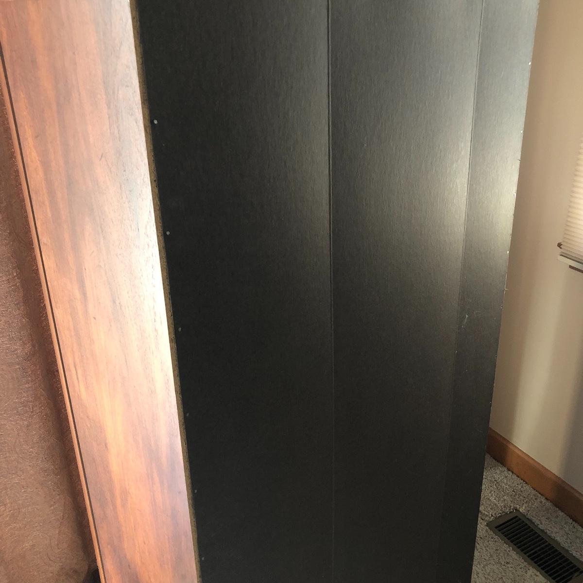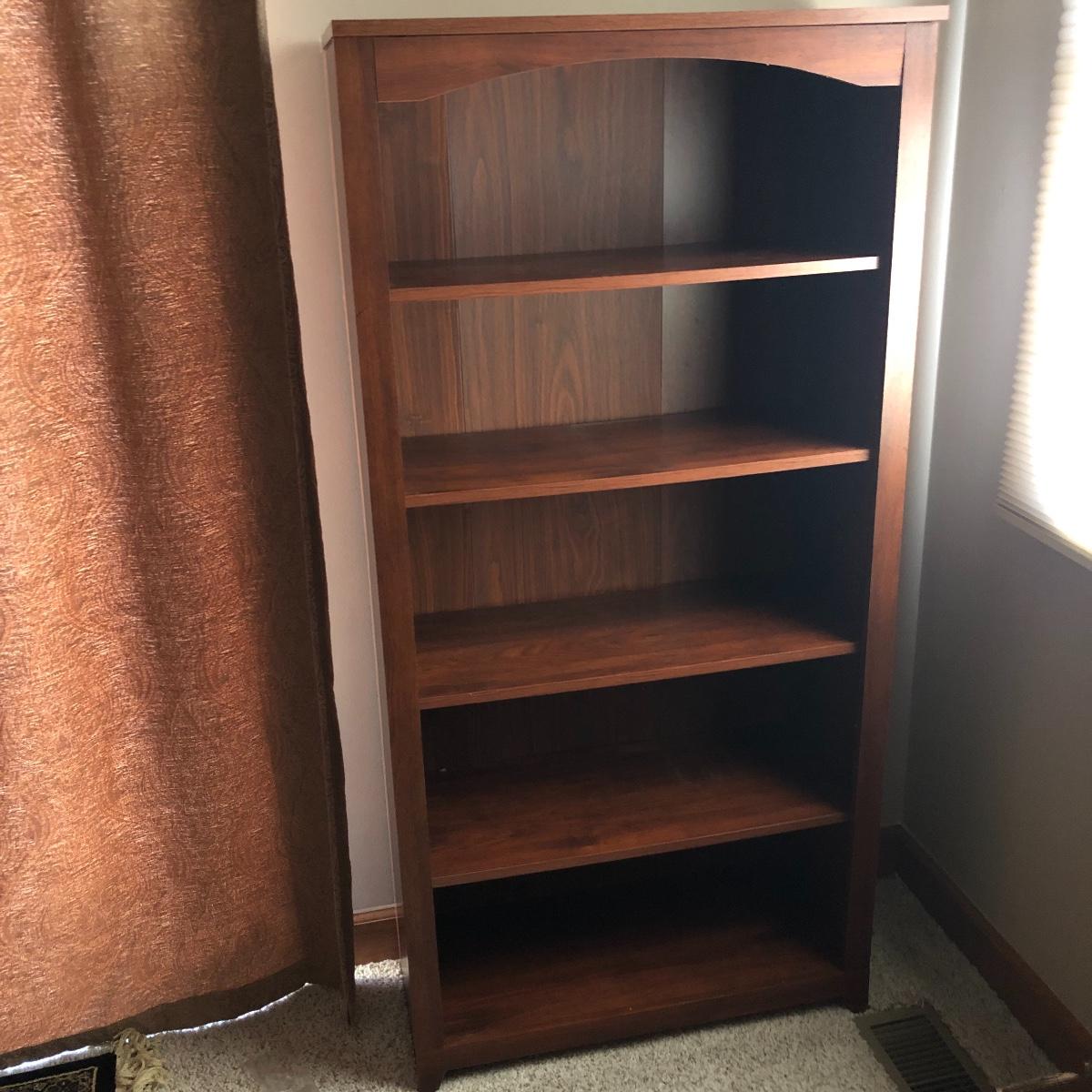 This book case has five shelves and measures 28.5” x 13.5” x 58. It is made of manufactured wood and veneer. Shelves are adjustable. Local pick up only.