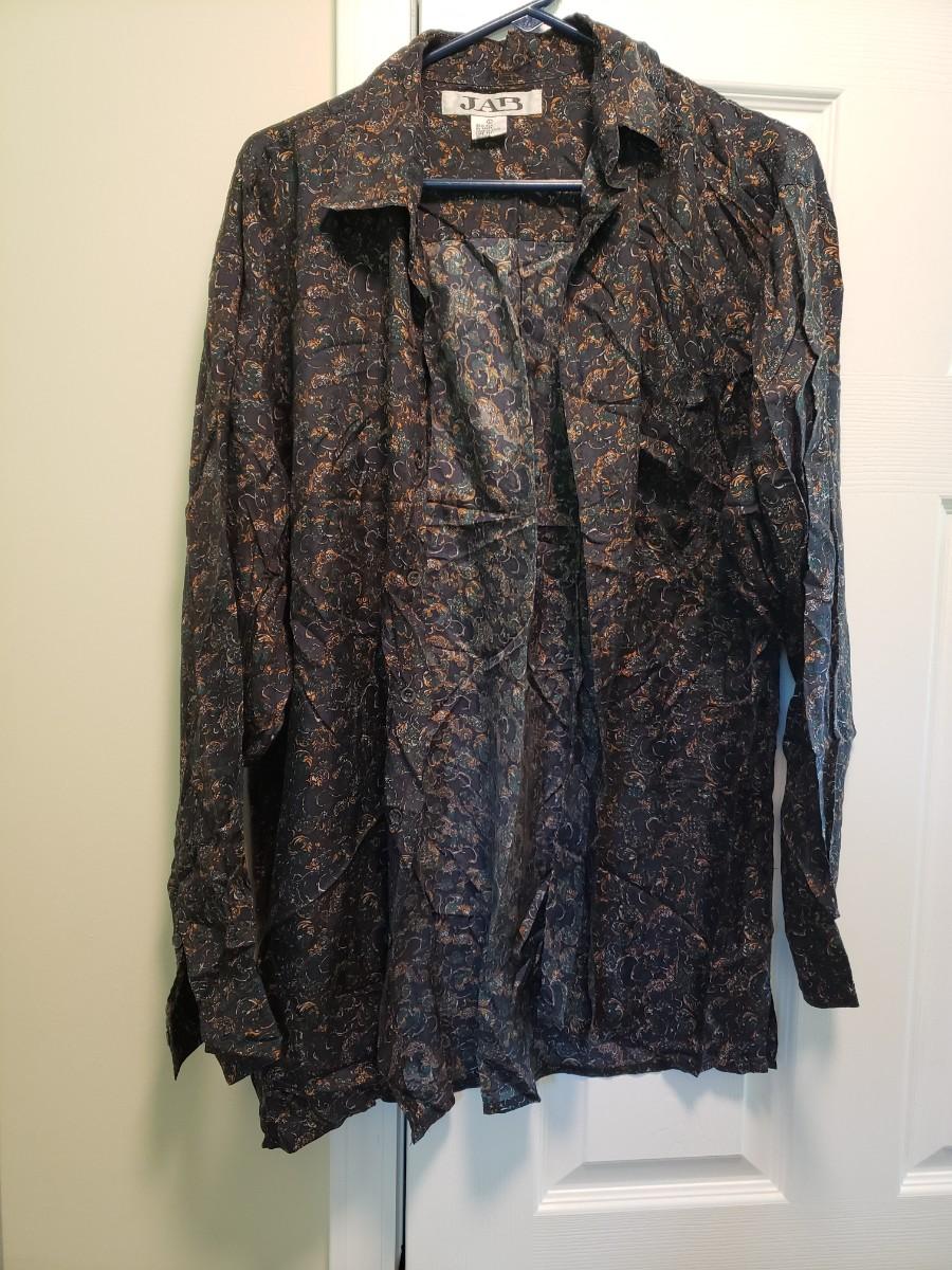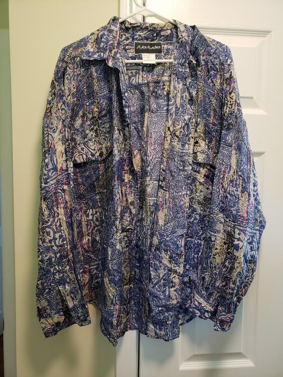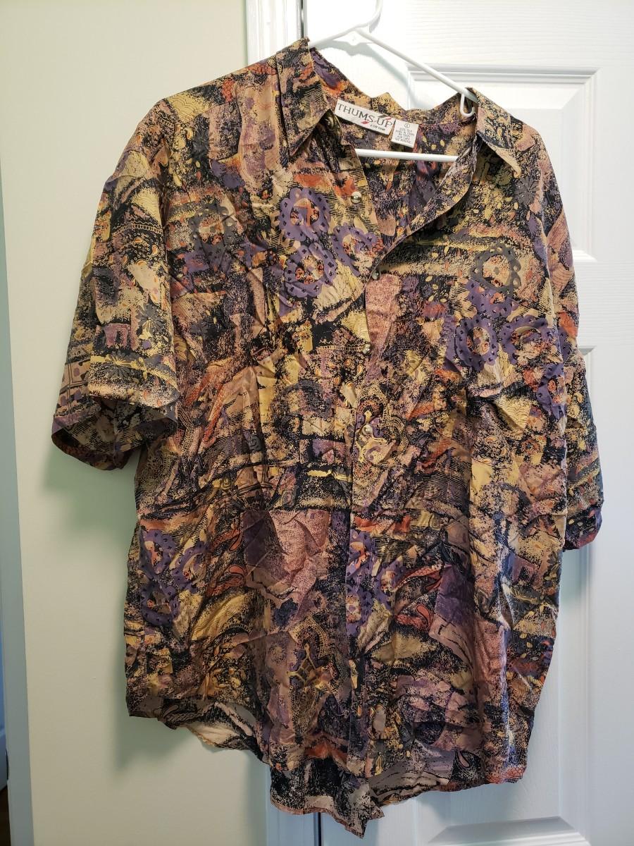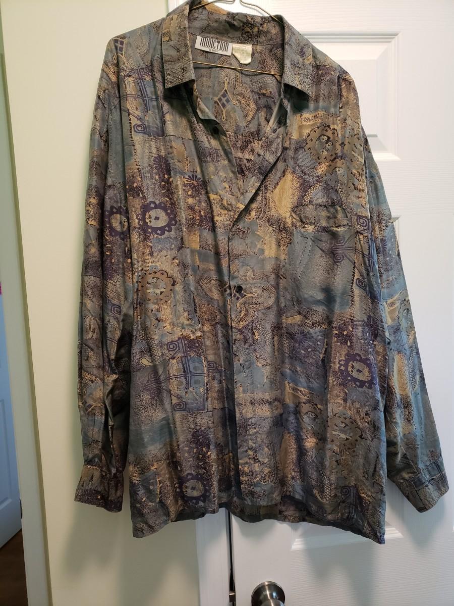 There are 5 silk long and short sleeve shirts with festive prints! Zoom in to see the sizes. All shirts appear to be in good condition. Shipping available.