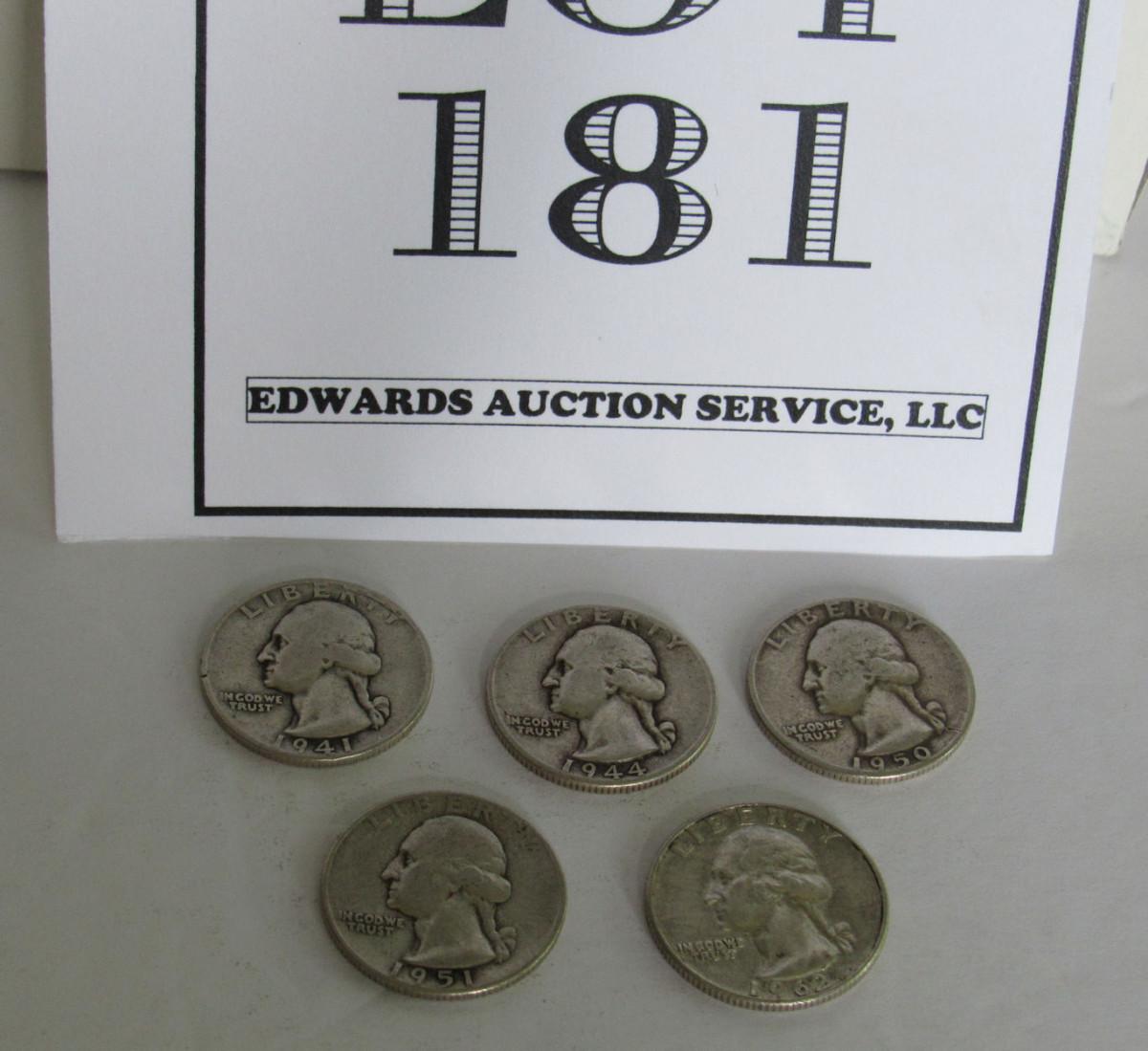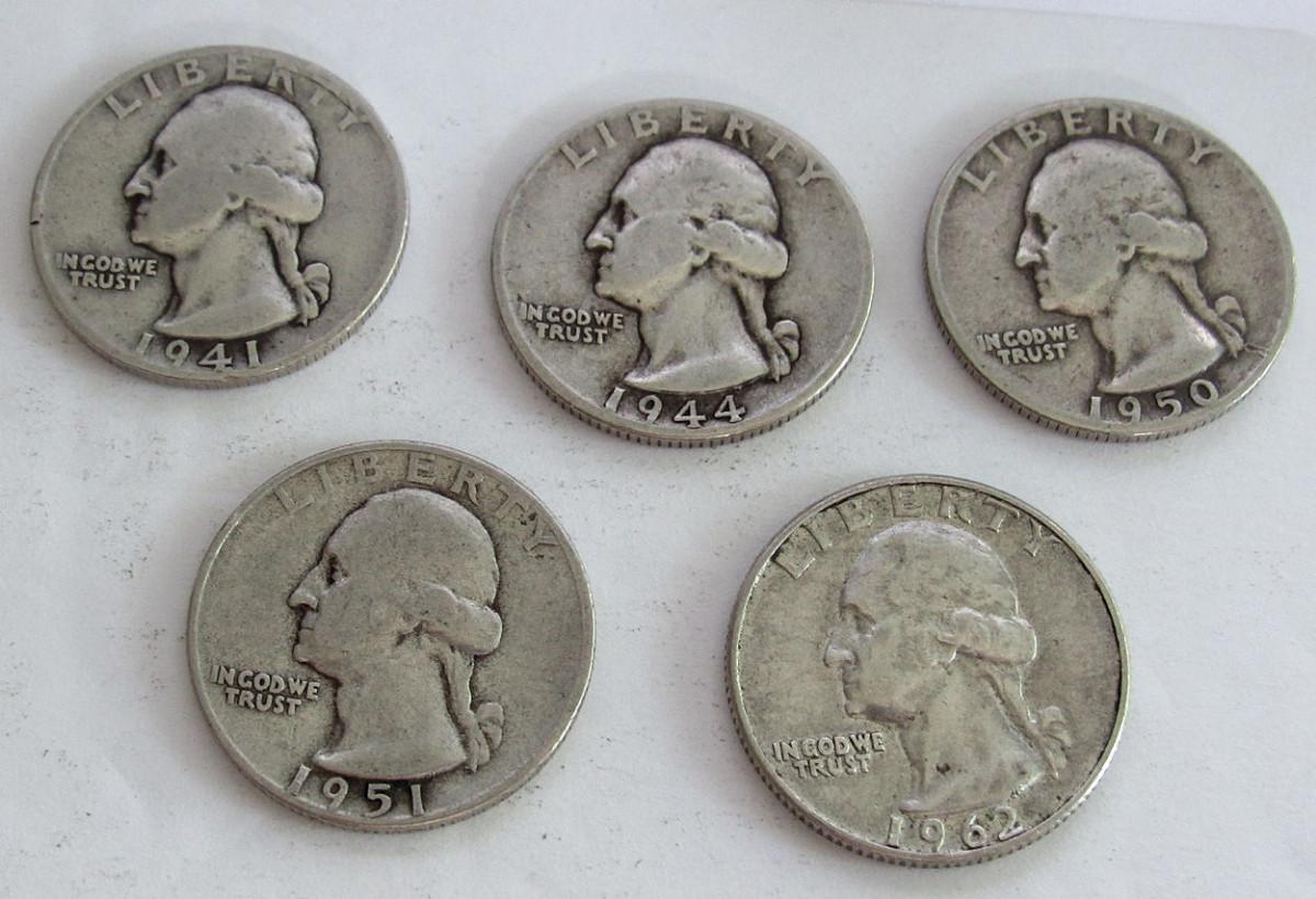 5 Silver Quarters: 1941 D (edge nick), 1944, 1950, 1951, 1962 D
