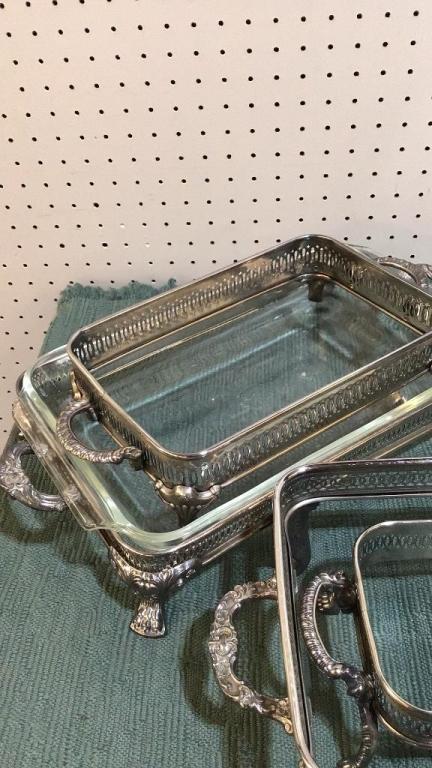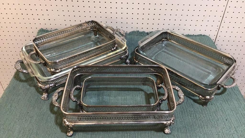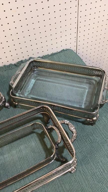 5 Silverplated Chafing Dish Bases, 2 Glass Inserts