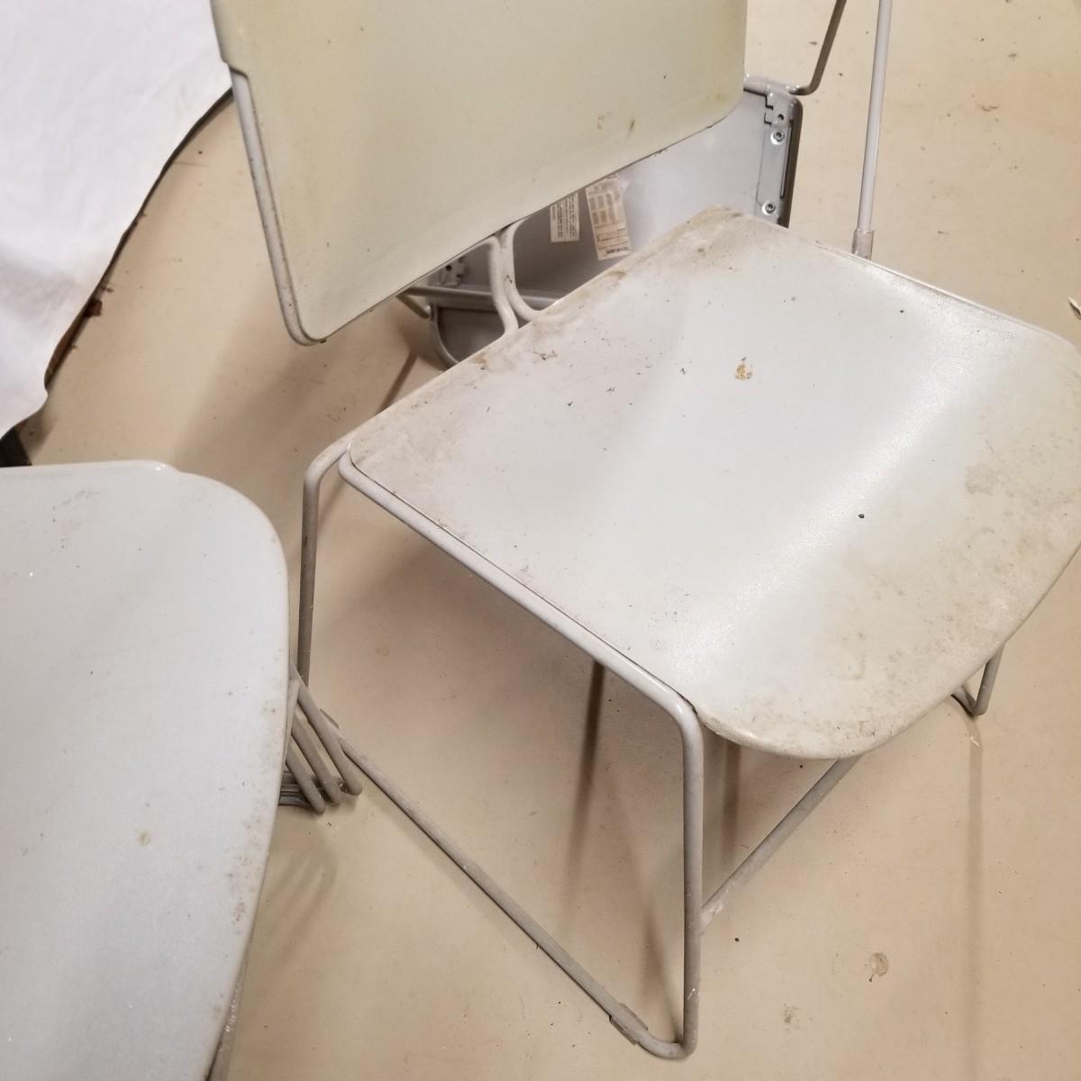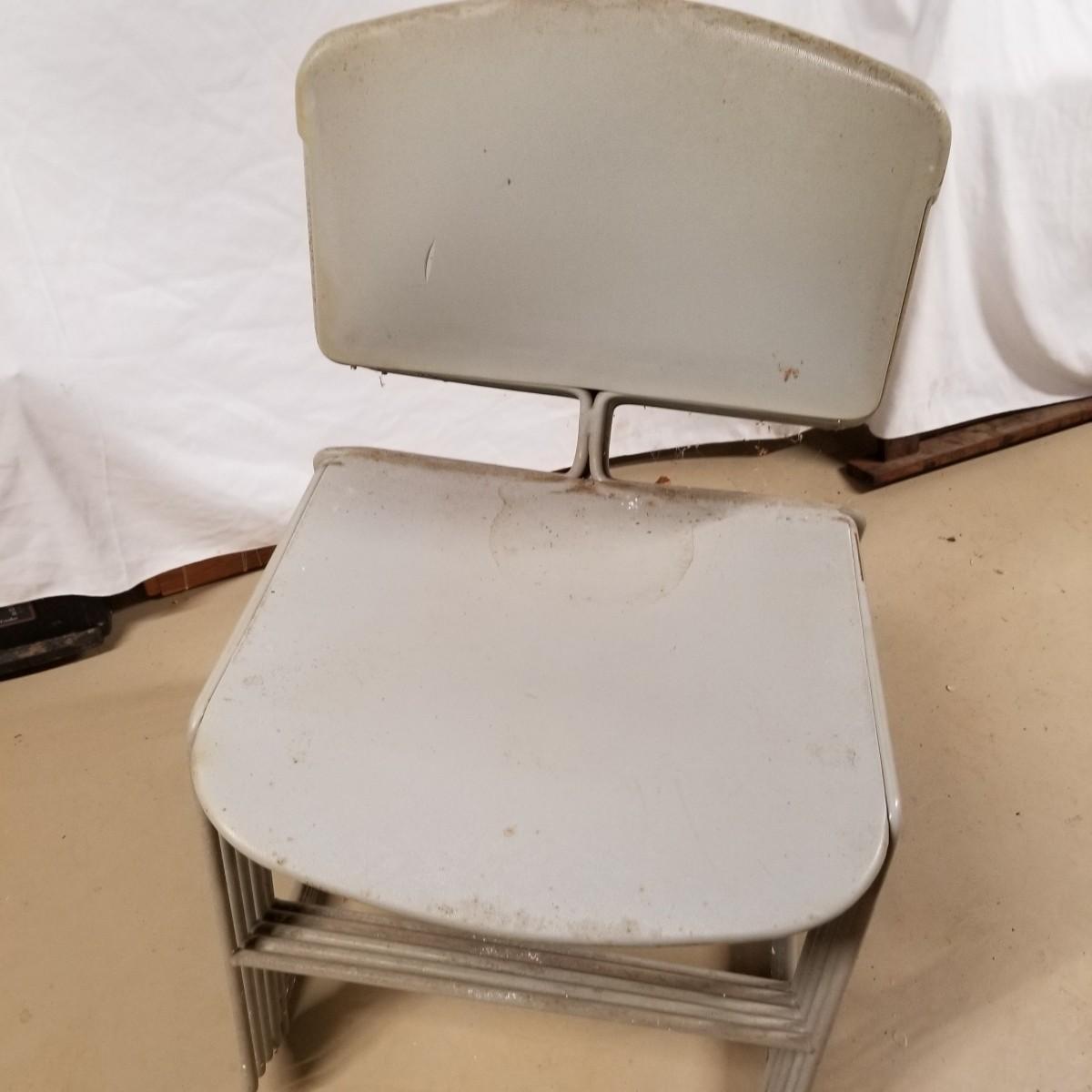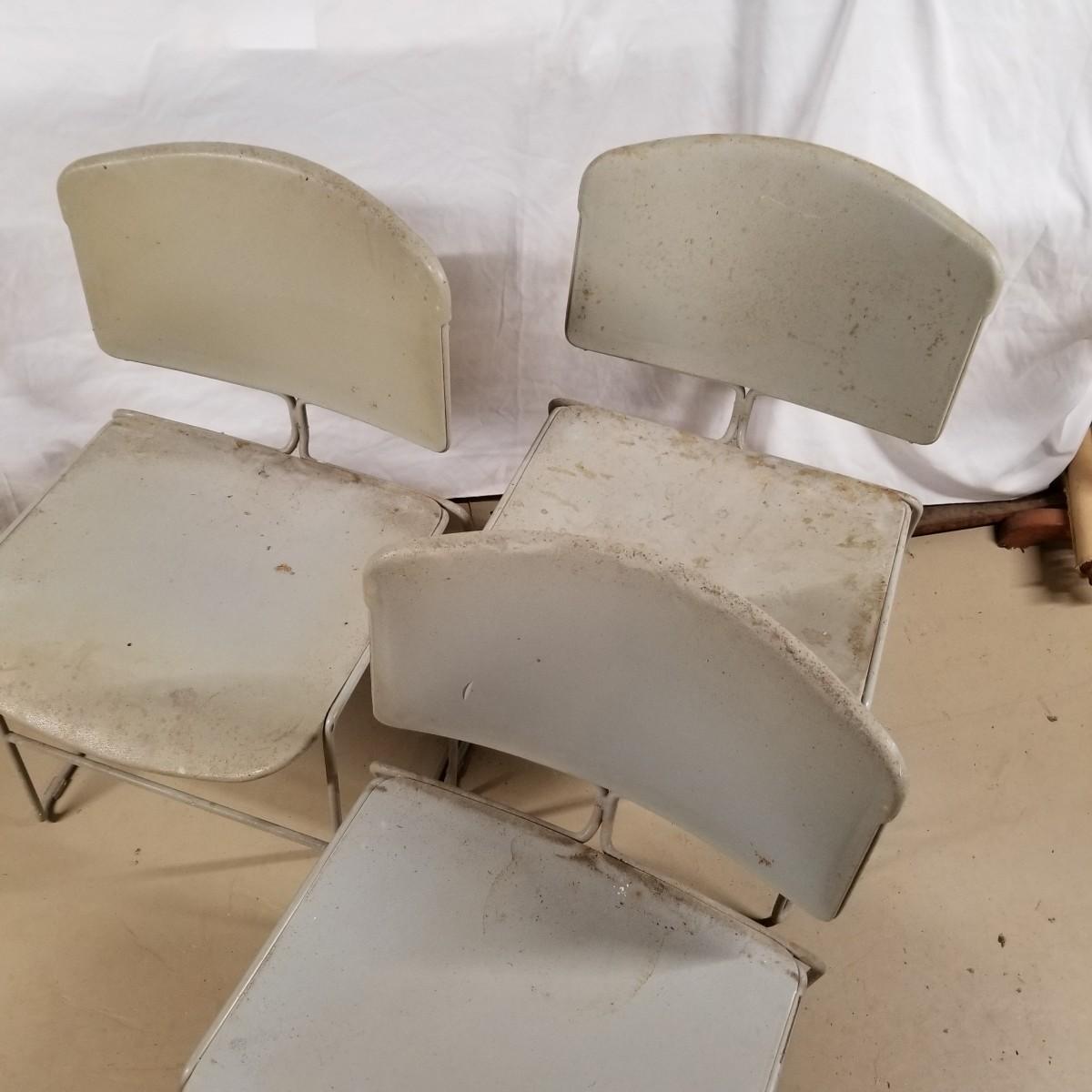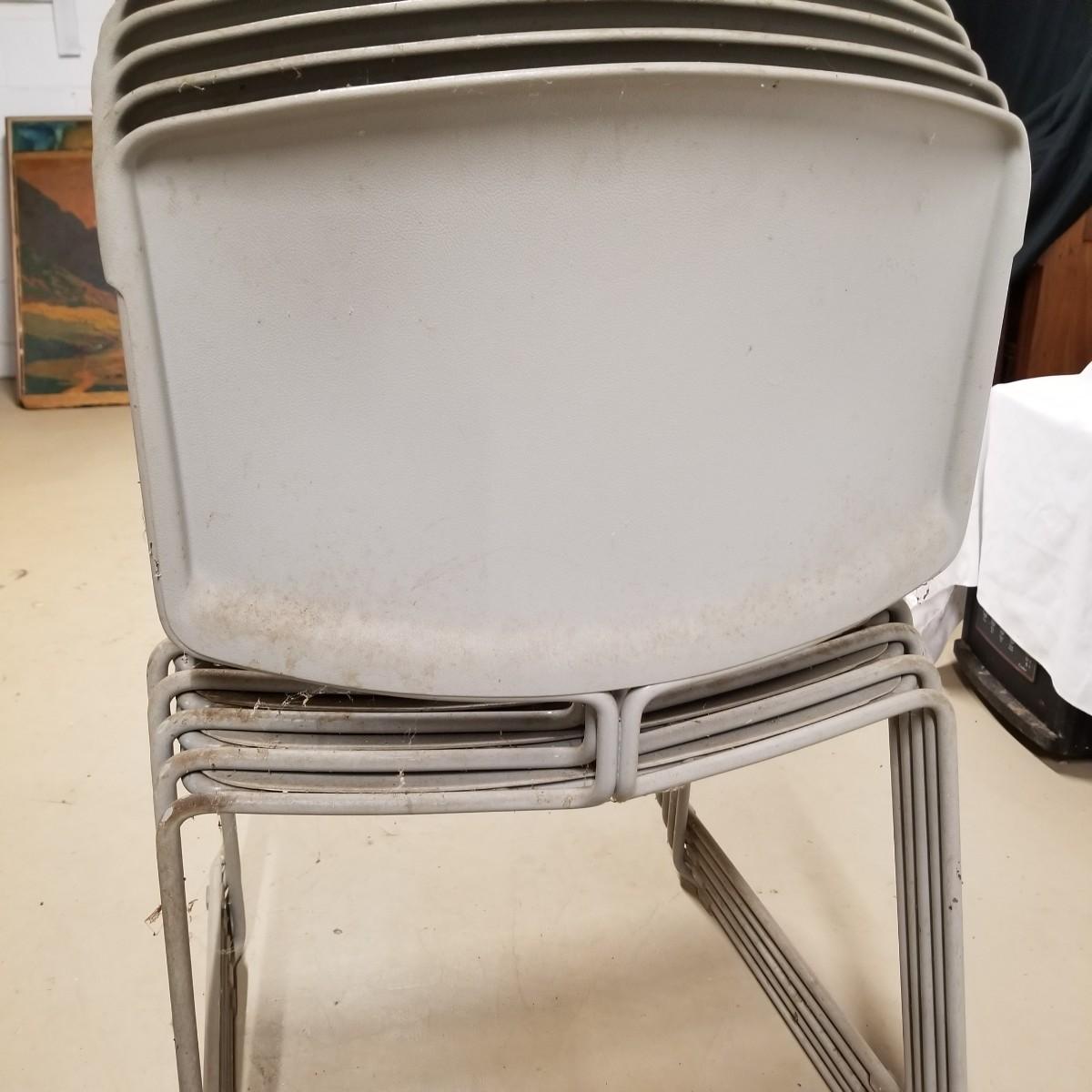 Steelcase wireframe stacking chairs with hard plastic backs and seats, model 427410. Foot pads on bottom rails. Individual chair is 18 1/2" x18" x30", seat height is 18". Stack of five chairs is 34" h. In good shape but needs some TLC cleaning. Local pickup only.