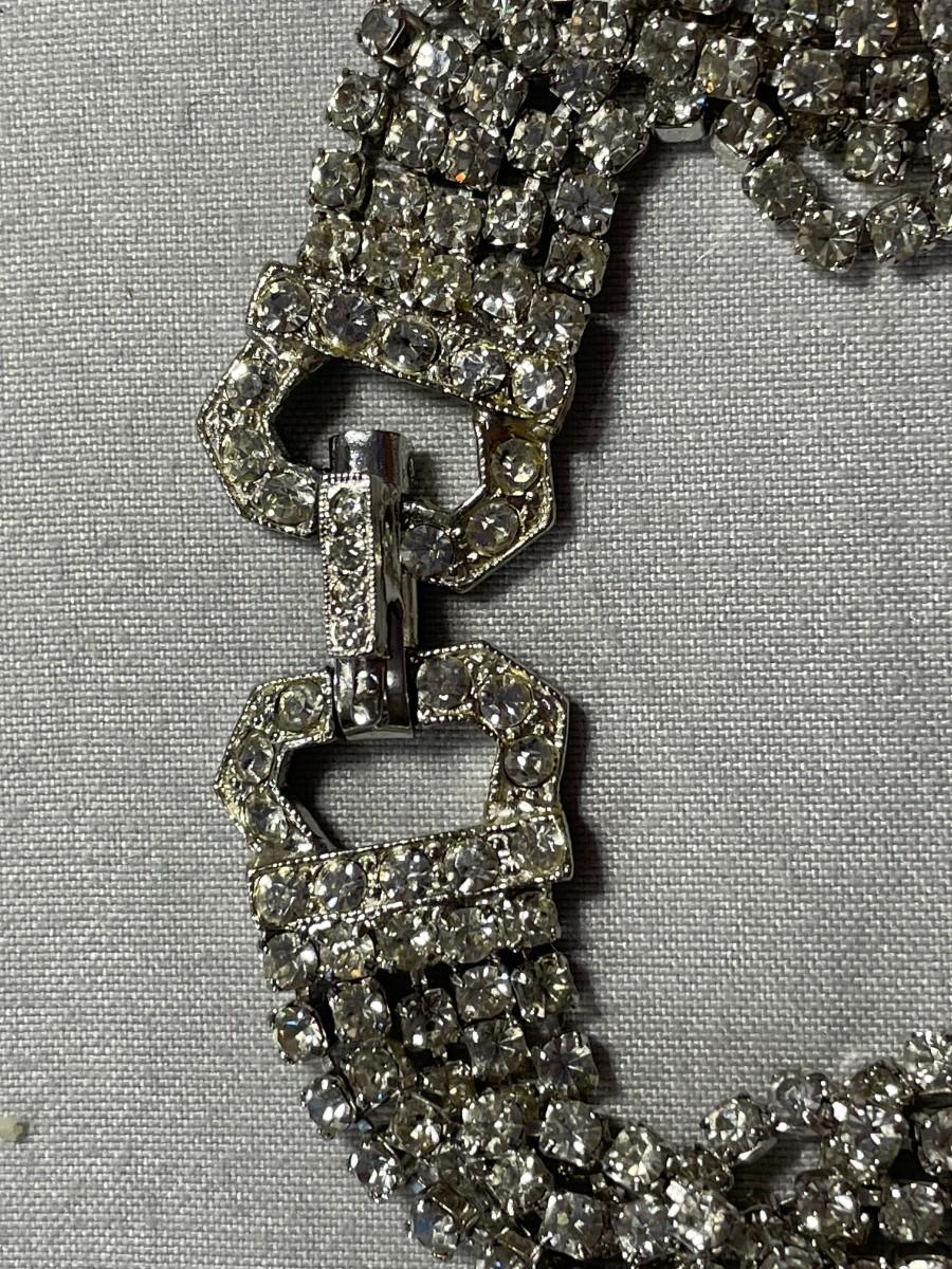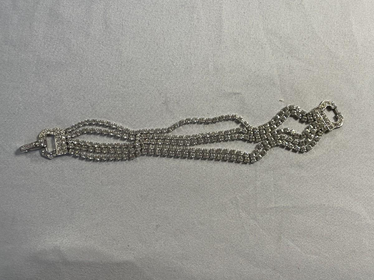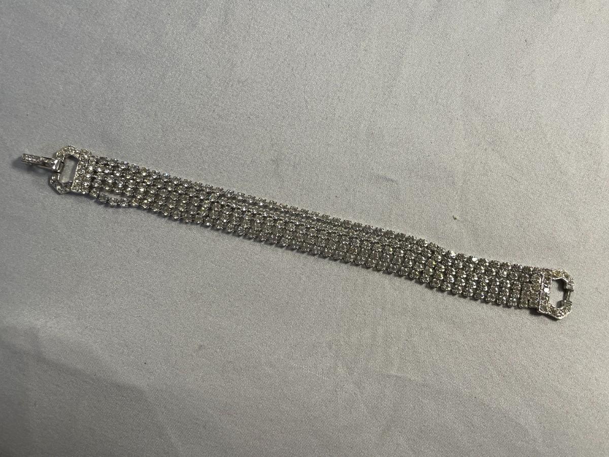 This bracelet is full of bling. It has five strands that are fused in two places so that the strands overall stay together and the clasp has been embellished with more matching rhinestones. It is about 7.25 inches long.