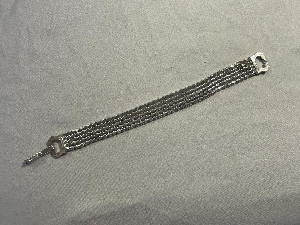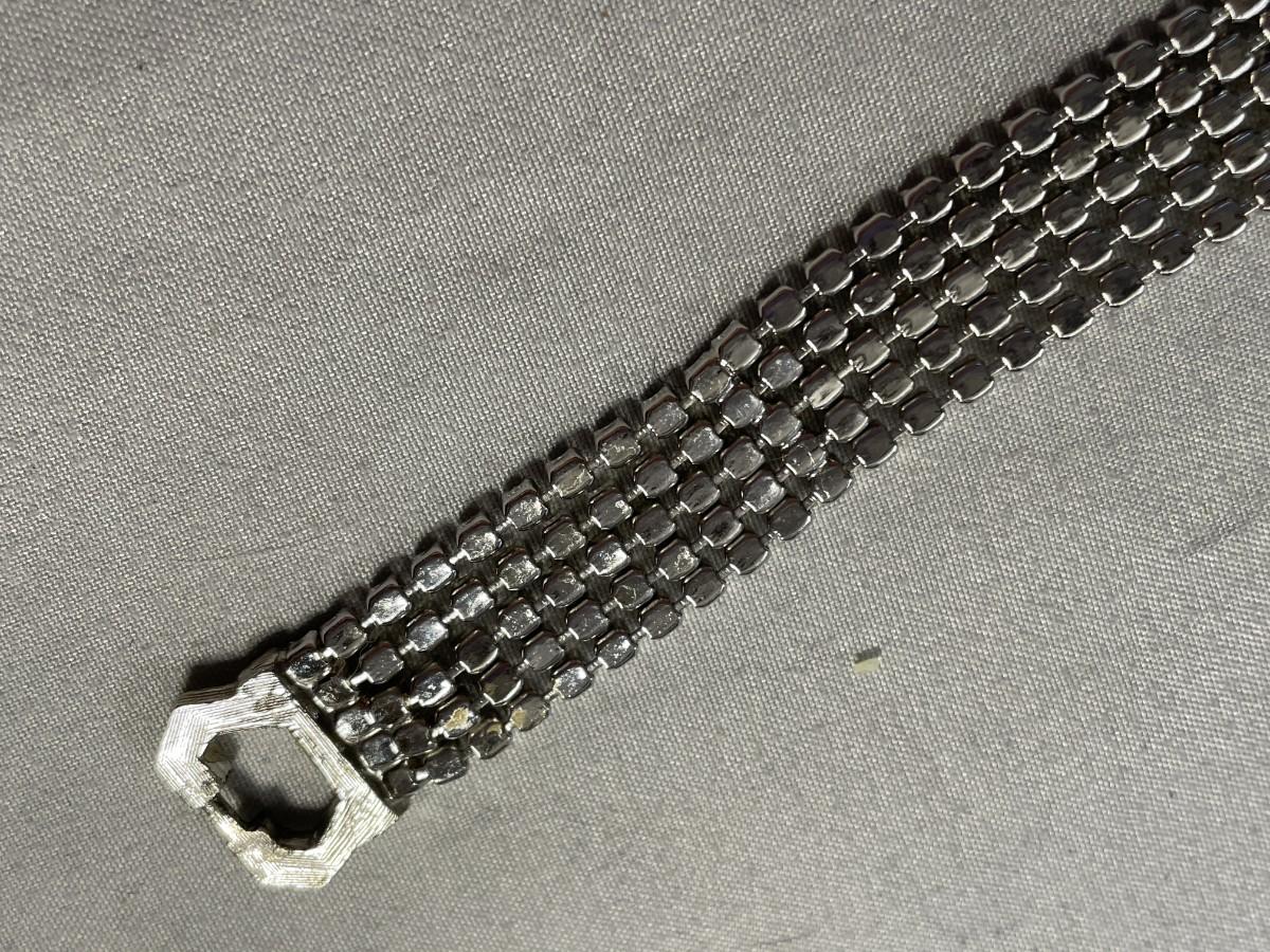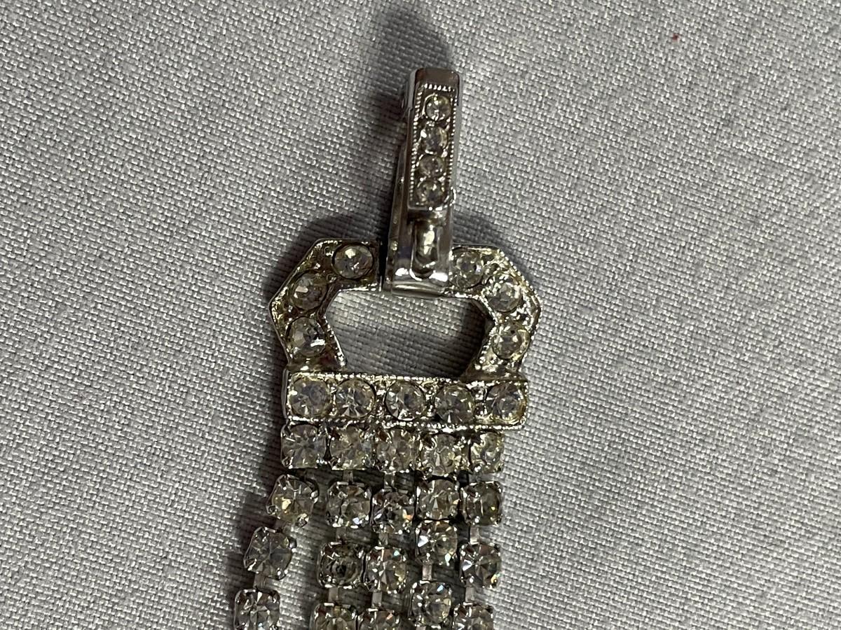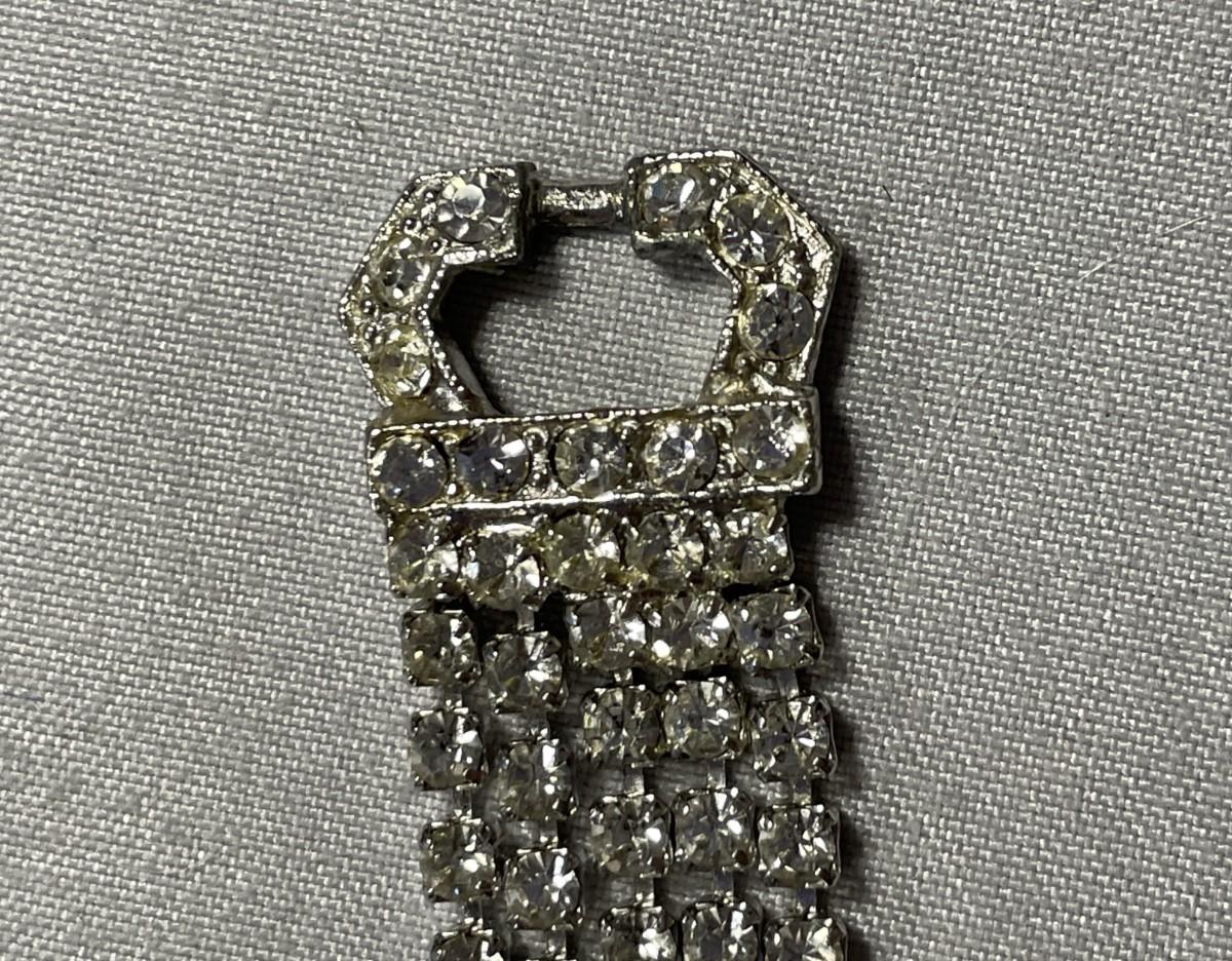 This bracelet is full of bling. It has five strands that are fused in two places so that the strands overall stay together and the clasp has been embellished with more matching rhinestones. It is about 7.25 inches long.