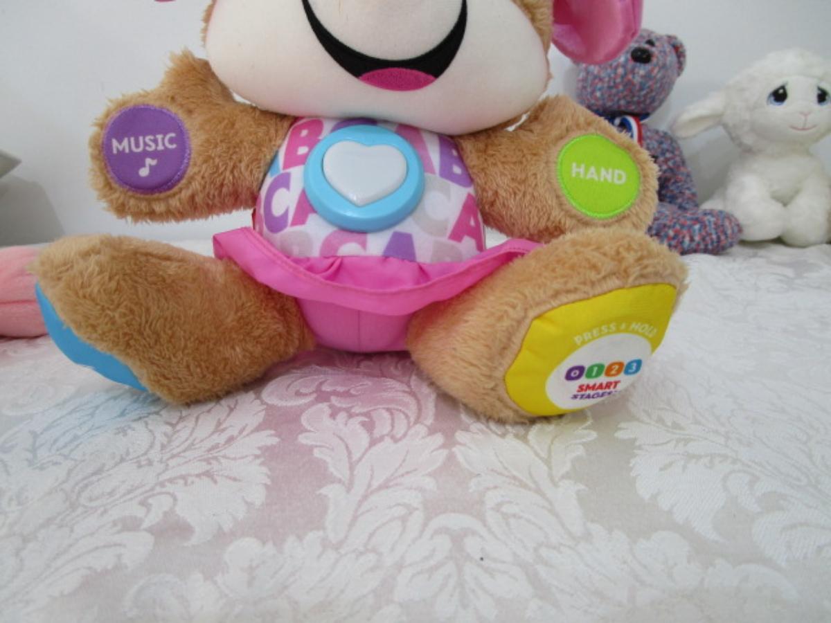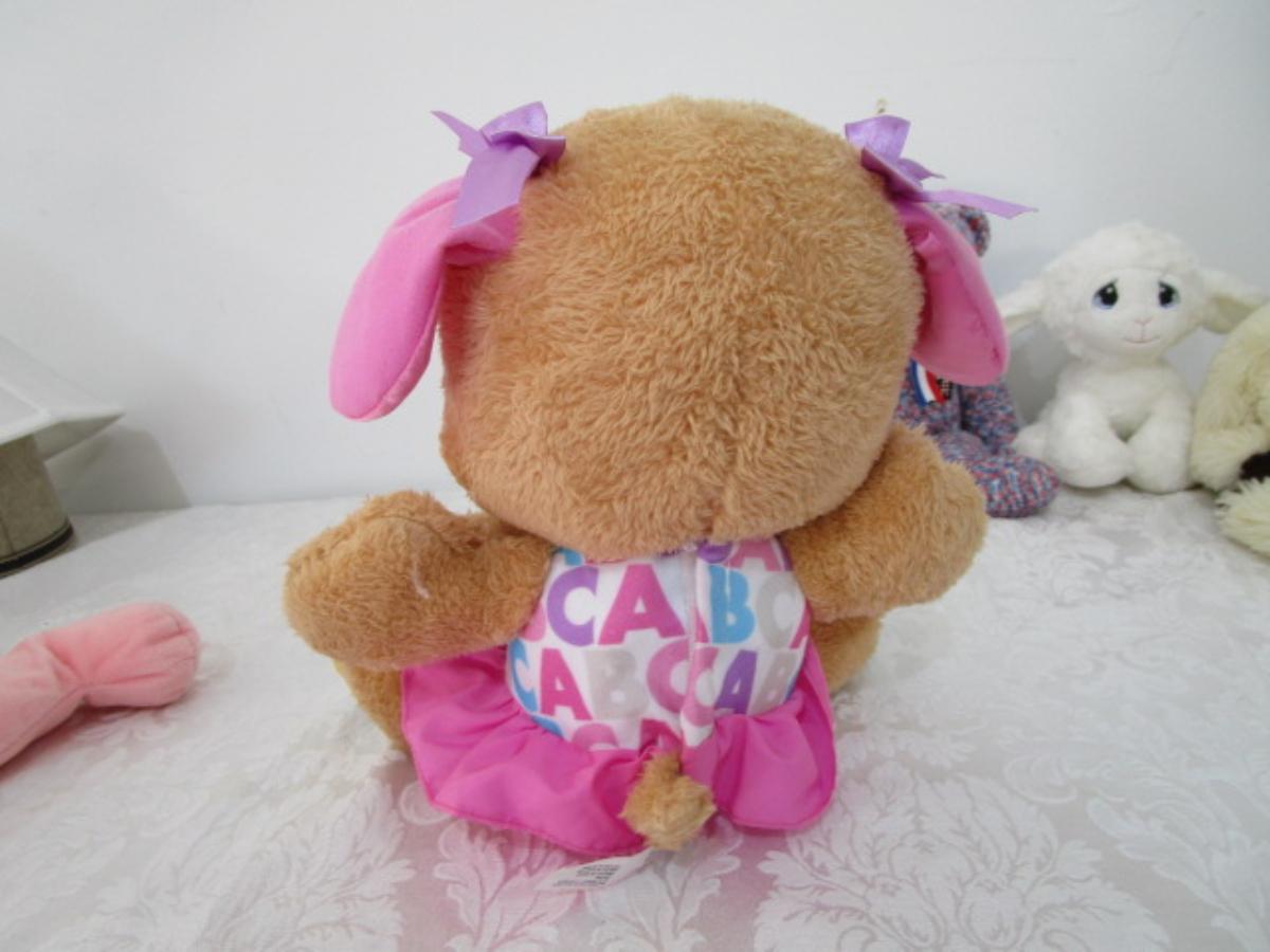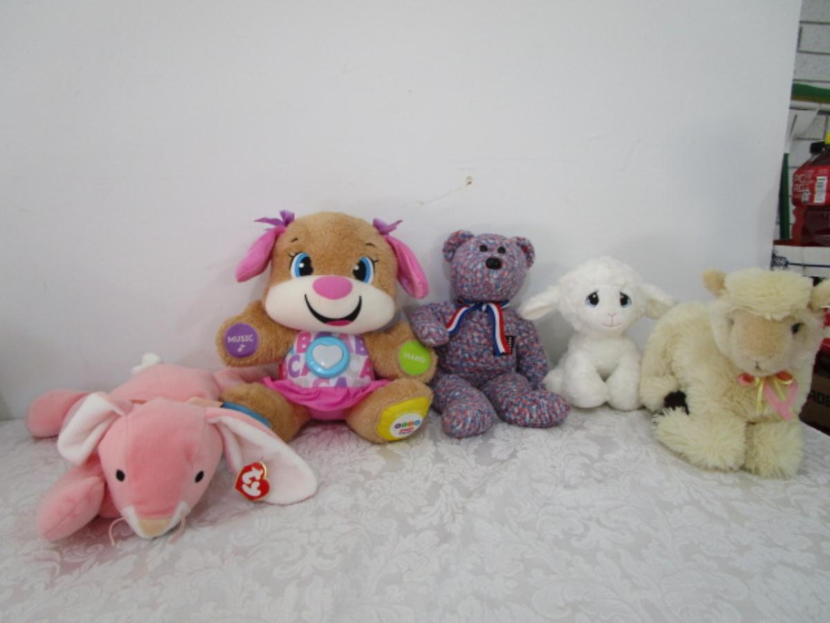 5 stuffed animals one of which is a Fisher Price learning bear