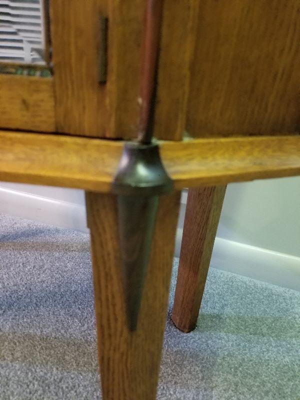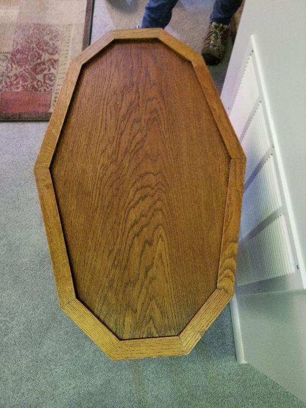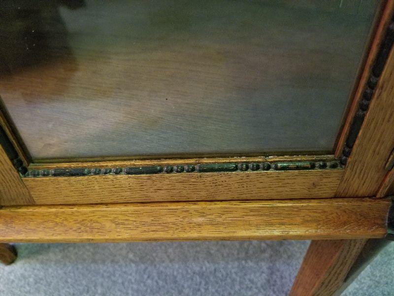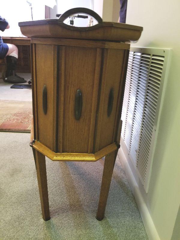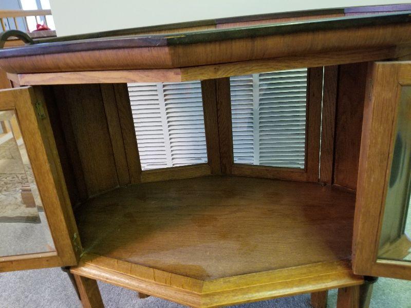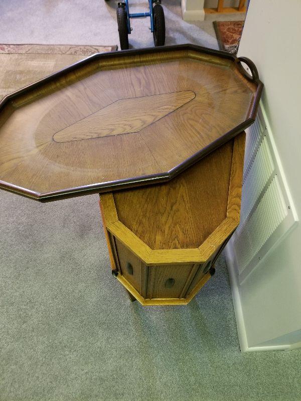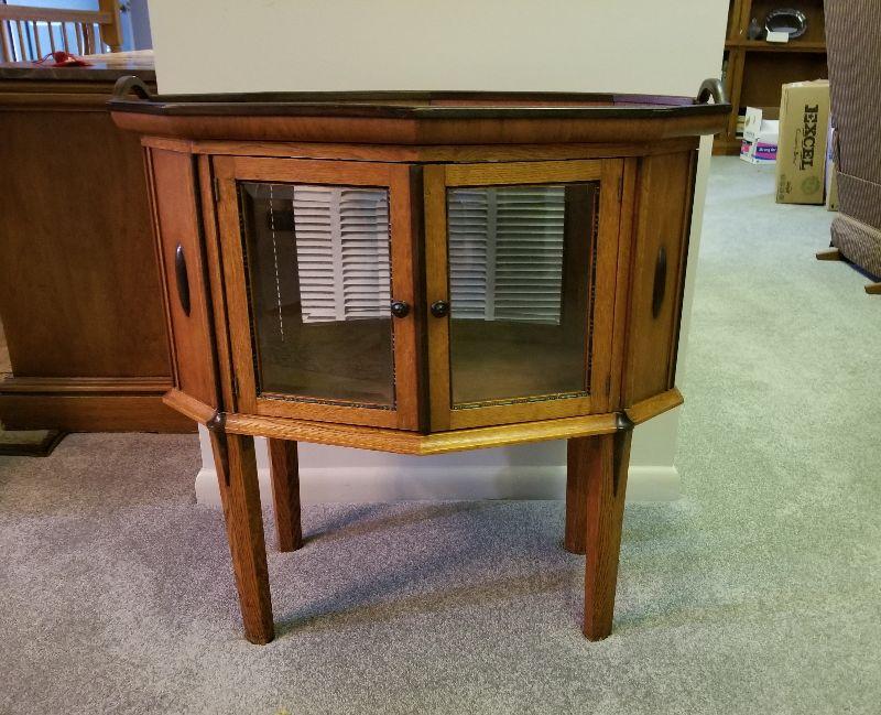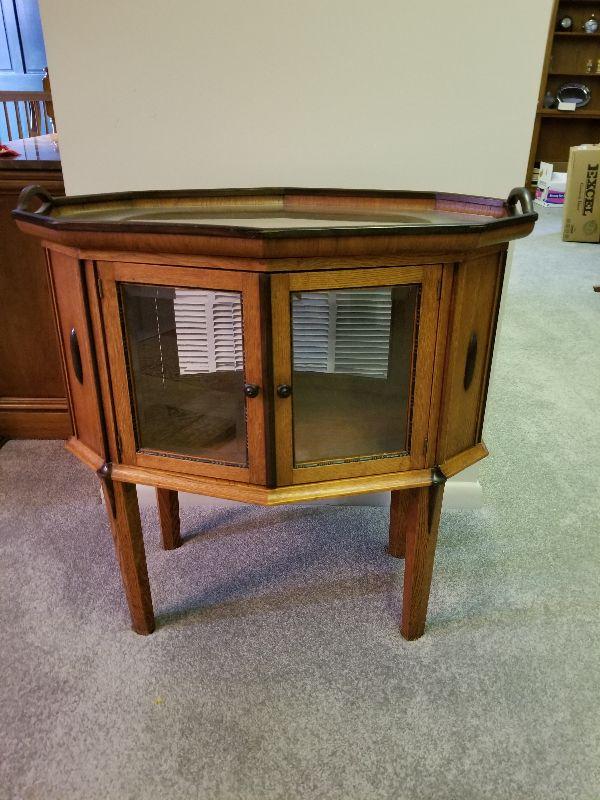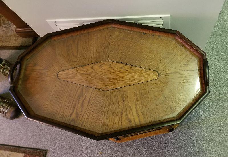 Glass top tea table includes a serving tray made to lay in the inset on top for stability. There are a couple of small blemishes from wear and transport over the years. The tray has some blemishes from use that add to the character or they could be refinished. Measurements are 29"x18.5"x28"