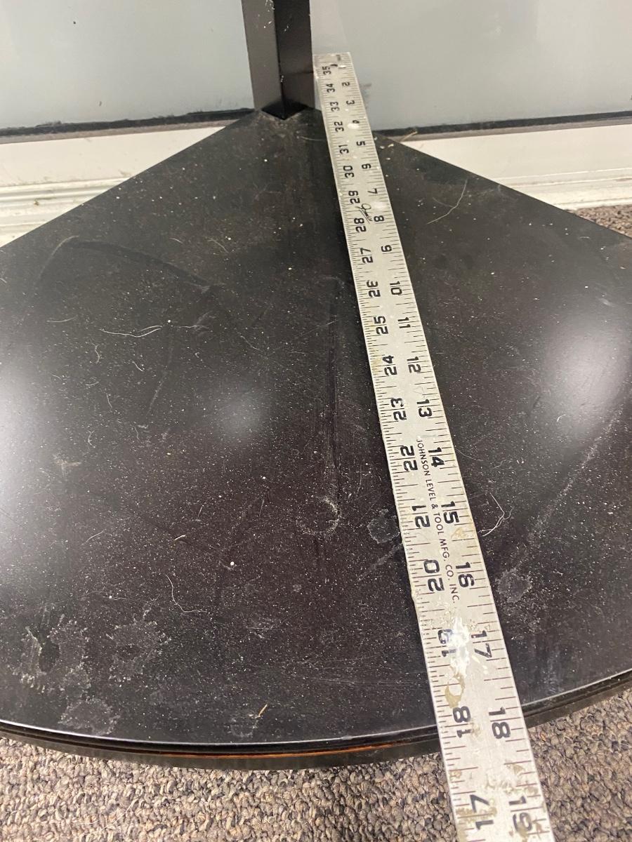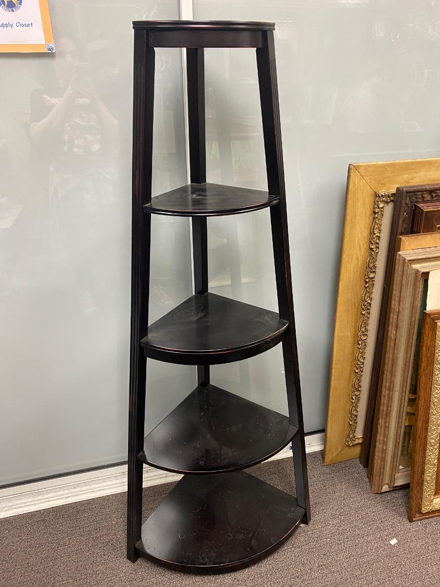 5 Tier Wood Corner Shelf. About 18" from corner to front on lowest shelf. Some light signs of use to the shelf surfaces. About 5' tall.