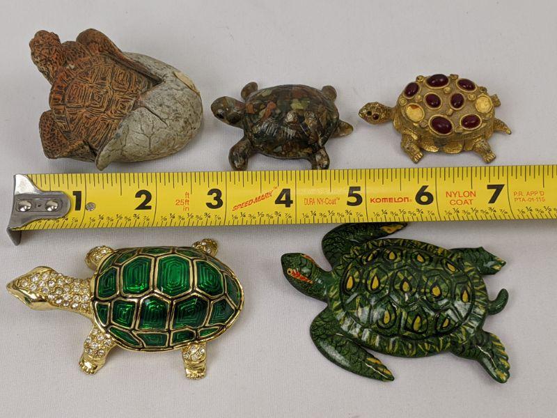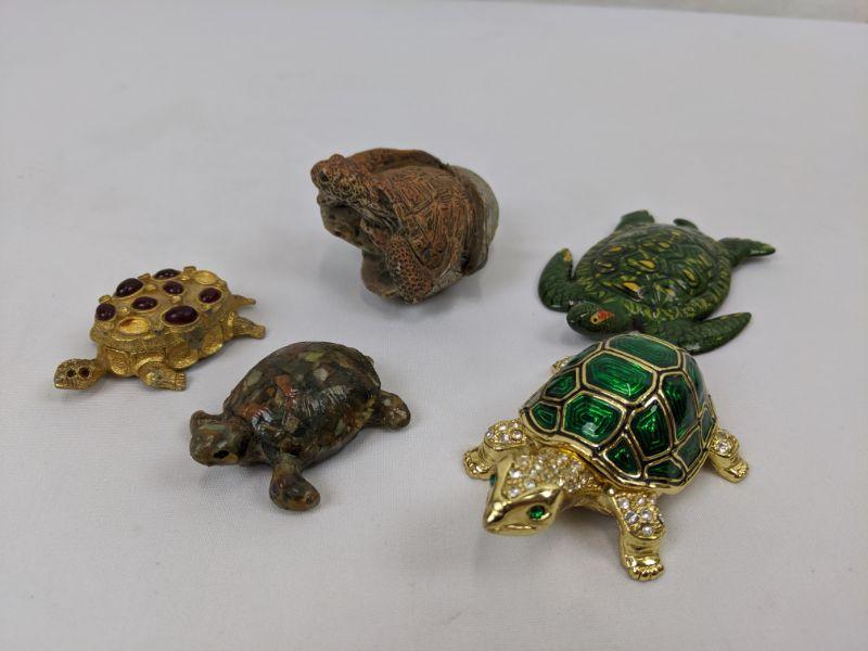 5 Turtles & Tortoises - "Emerald"/"Diamond" Box, "Ruby" Box (Missing 2 Rubies), Green Ceramic, Multi-Color Rock, and Hard Plastic Coming Out of Egg