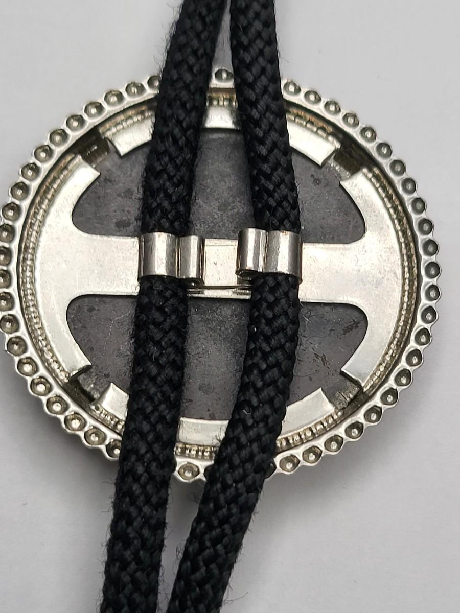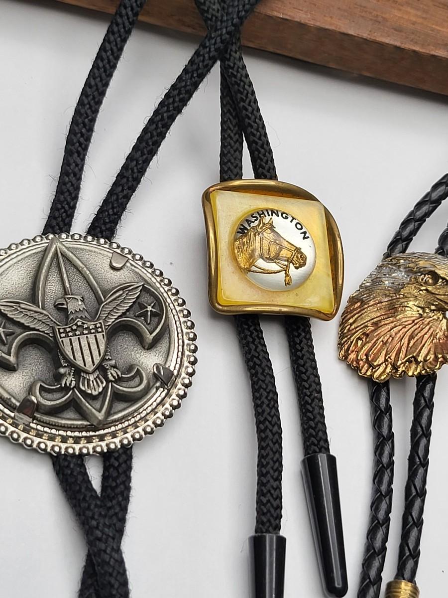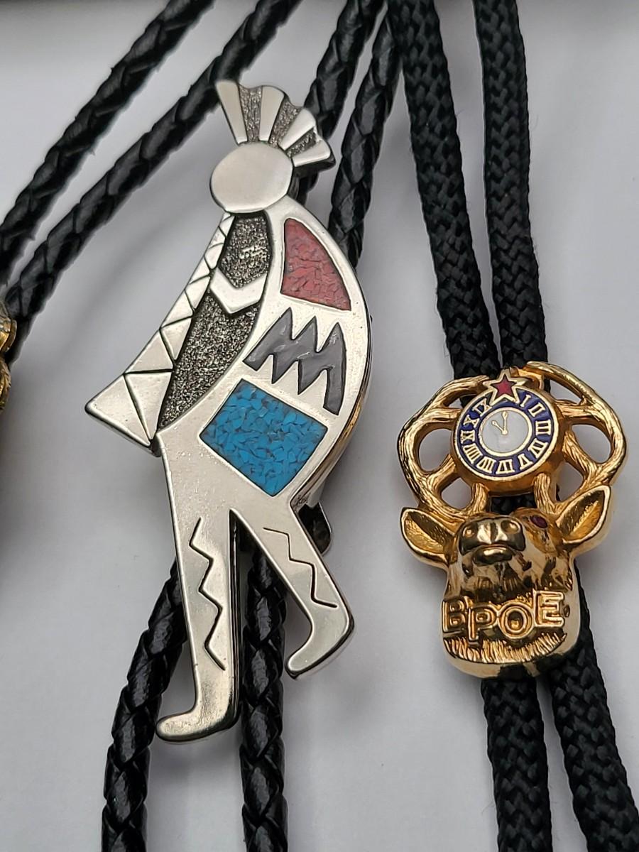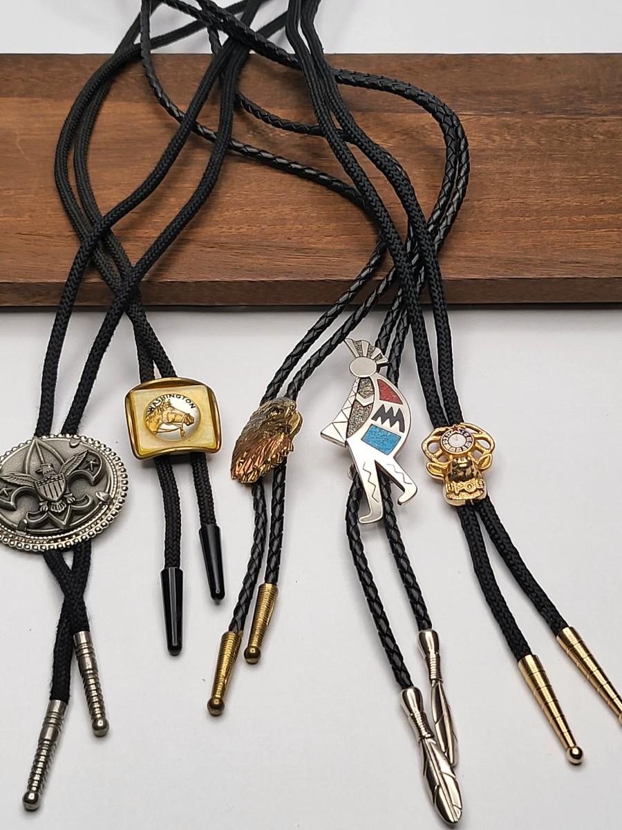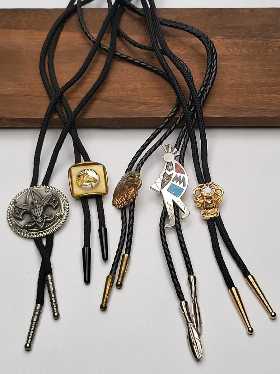 Lot of five, braided leather and silk cord, various vintage bolo ties.