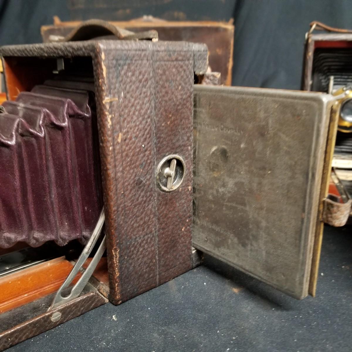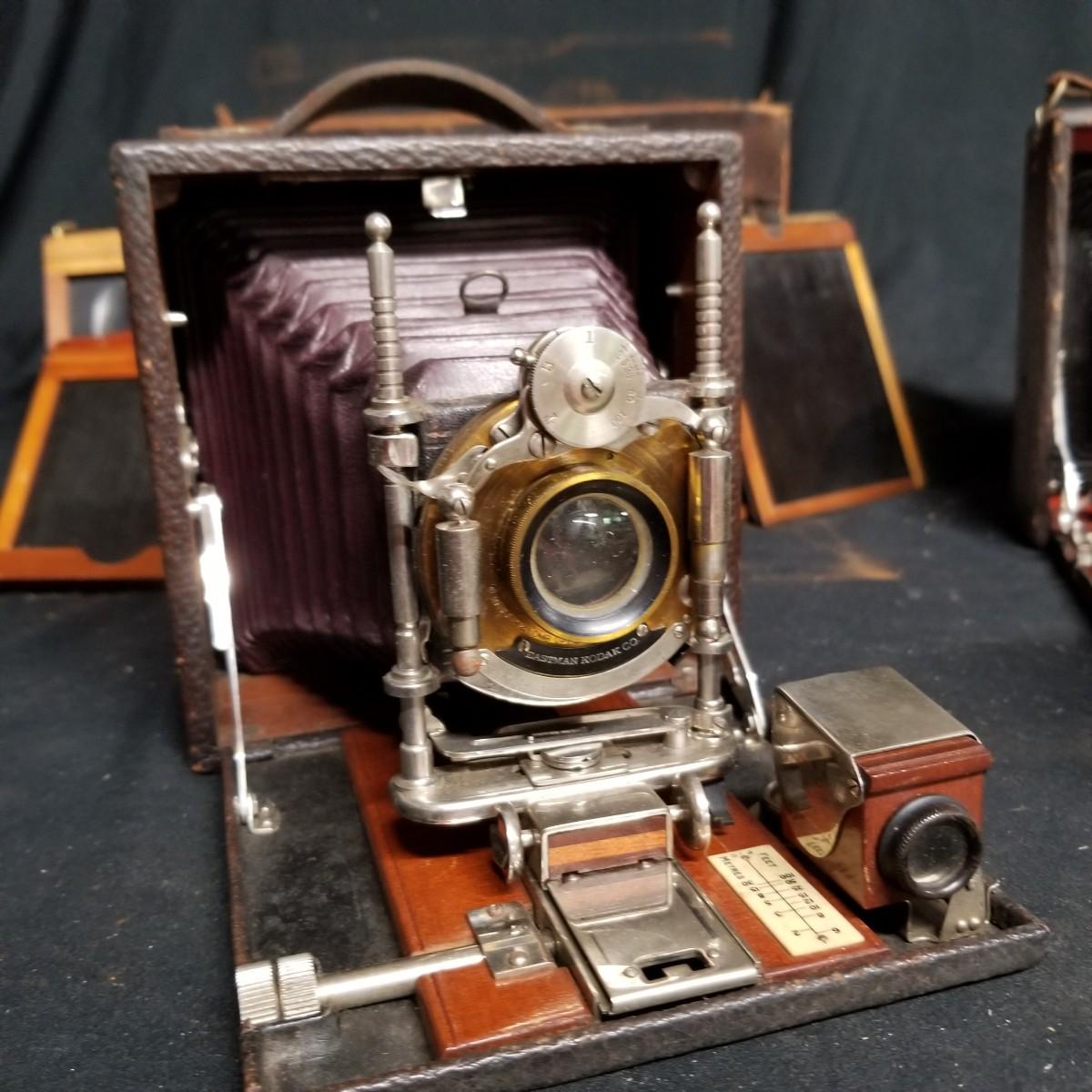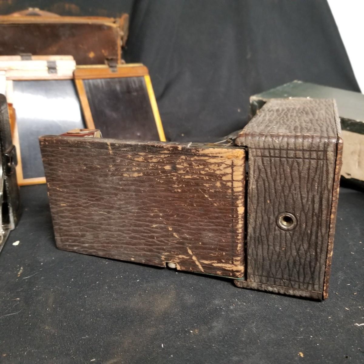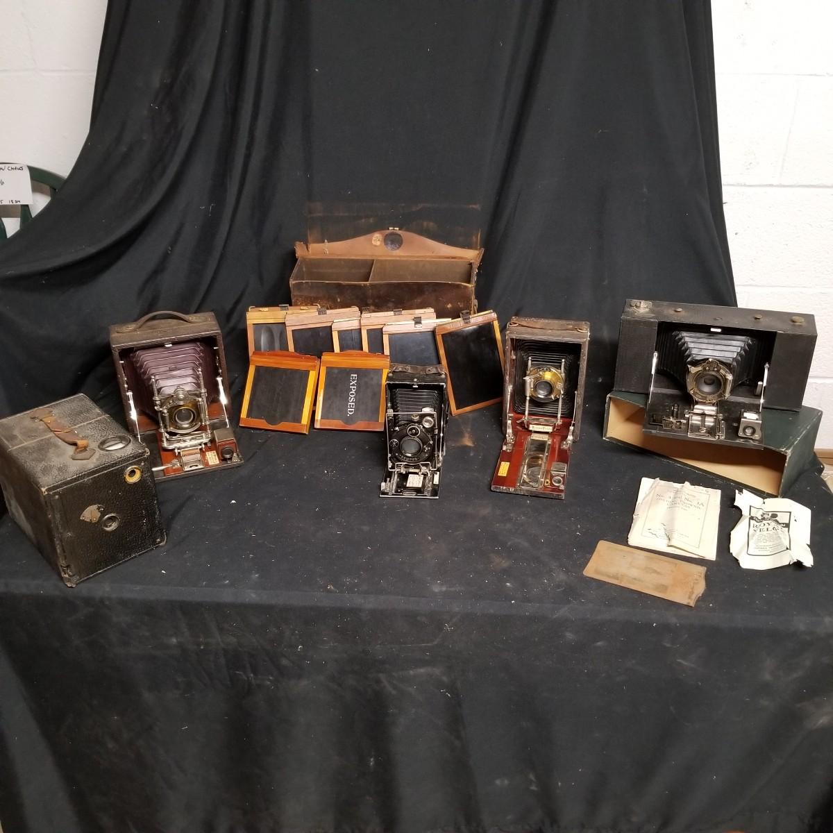 A collection of five vintage cameras, four view style and one box style.  Eastman Kodak, Korona Petit, others.  Also several sheet film holders and the original manual for a Kodak No. 3 Brownie camera.  Cameras in fair to good condition, not tested. See photos for details. Shipping available.