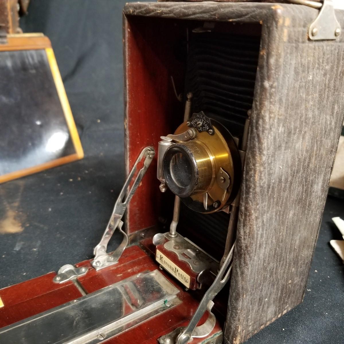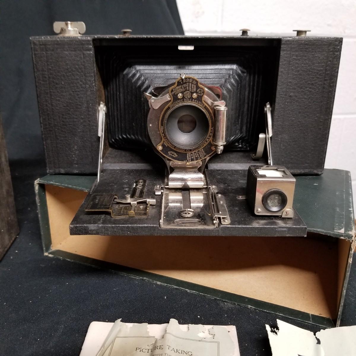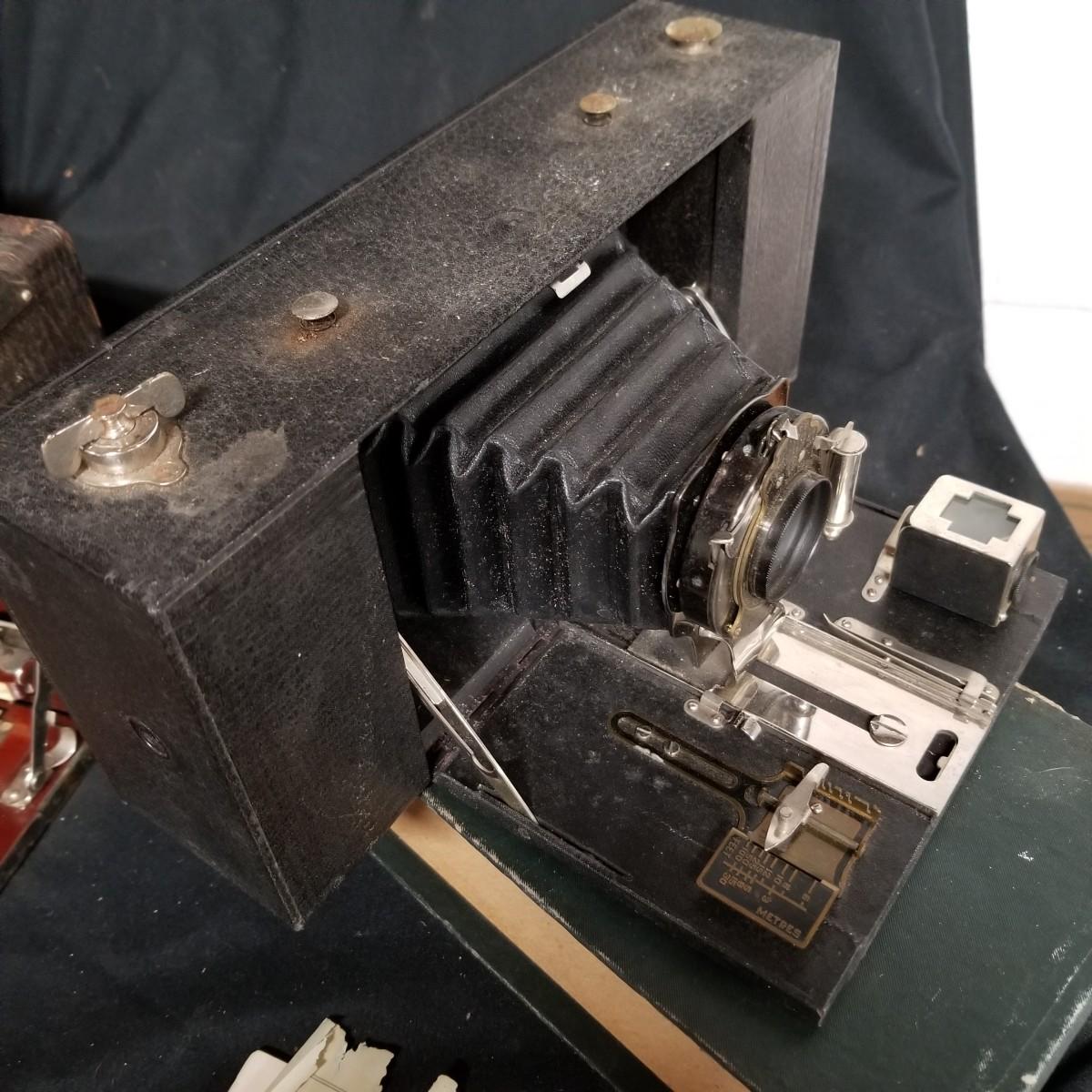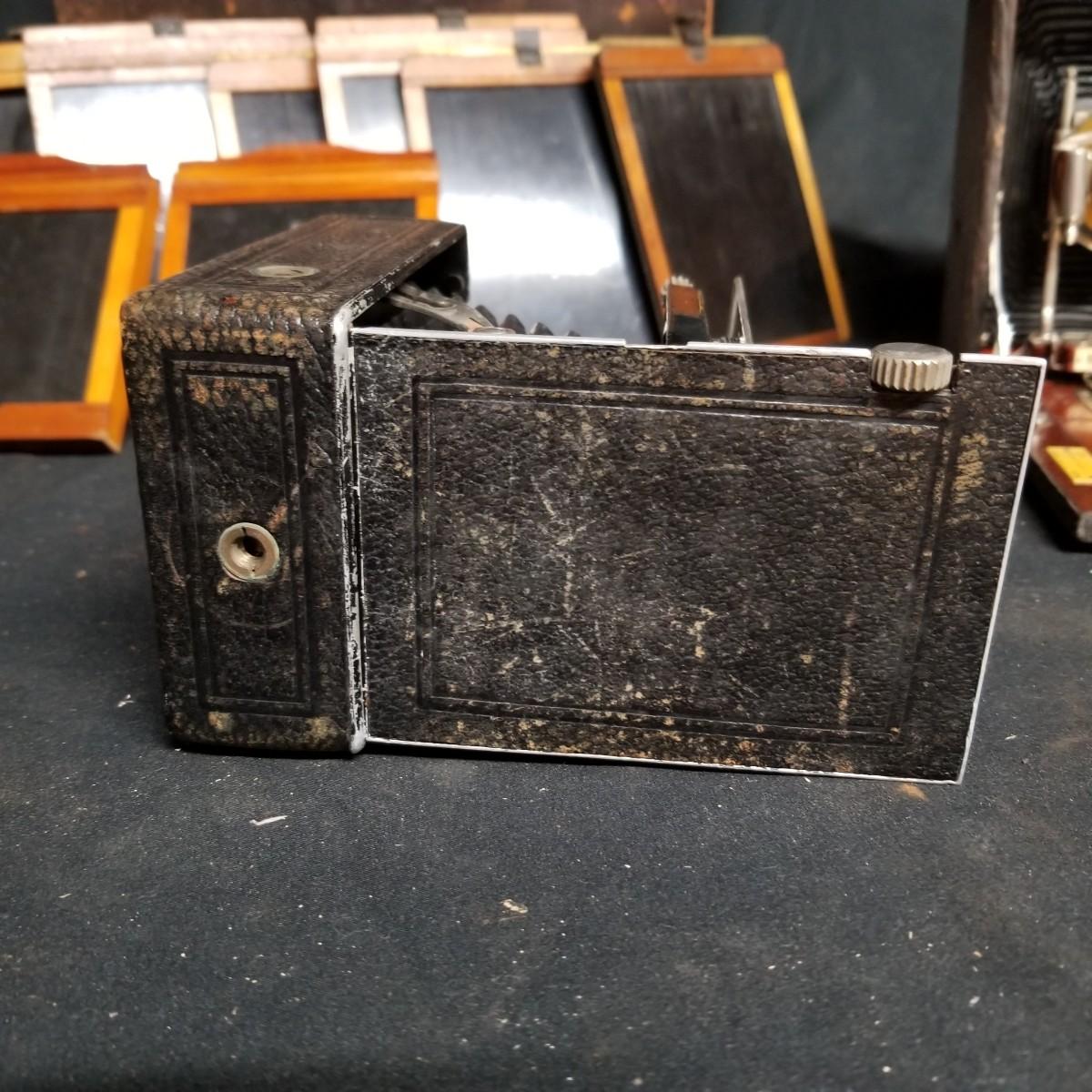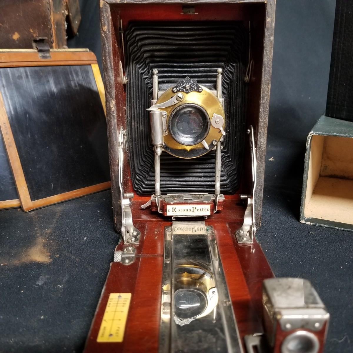 A collection of five vintage cameras, four view style and one box style.  Eastman Kodak, Korona Petit, others.  Also several sheet film holders and the original manual for a Kodak No. 3 Brownie camera.  Cameras in fair to good condition, not tested. See photos for details. Shipping available.