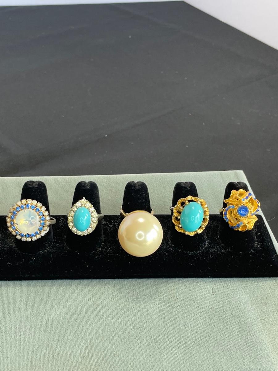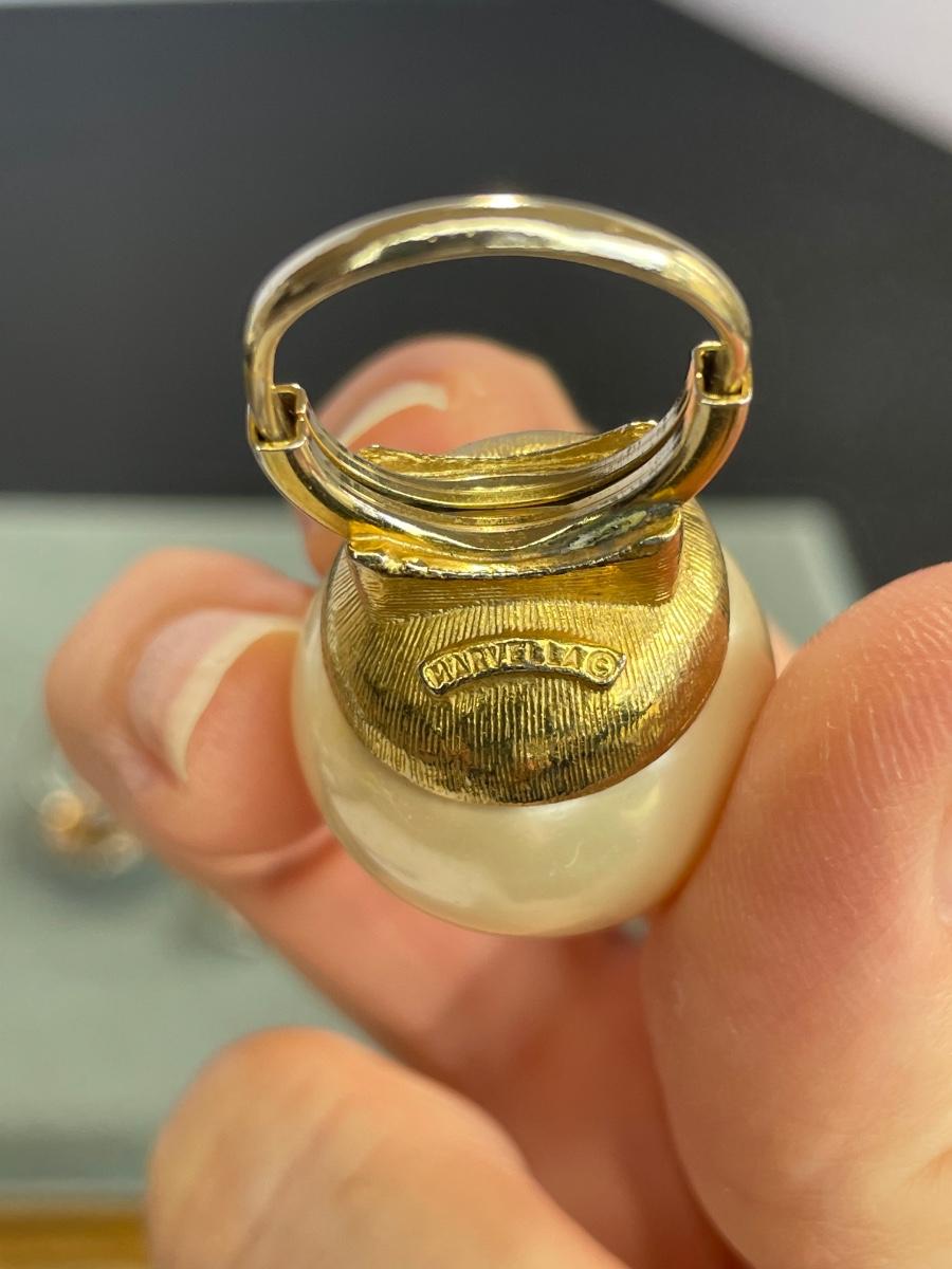 Huge faux pearl ring is signed Marvella. Most rings are adjustable