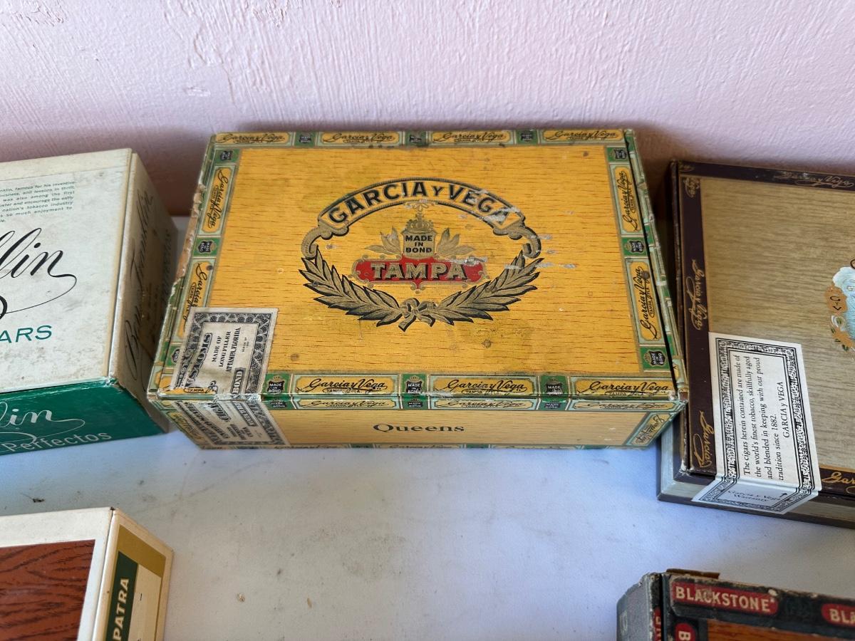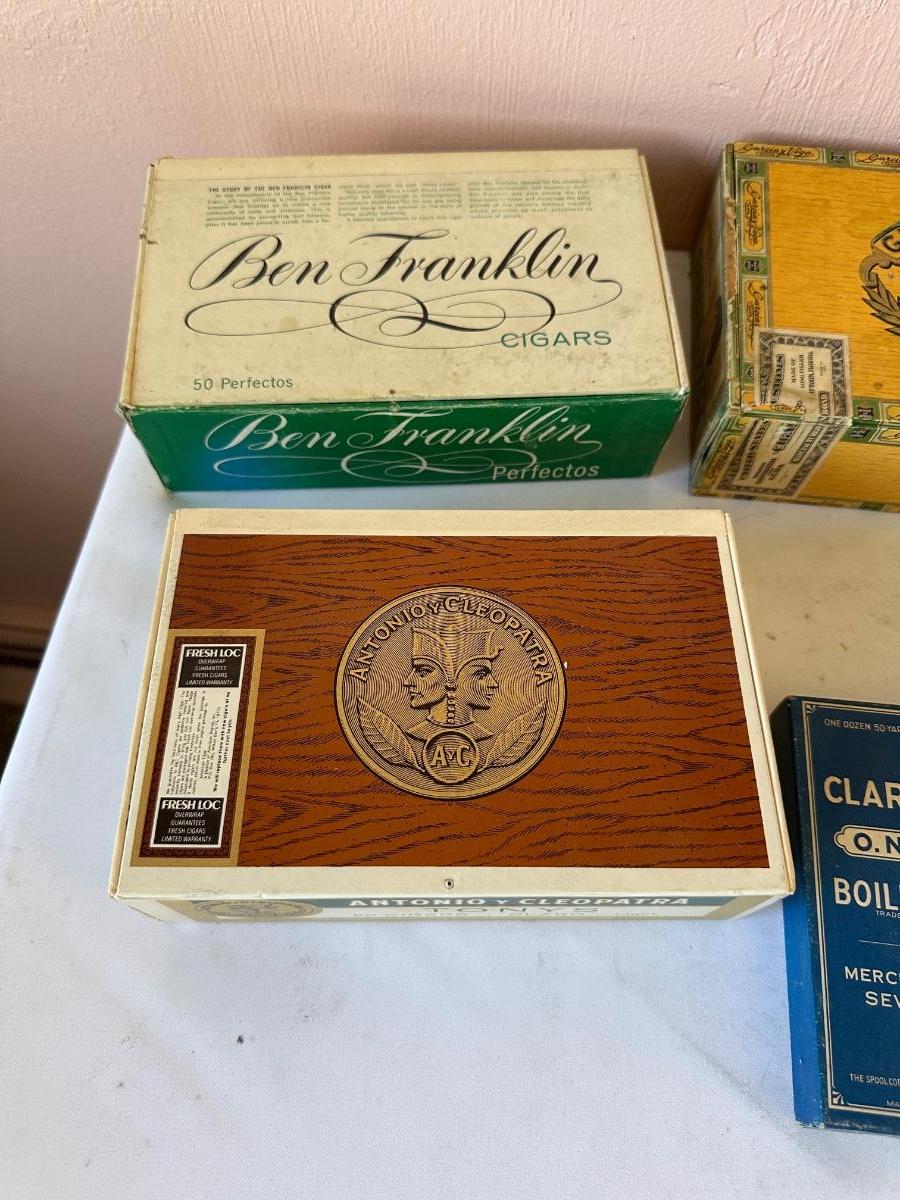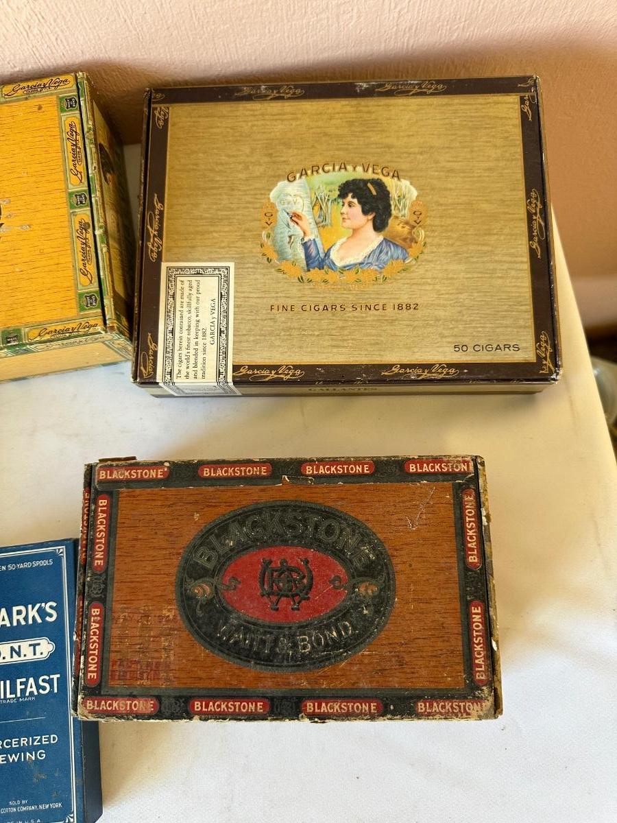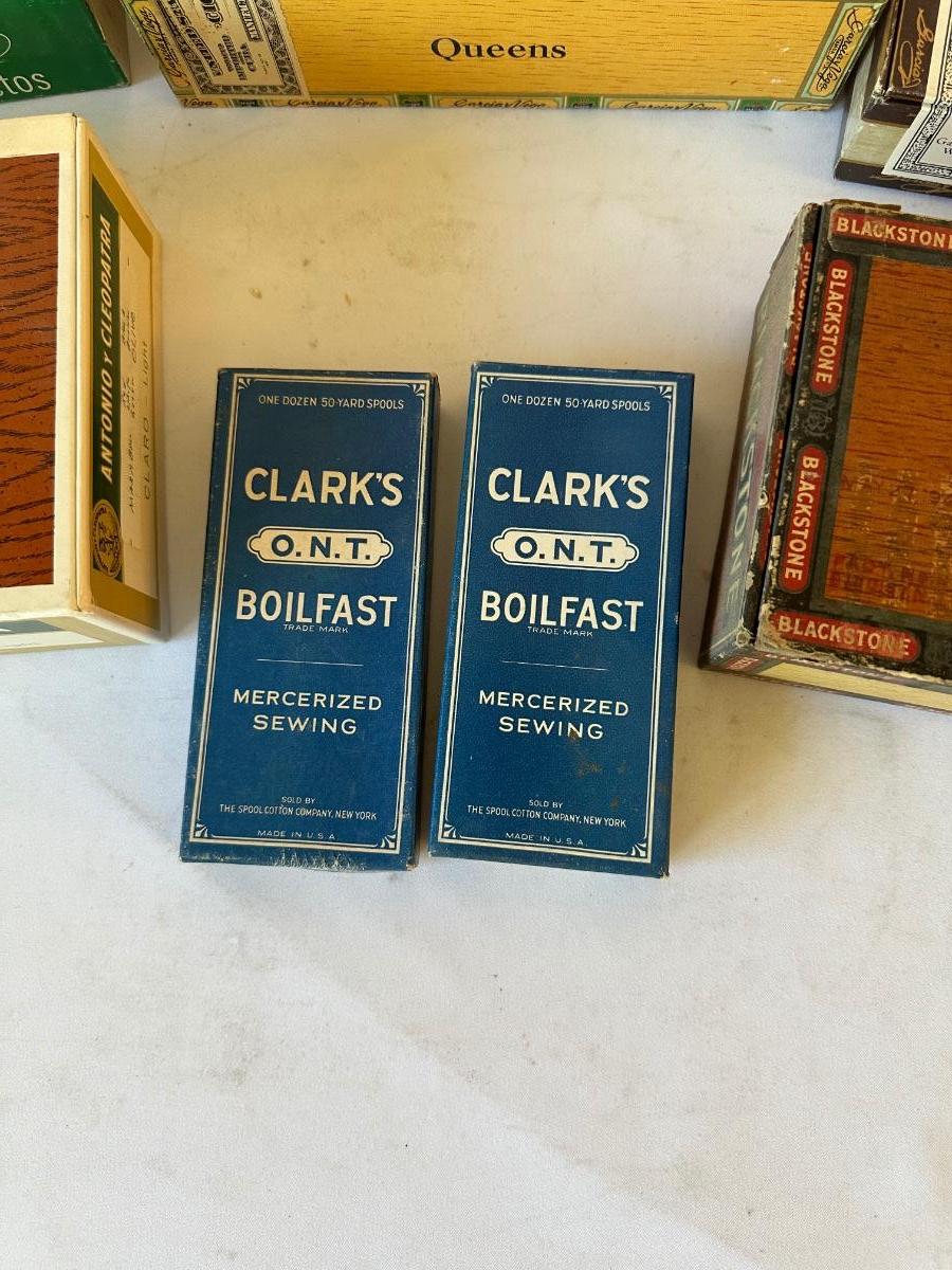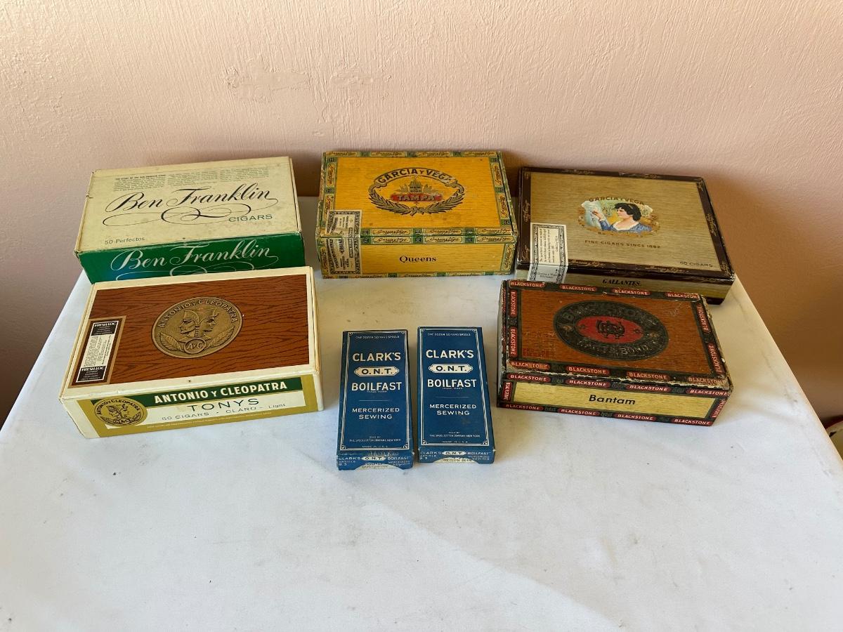 5 VINTAGE CIGAR BOXES AND 2 VINTAGE CLARK’S THREAD BOXES