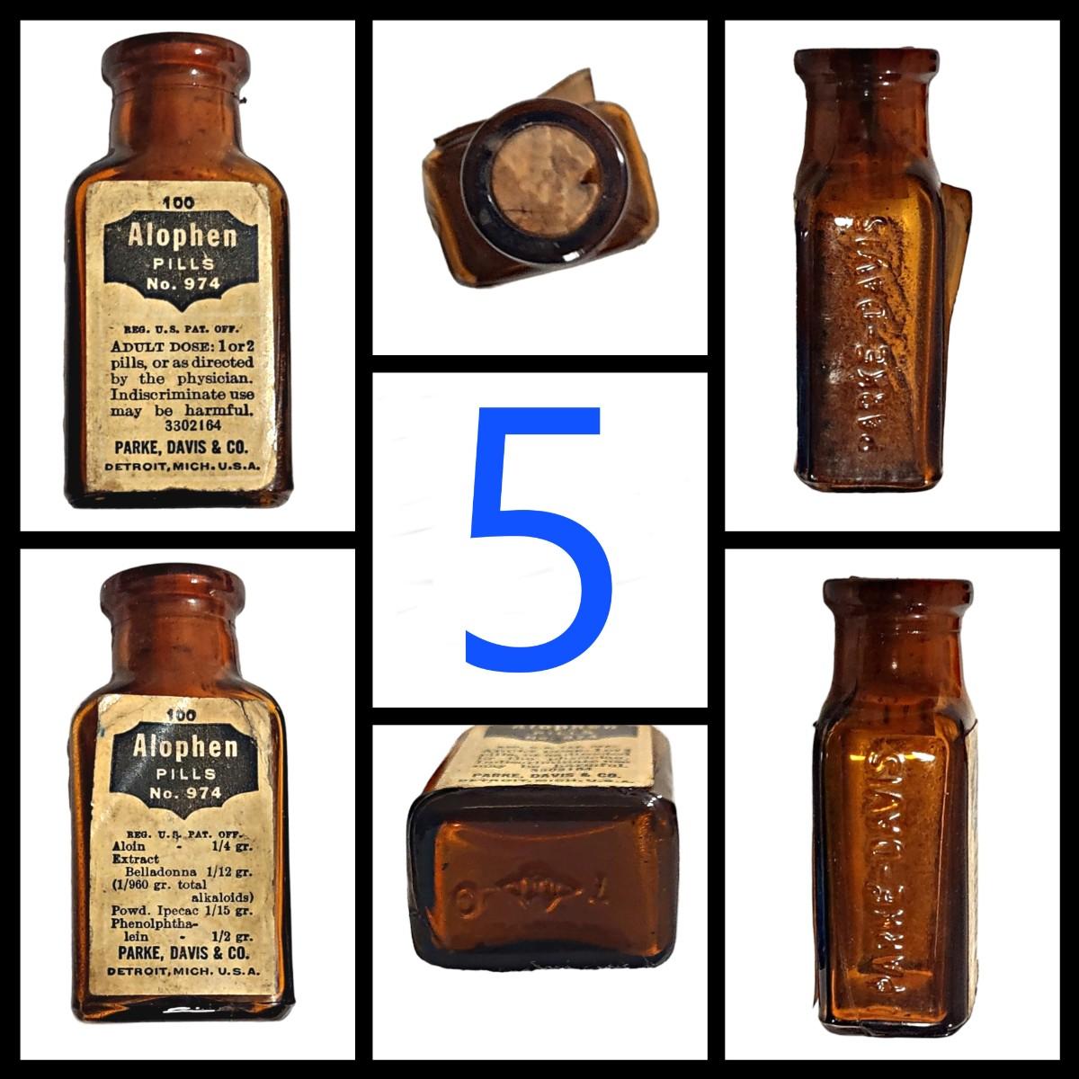 5. Antique Amber Glass Cork Top Bottle w/ Original Cork Intact & Labeled "100 Alophen PILLS No. 974" & "PARKE, DAVIS &