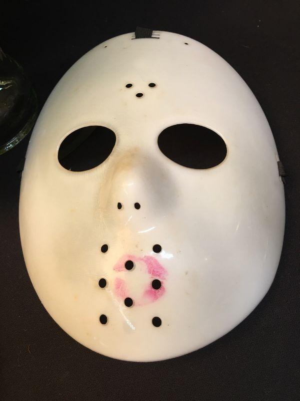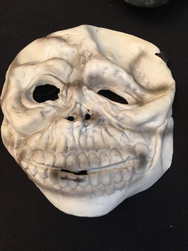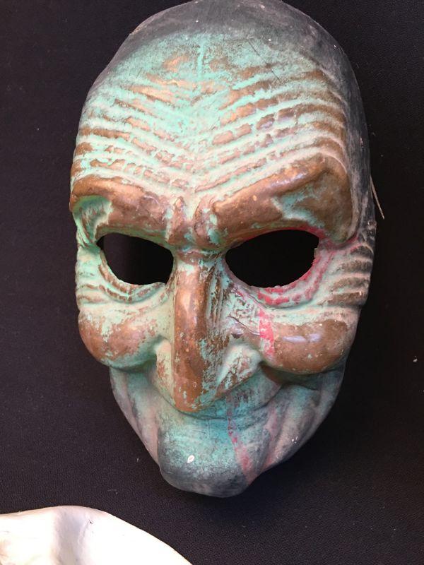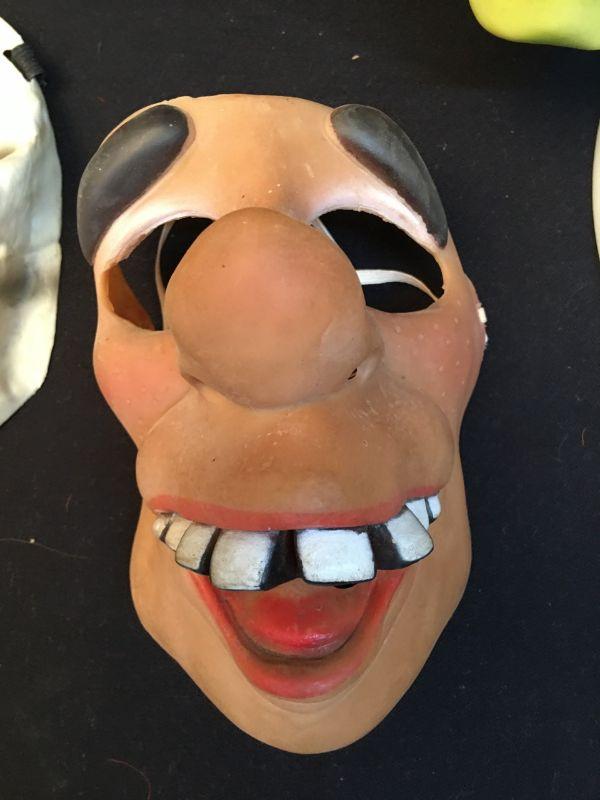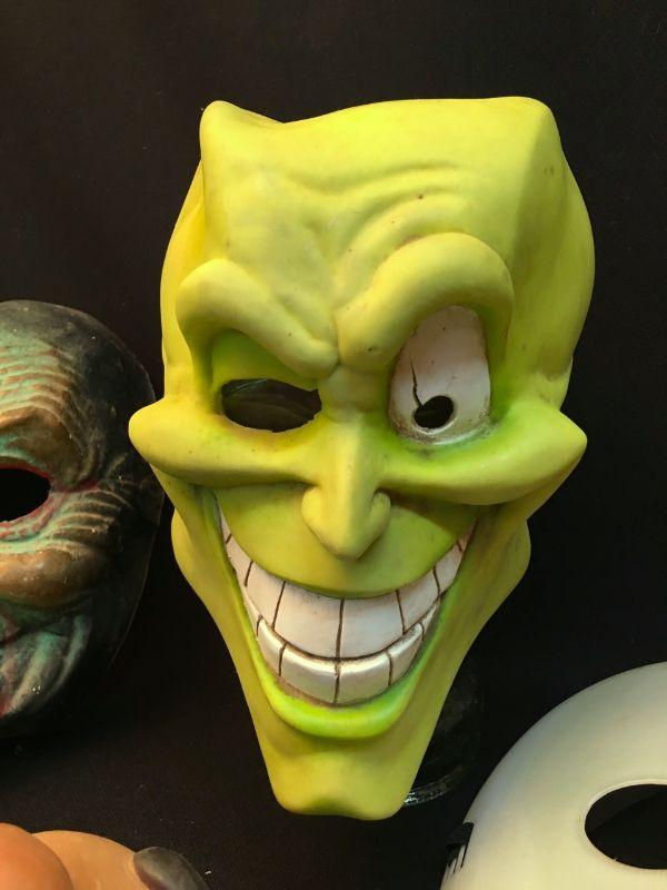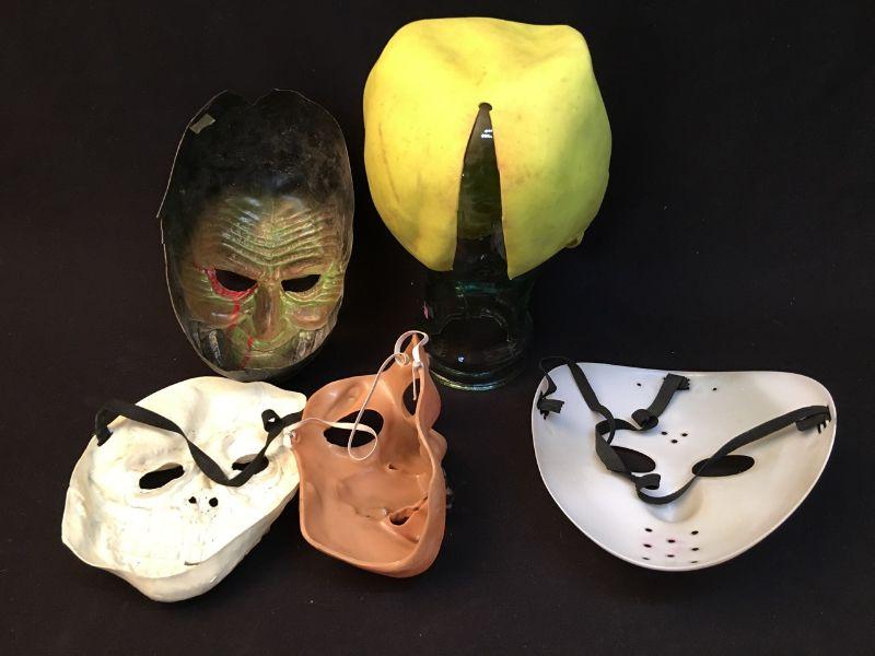 Description: This lot of Halloween party masks include a plastic wrinkled face resembling a patina bronze sculpture; a grinning white skull, a buck-toothed buffoon, a "Michael" movie hockey mask for the criminally insane with a lipstick kiss and a chartreuse-green grinning Mask from the movie The Mask.