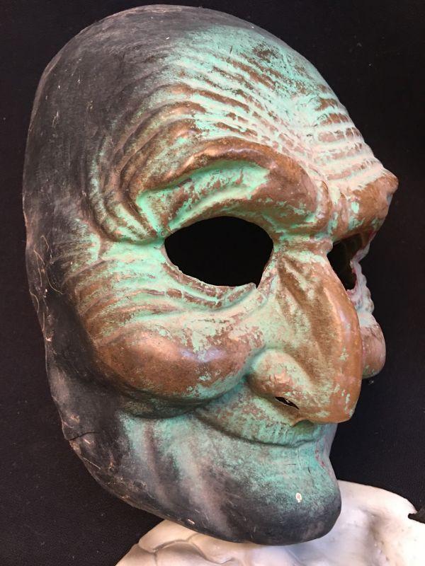 Condition: Wearable, serviceable Condition. The thinly molded witch mask has cracks and some loss at the back perimeter.