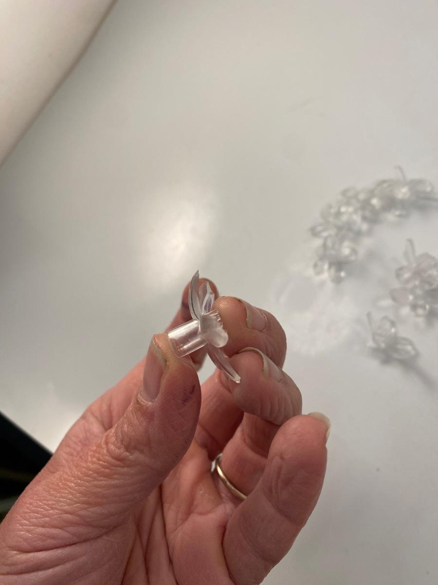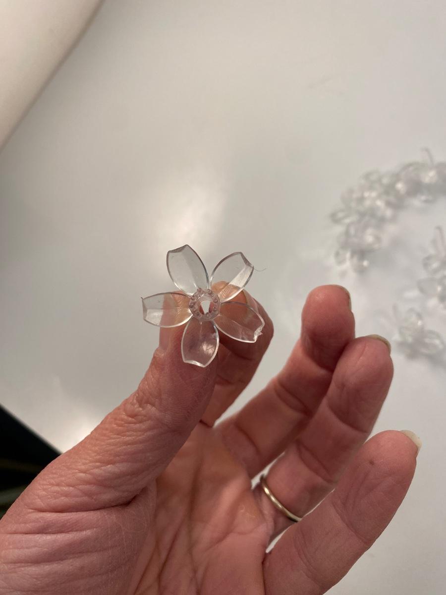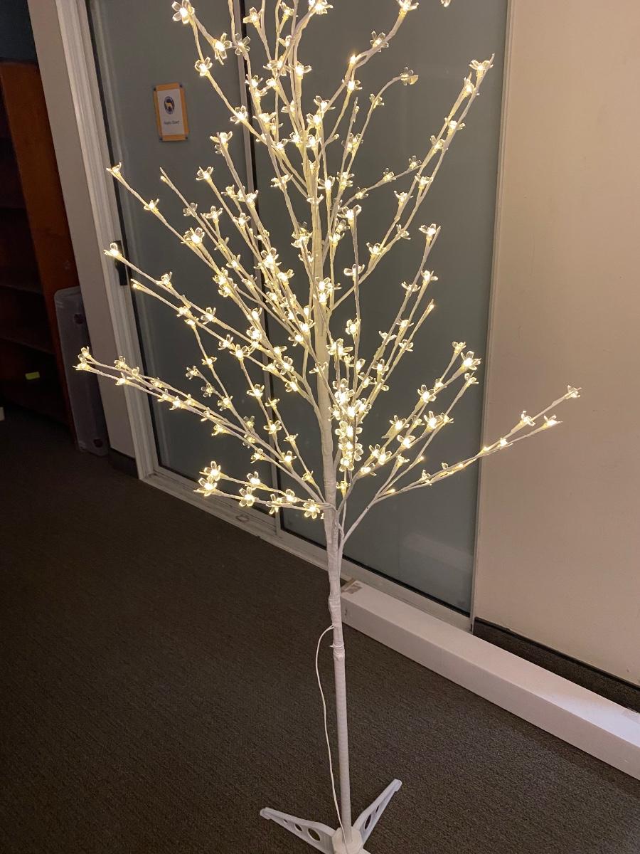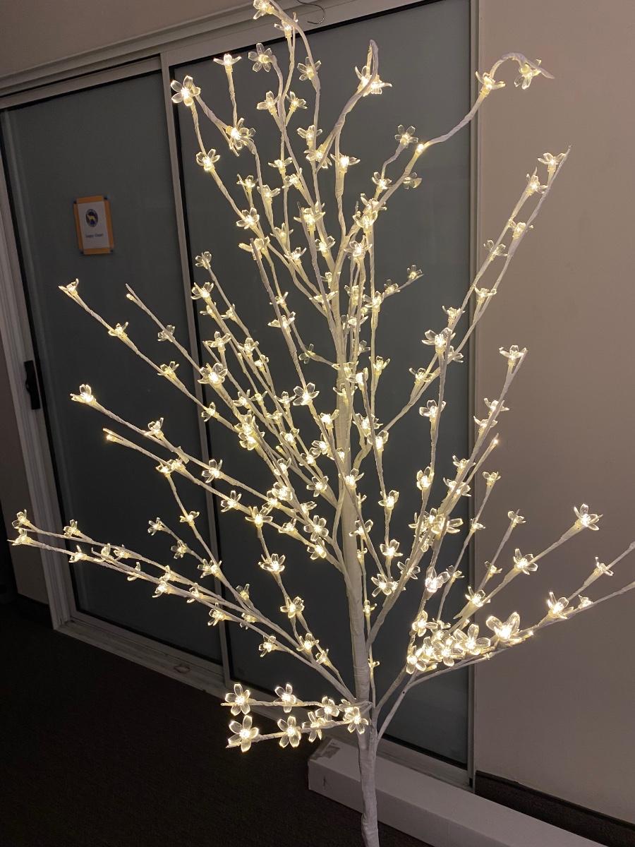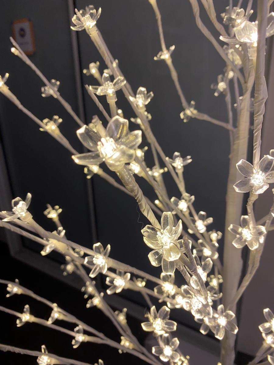 5' White Lighted Flower Cherry Blossom Tree Mood Lighting. The flower blossom pieces are made of a rubber, so they do not break like older plastic versions of bulb covers. LED lights. Extra-long cord. Break in two for storage. About 5' height. Great for soft ambient light.