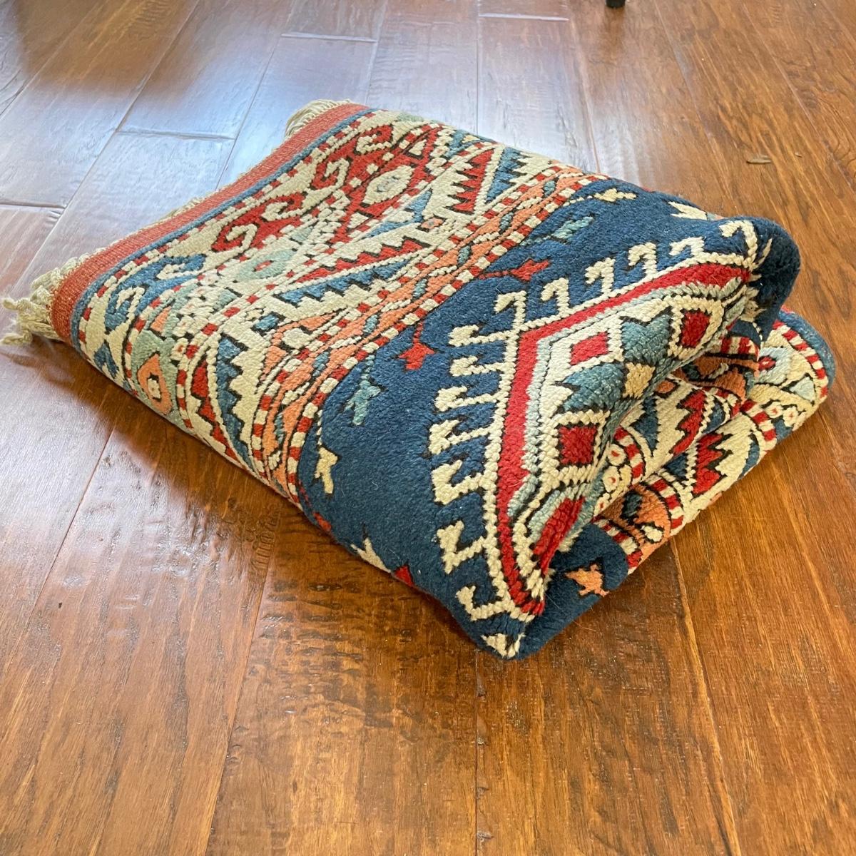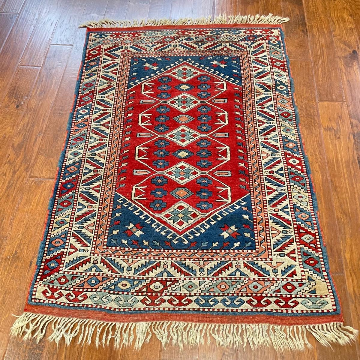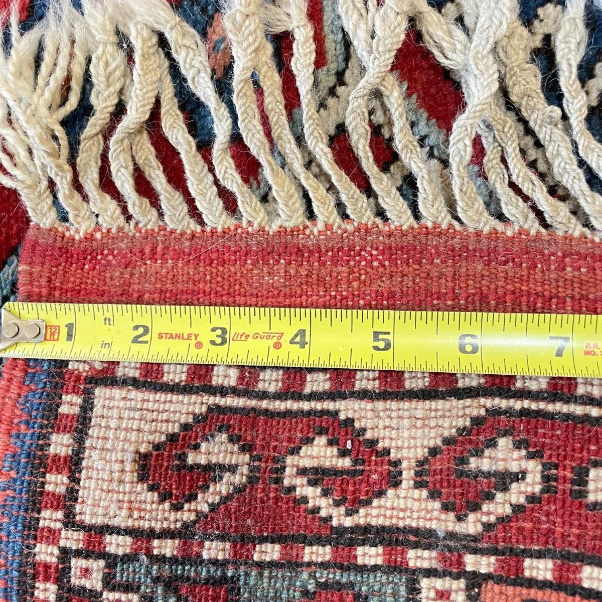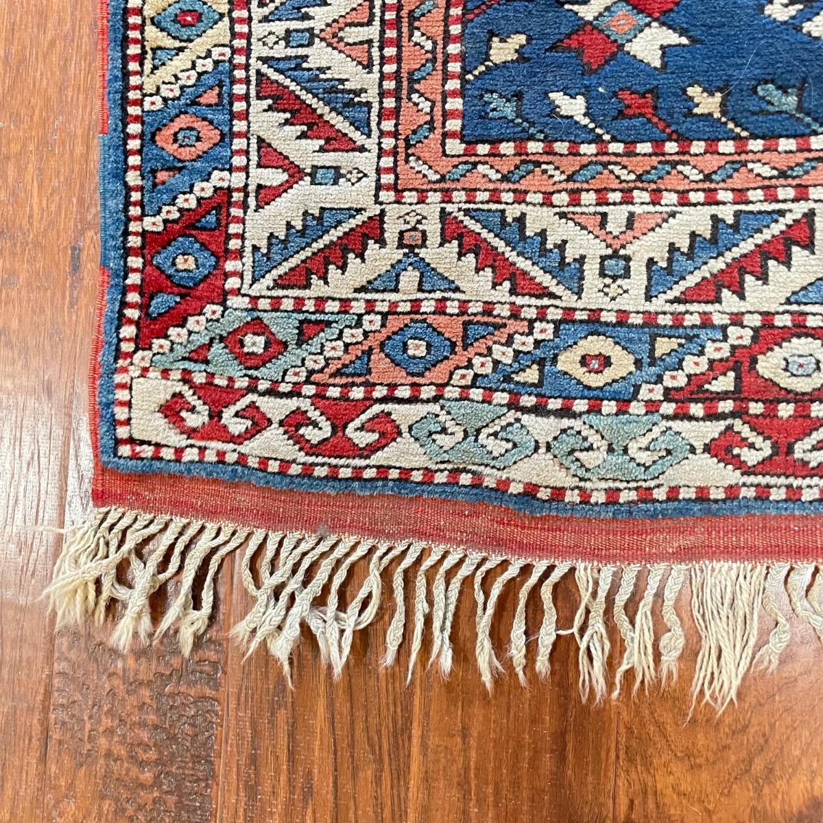 Bold blue and red designs led us to believe this is likely a Kazak rug. Rug appears to be hand woven with low pile and long fringe- adding 3” to each end. Without the fringe, rug measures 5’ x 3’7”. Rug has a tag from a local professional cleaner attached. The cream border on one side is a bit duller than the other side, but hardly noticeable. See images. Shipping available.