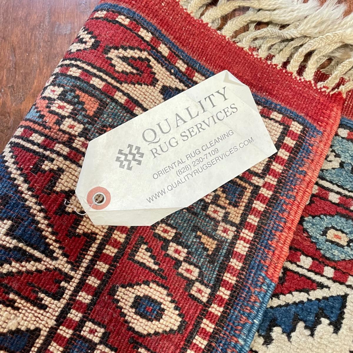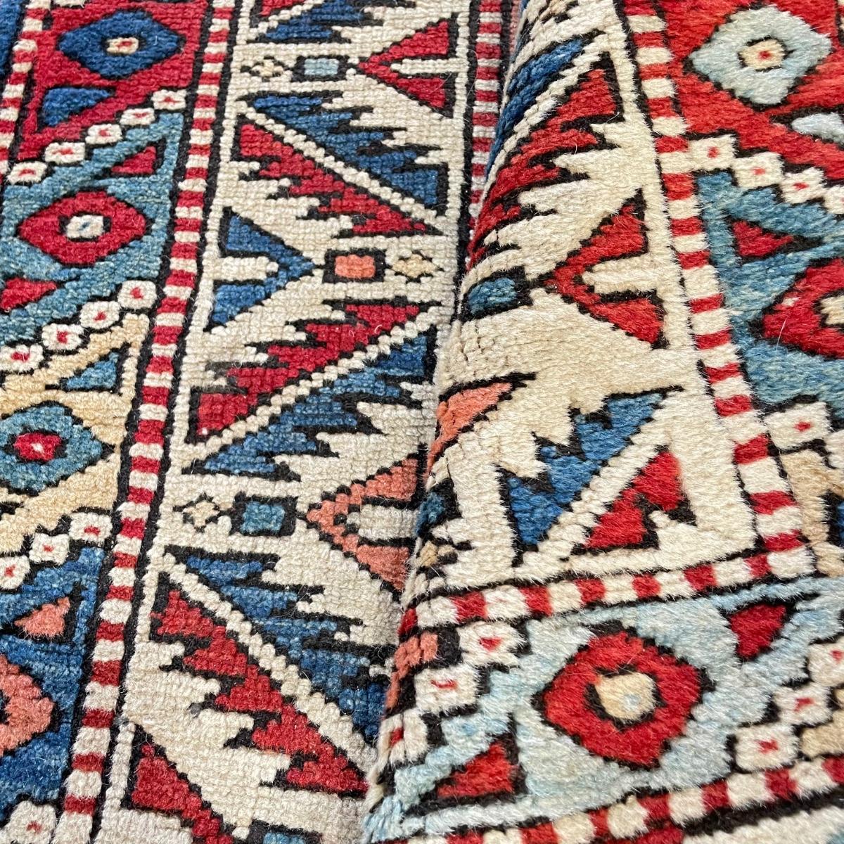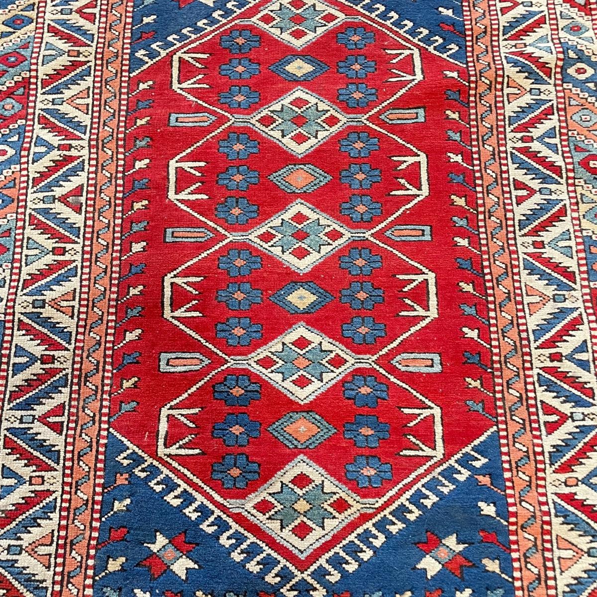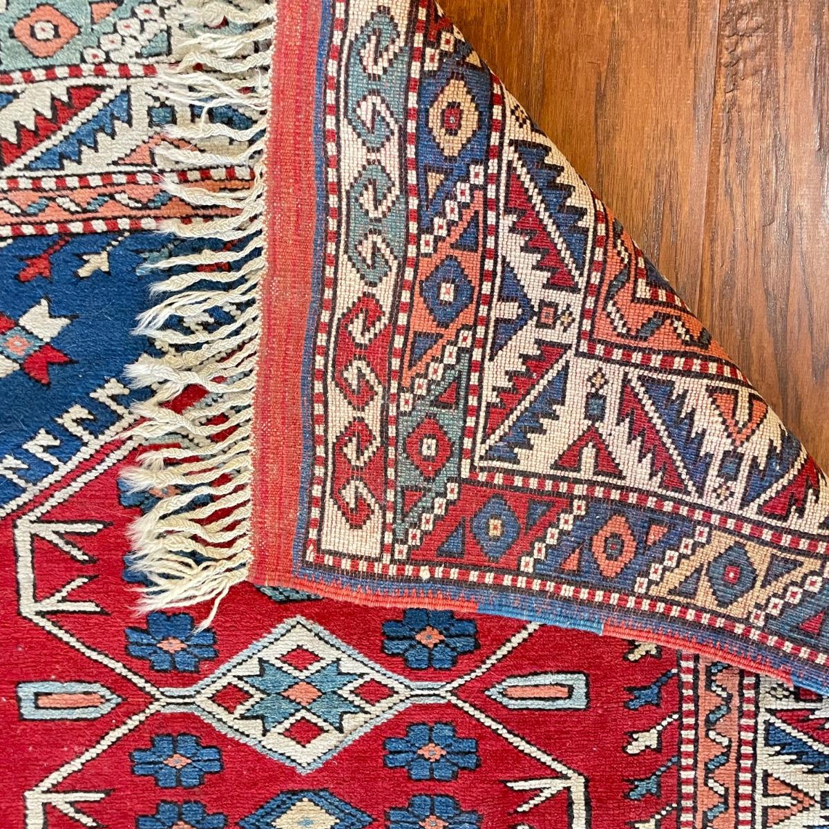 Bold blue and red designs led us to believe this is likely a Kazak rug. Rug appears to be hand woven with low pile and long fringe- adding 3” to each end. Without the fringe, rug measures 5’ x 3’7”. Rug has a tag from a local professional cleaner attached. The cream border on one side is a bit duller than the other side, but hardly noticeable. See images. Shipping available.