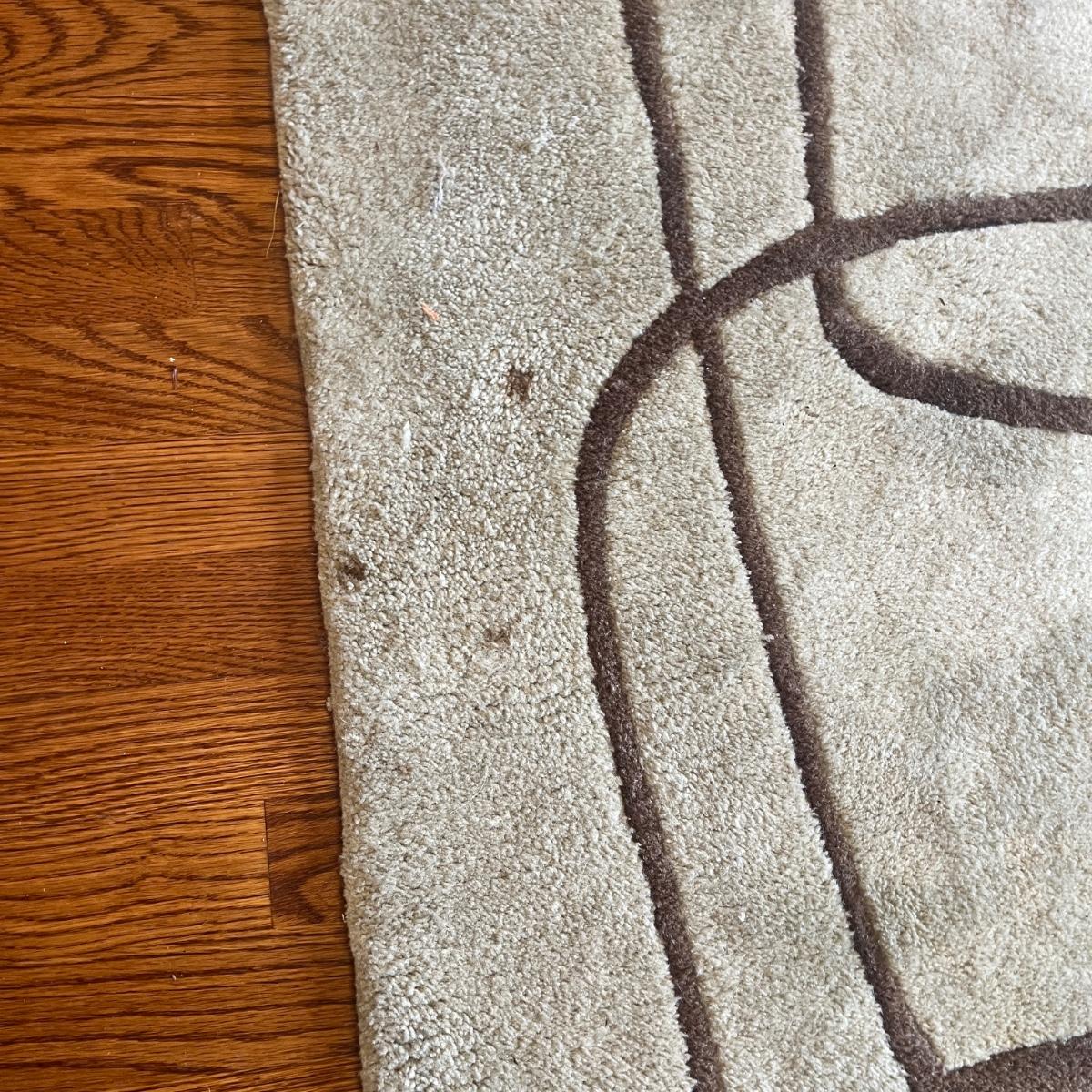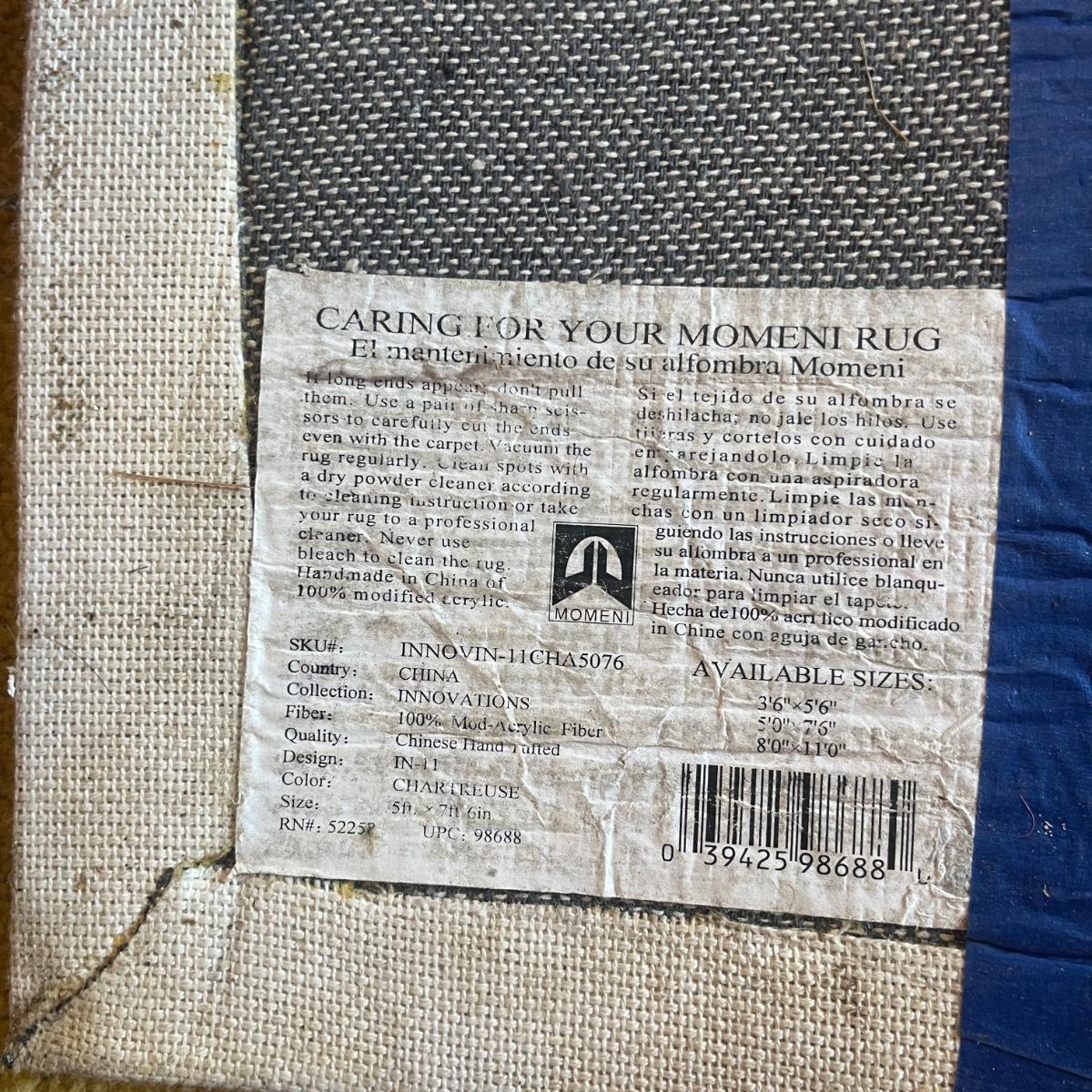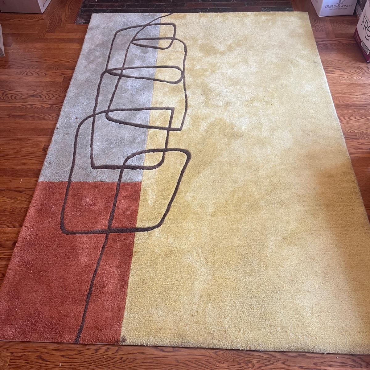Lot includes a Momeni brand acrylic rug with a geometric design. Rug measures 5’ x 7.5’. Rug has some spots and will need cleaning, see pictures.