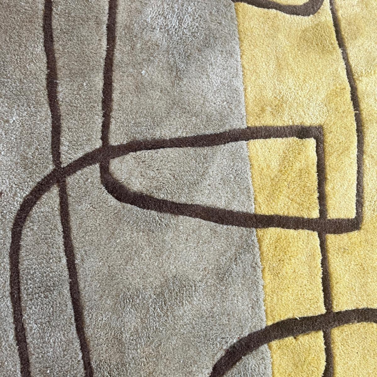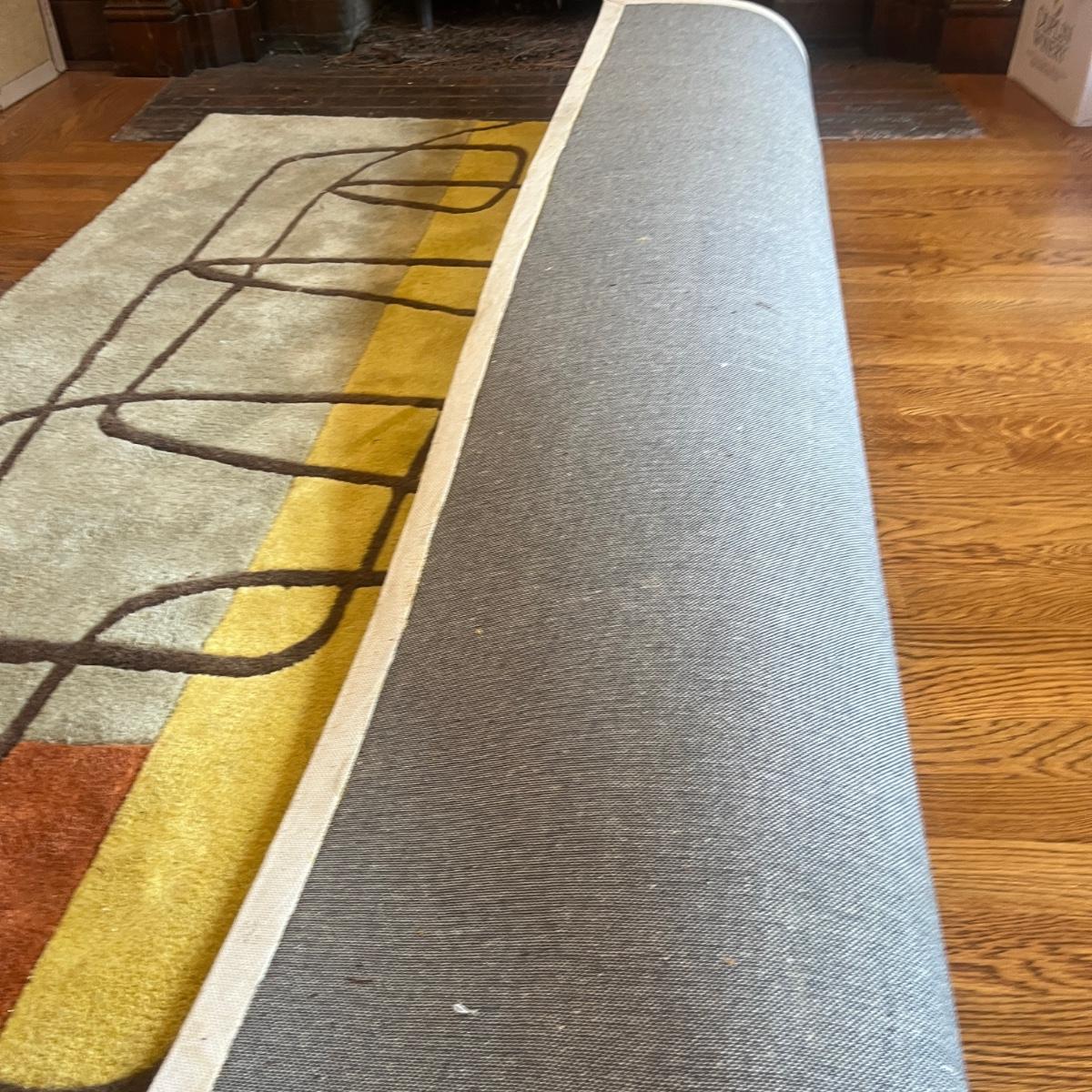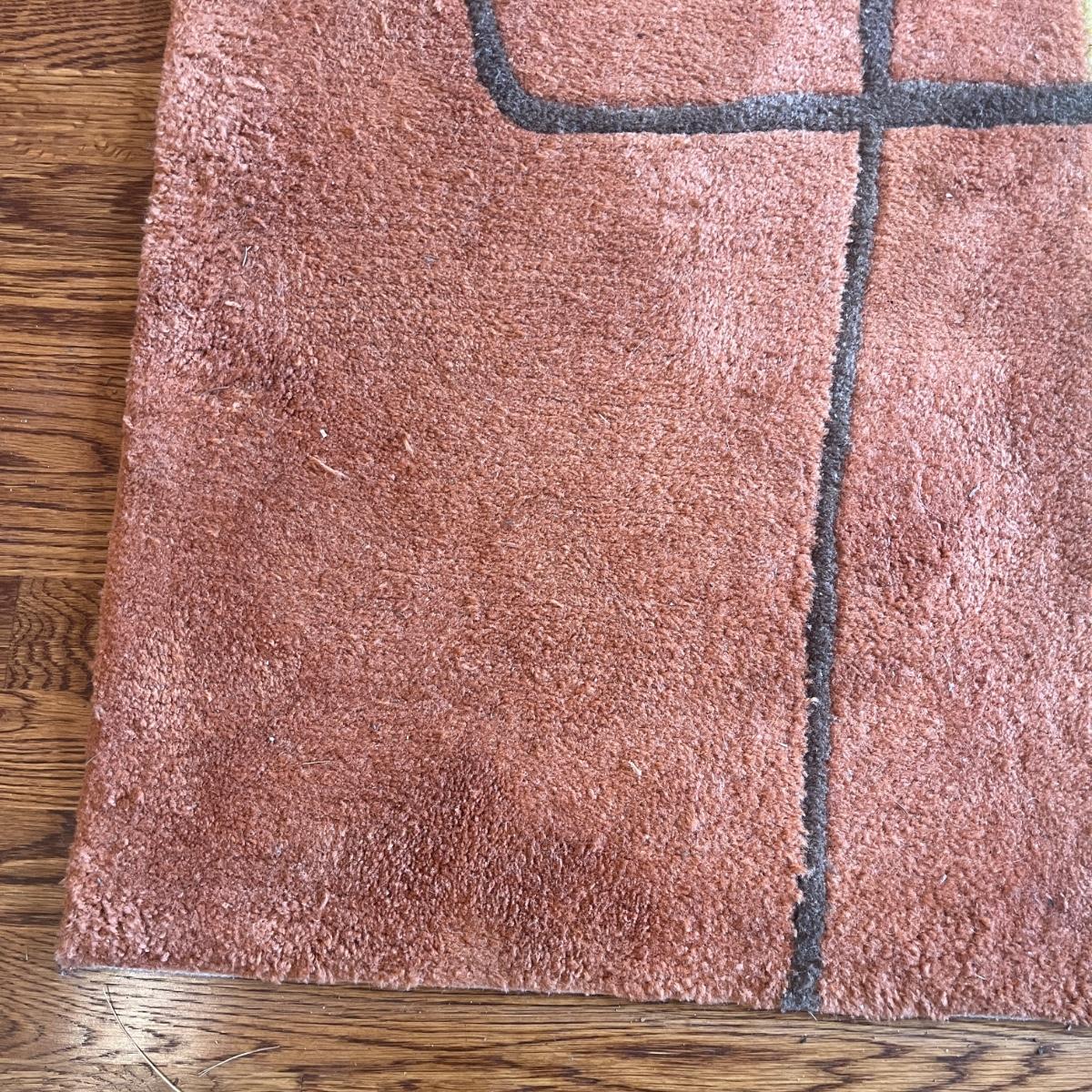 Lot includes a Momeni brand acrylic rug with a geometric design. Rug measures 5’ x 7.5’. Rug has some spots and will need cleaning, see pictures.