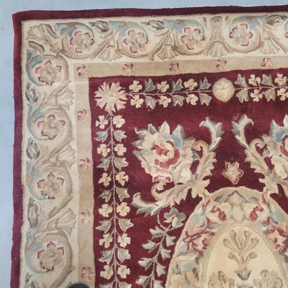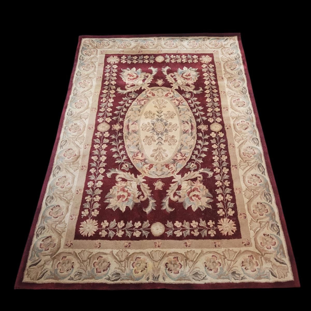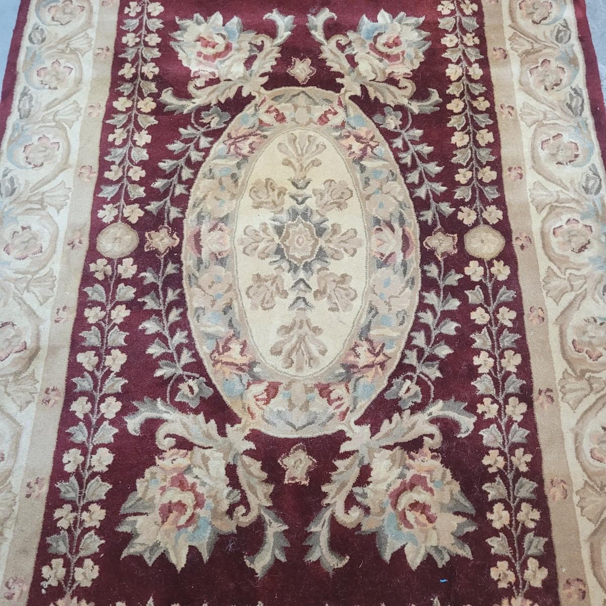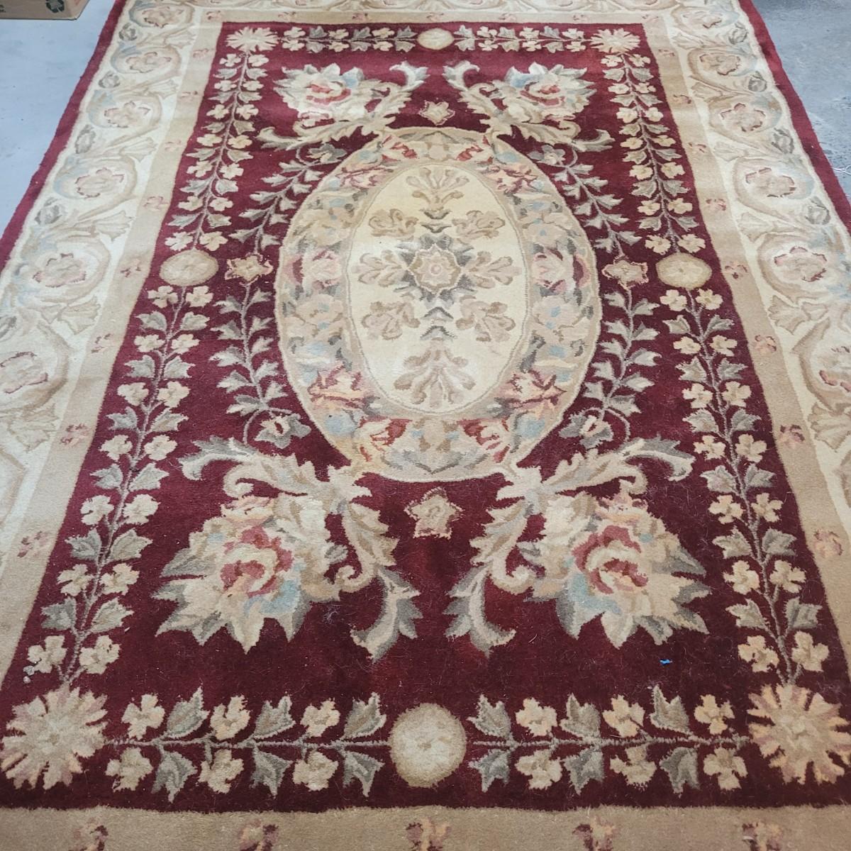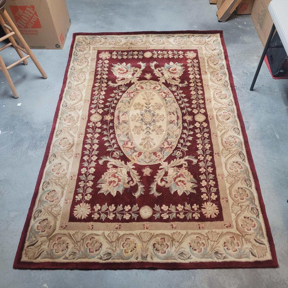 This lot includes one 5' x 8' floral area rug. It features floral patterns in maroon and beige with accents of leaves and vines in blue and green. There is a tag that is worn and difficult to read. There are some minor stains, but no damage to the fabric of the rug.