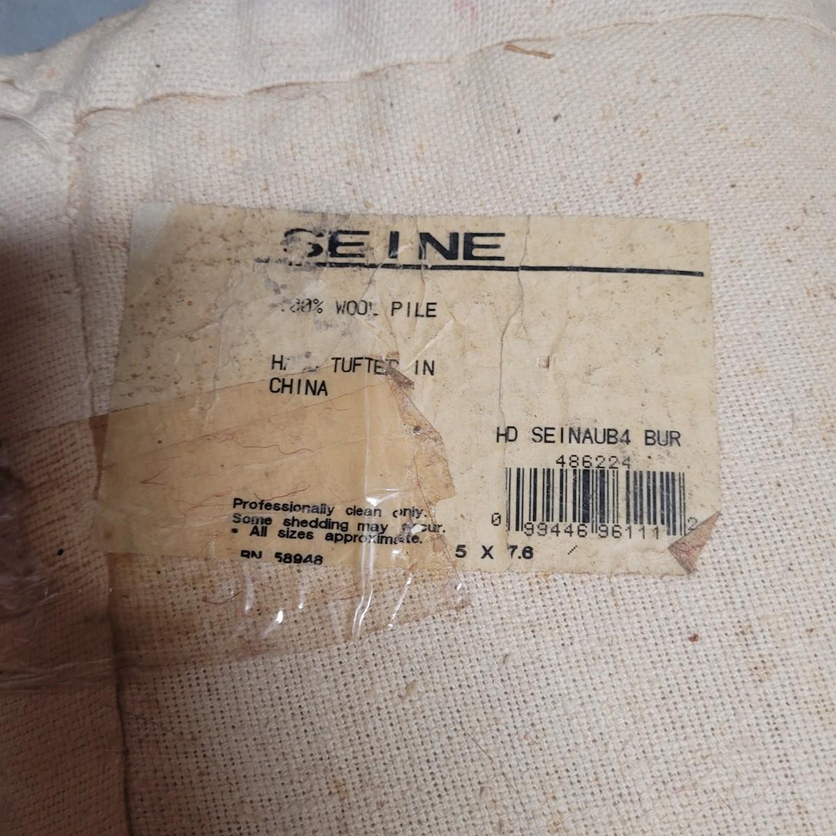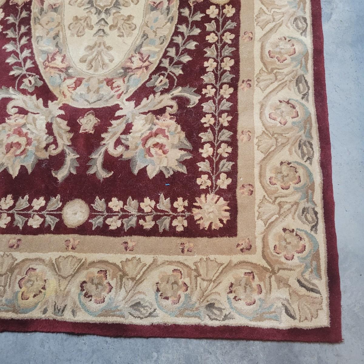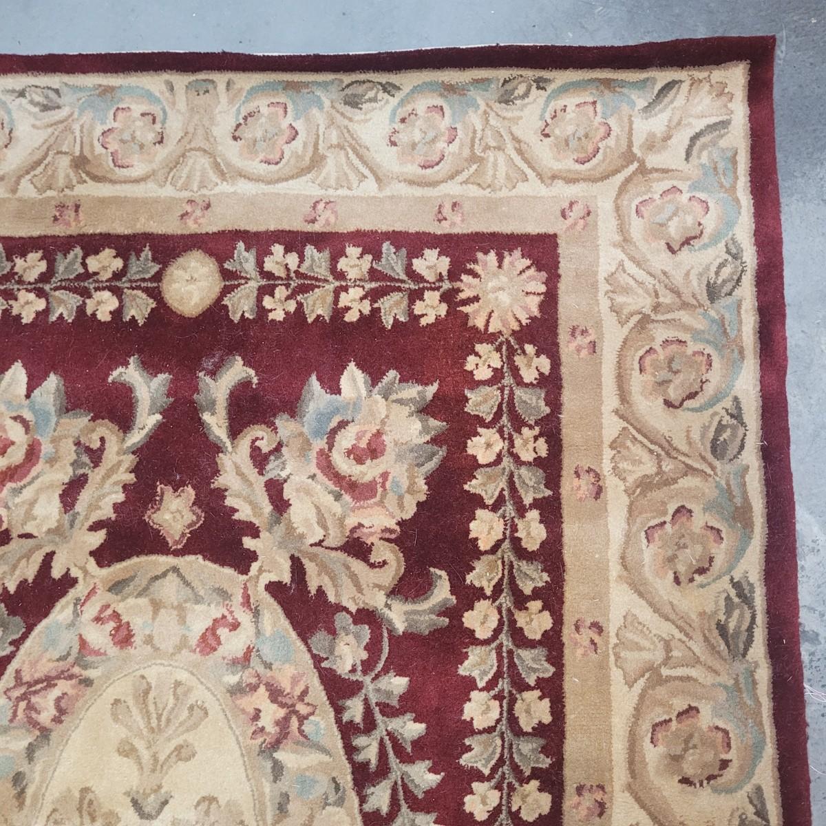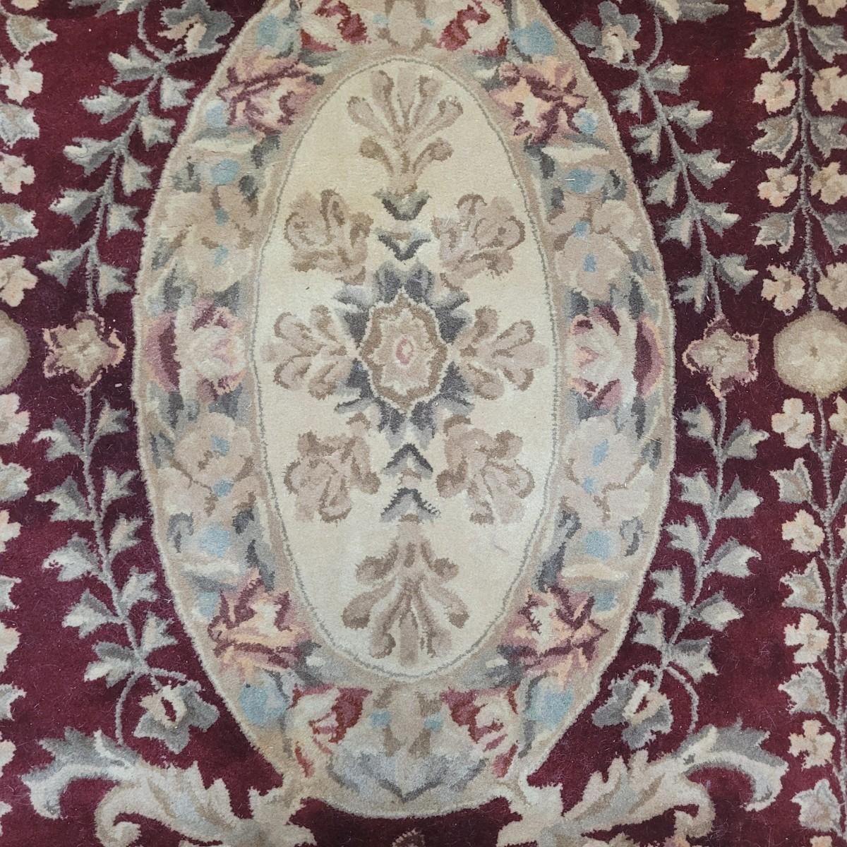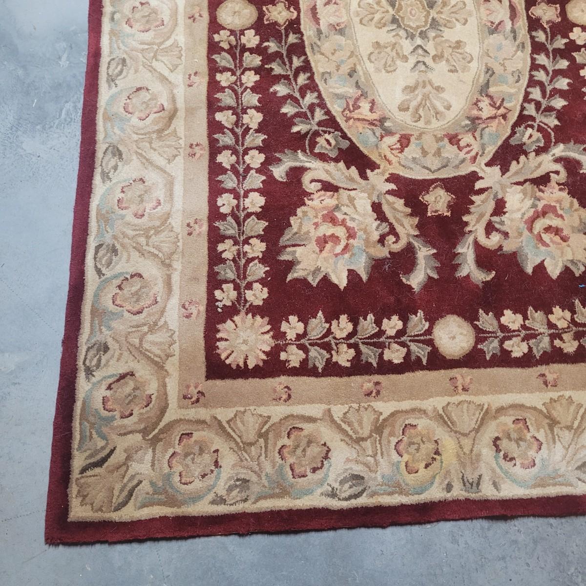 This lot includes one 5' x 8' floral area rug. It features floral patterns in maroon and beige with accents of leaves and vines in blue and green. There is a tag that is worn and difficult to read. There are some minor stains, but no damage to the fabric of the rug.