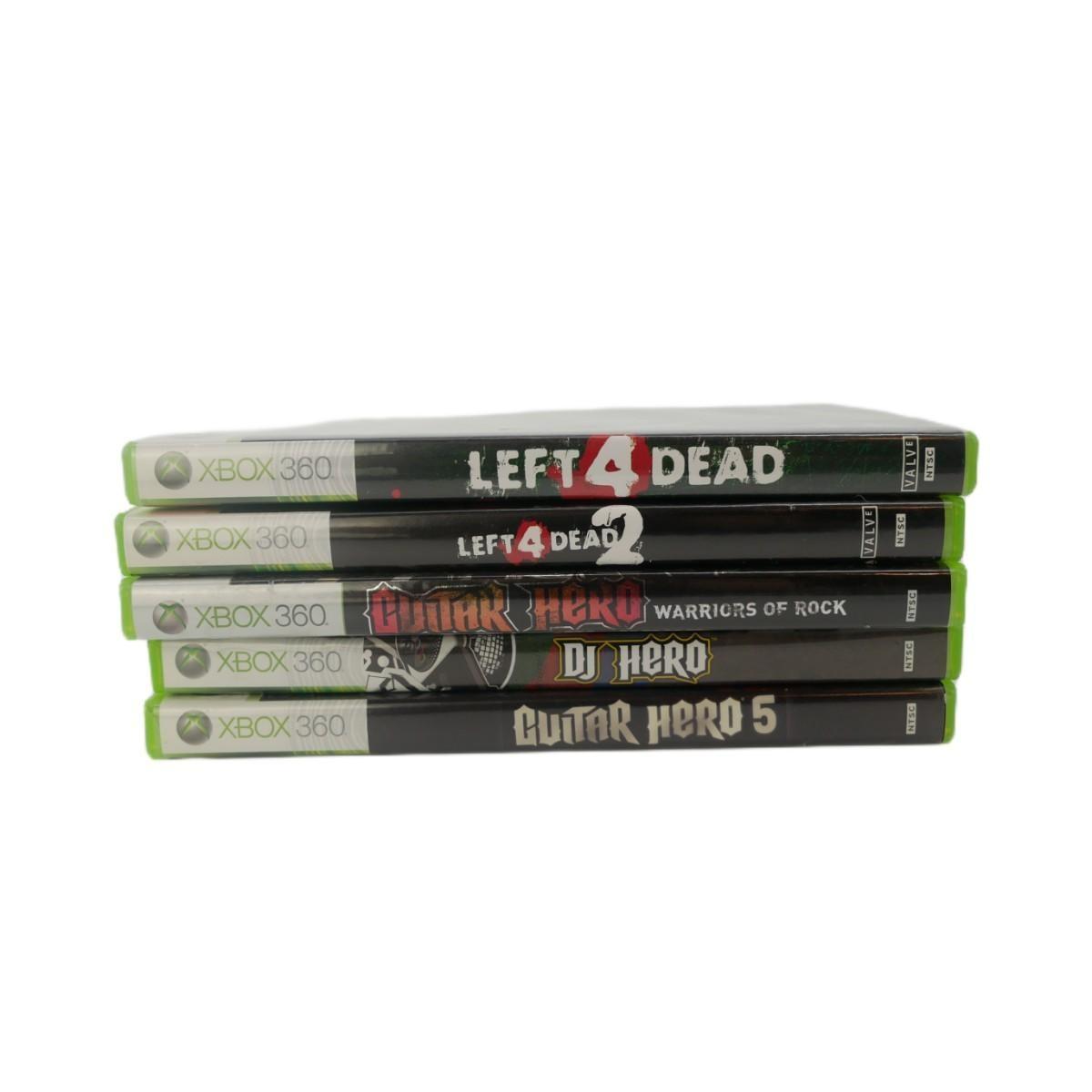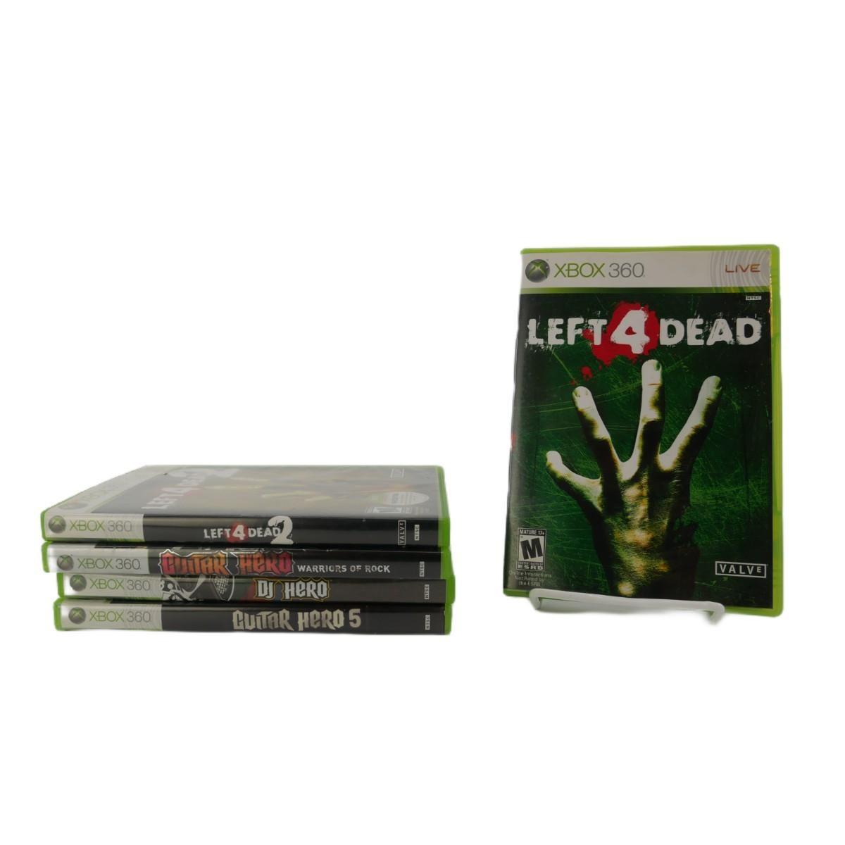 Lot of 5 Xbox 360 games including: Left 4 Dead, Left 4 Dead 2, Guitar Hero Warriors of Rock, Guitar Hero 5, and DJ Hero. Untested, some boxes have rips and damage. Scratching may be present on discs. Packaged lot measures 6" x 9" x 4", weighs 2 lbs. (M58)
