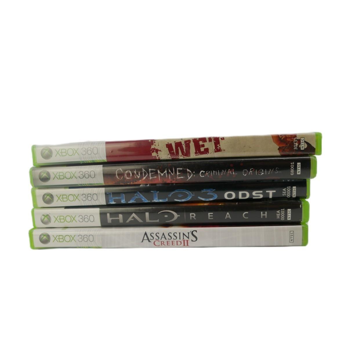 Lot of 5 Xbox 360 games including: Wet, Condemned, Halo 3 ODST, Halo Reach, and Assassins Creed 2. Untested, some boxes have rips in plastic and damage. Scratching may be present on discs. Packaged lot measures 6" x 9" x 3", weighs 2 lbs. (M56)