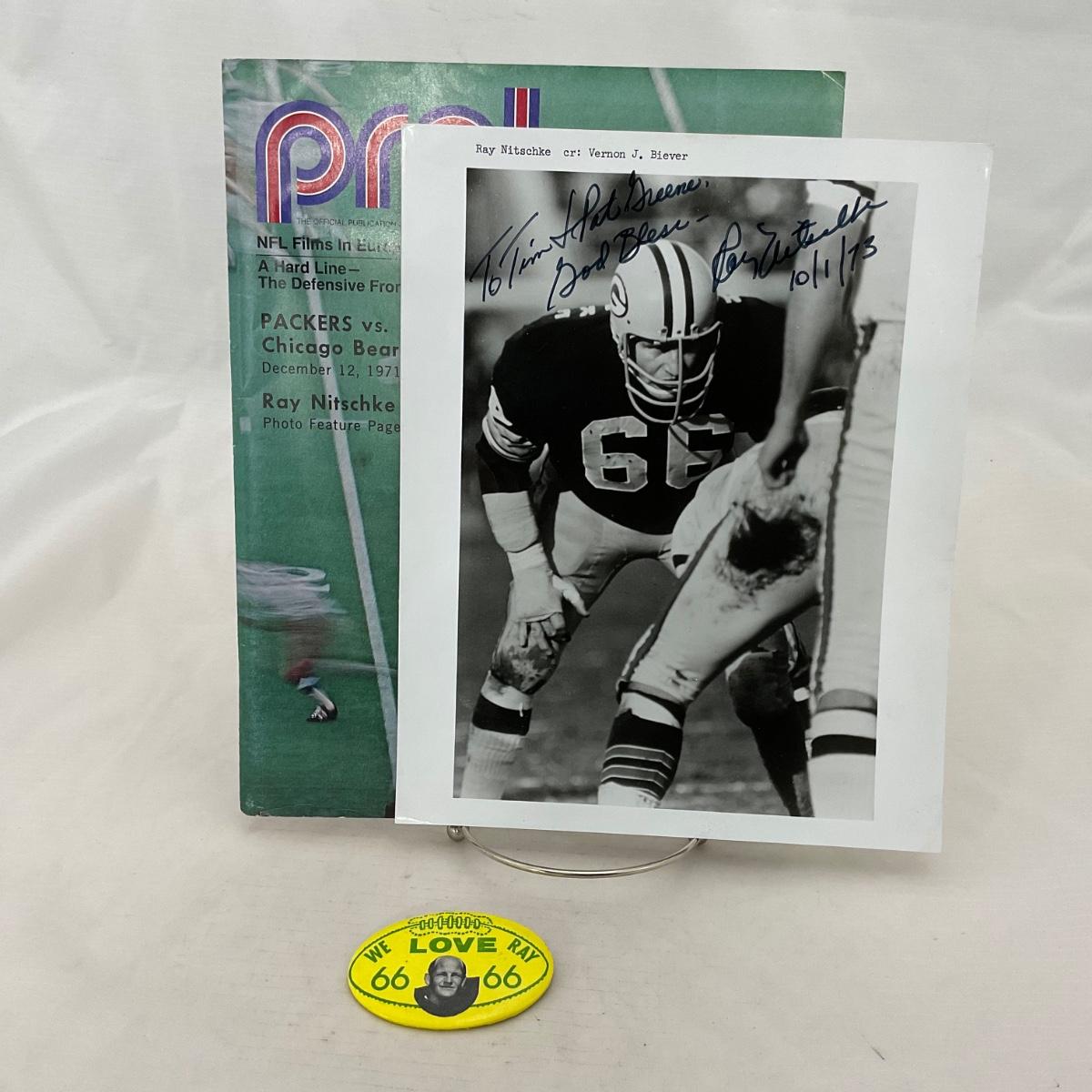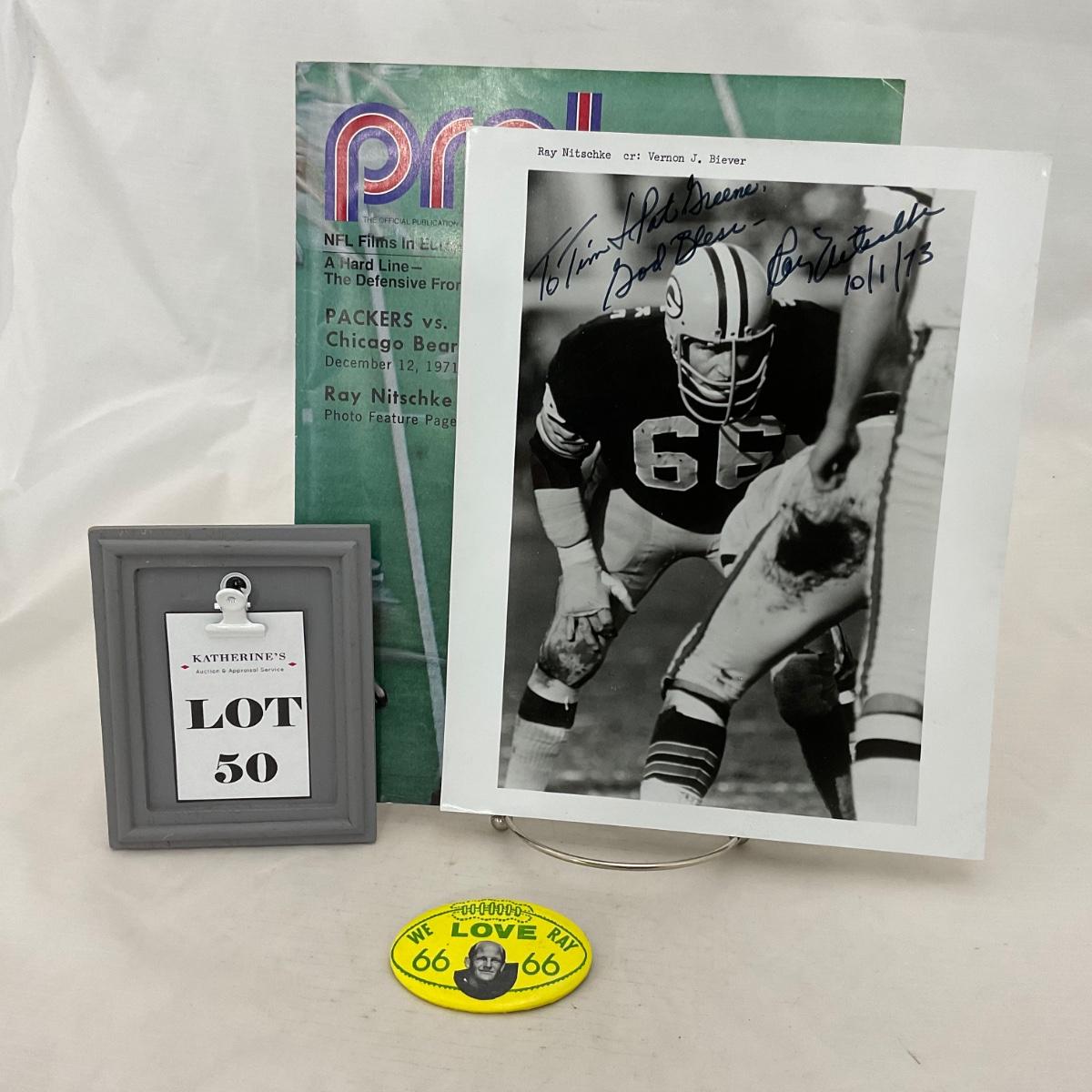 Three Green Bay Packers collectible items including, one Ray Nitschke autographed picture signed with no Certificate of Authenticity, item is assumed authentic however not guaranteed. One we love Ray button and one Pro! Program. Please see photos for details and condition. ::: Shipping is available on this lot. If you require shipping you must let us know at the close of the auction. We will coordinate with you after the item has been won. Shipping fees will include insurance up to or exceeding the value of all items being mailed. If you have any questions regarding this lot please contact the auctioneer either via this website, by direct email or by phone. PICK UP TIMES and other important information can be found in the TERMS and DESCRIPTION of the auction. Please take a look for pertinent information. Thanks!