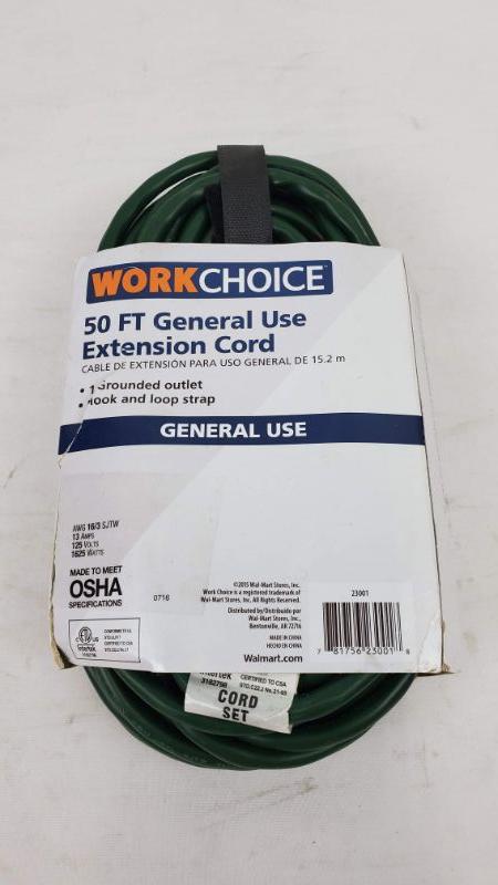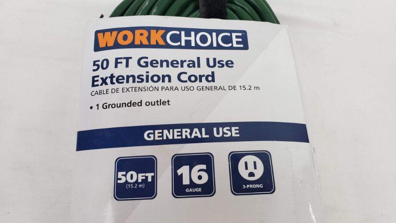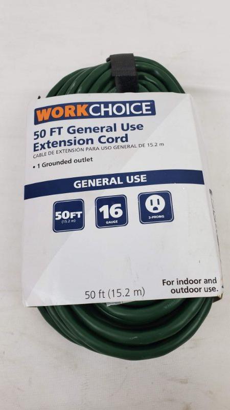 50 FT General Use Extension Cord, 1 Grounded Outlet, Green, Indoor/Outdoor Use, 3-Prong - New