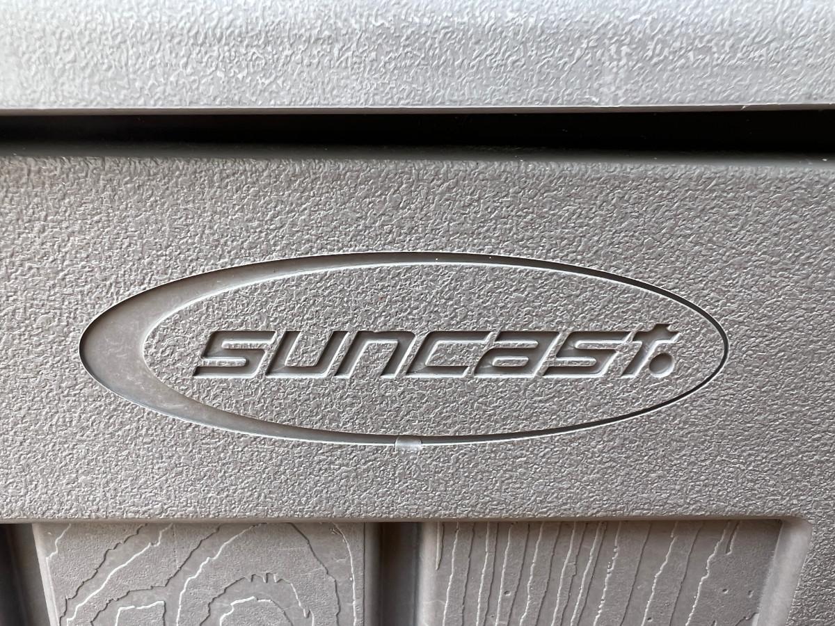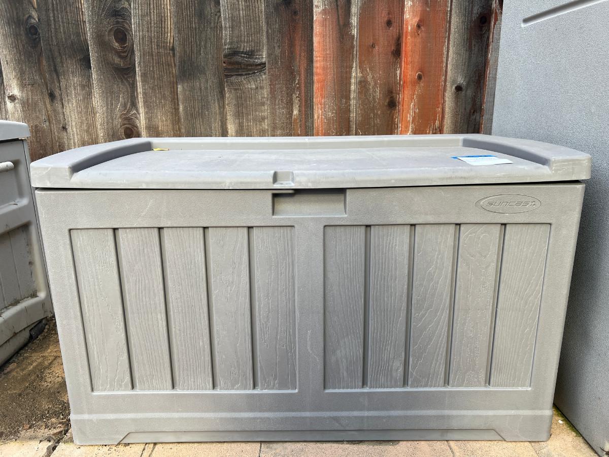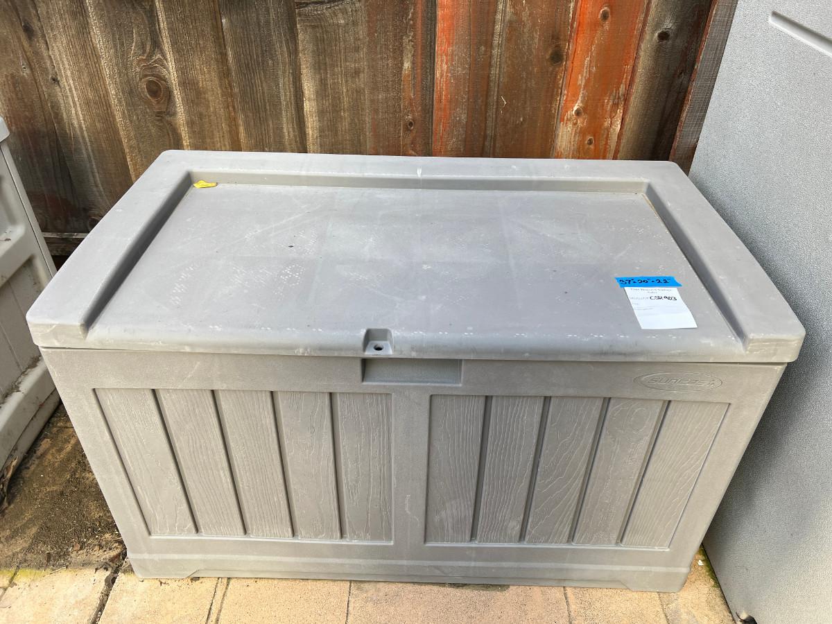 50 Gallon Medium Deck Box - Light taupe resin box. DB602305 good condition note this one has a top made for holding cushions