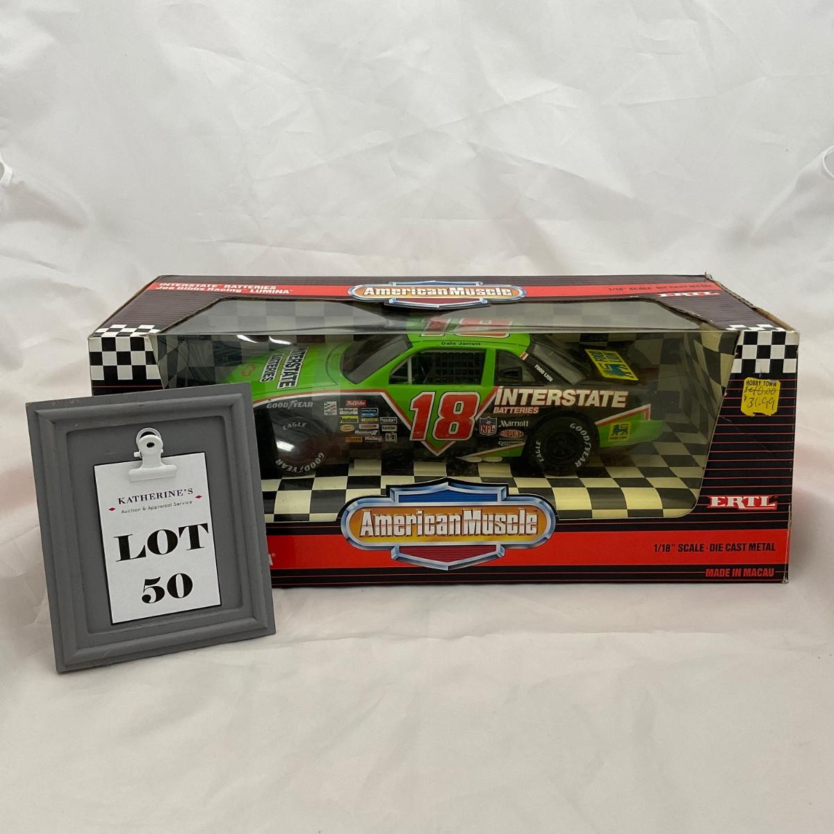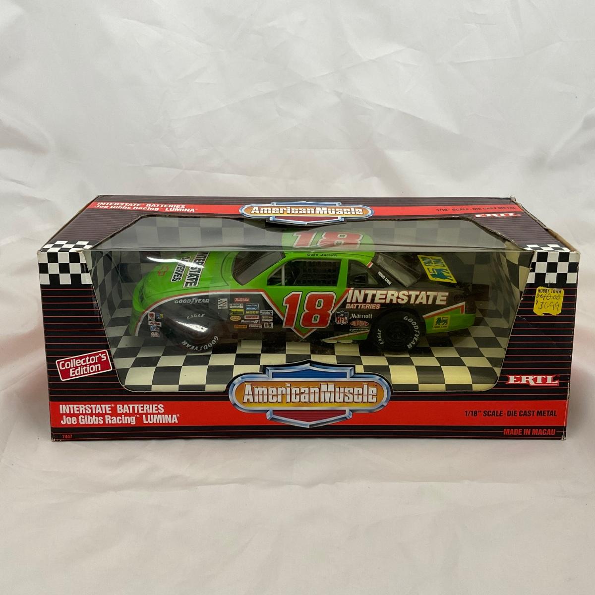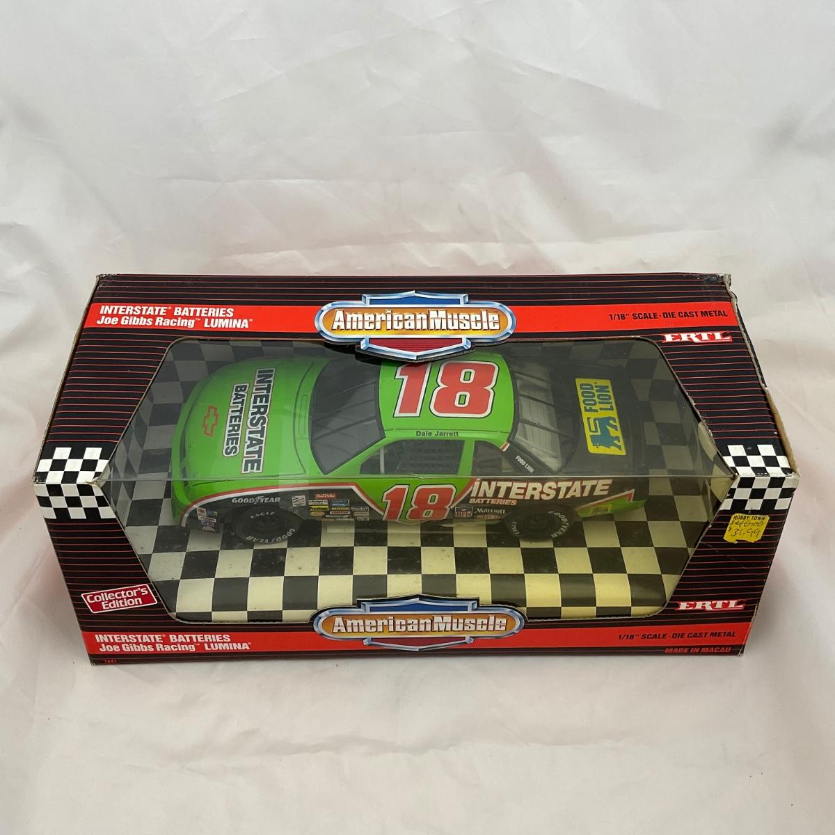 One NASCAR die cast 1:18 scale Interstate Batteries Joe Gibbs Racing Lumina in box. Driver Dale Jarret. Please see photos for details and condition. ::: Shipping is available on this lot. If you require shipping you must let us know at the close of the auction. We will coordinate with you after the item has been won. Shipping fees will include insurance up to or exceeding the value of all items being mailed. If you have any questions regarding this lot please contact the auctioneer either via this website, by direct email or by phone. PICK UP TIMES and other important information can be found in the TERMS and DESCRIPTION of the auction. Please take a look for pertinent information. Thanks!