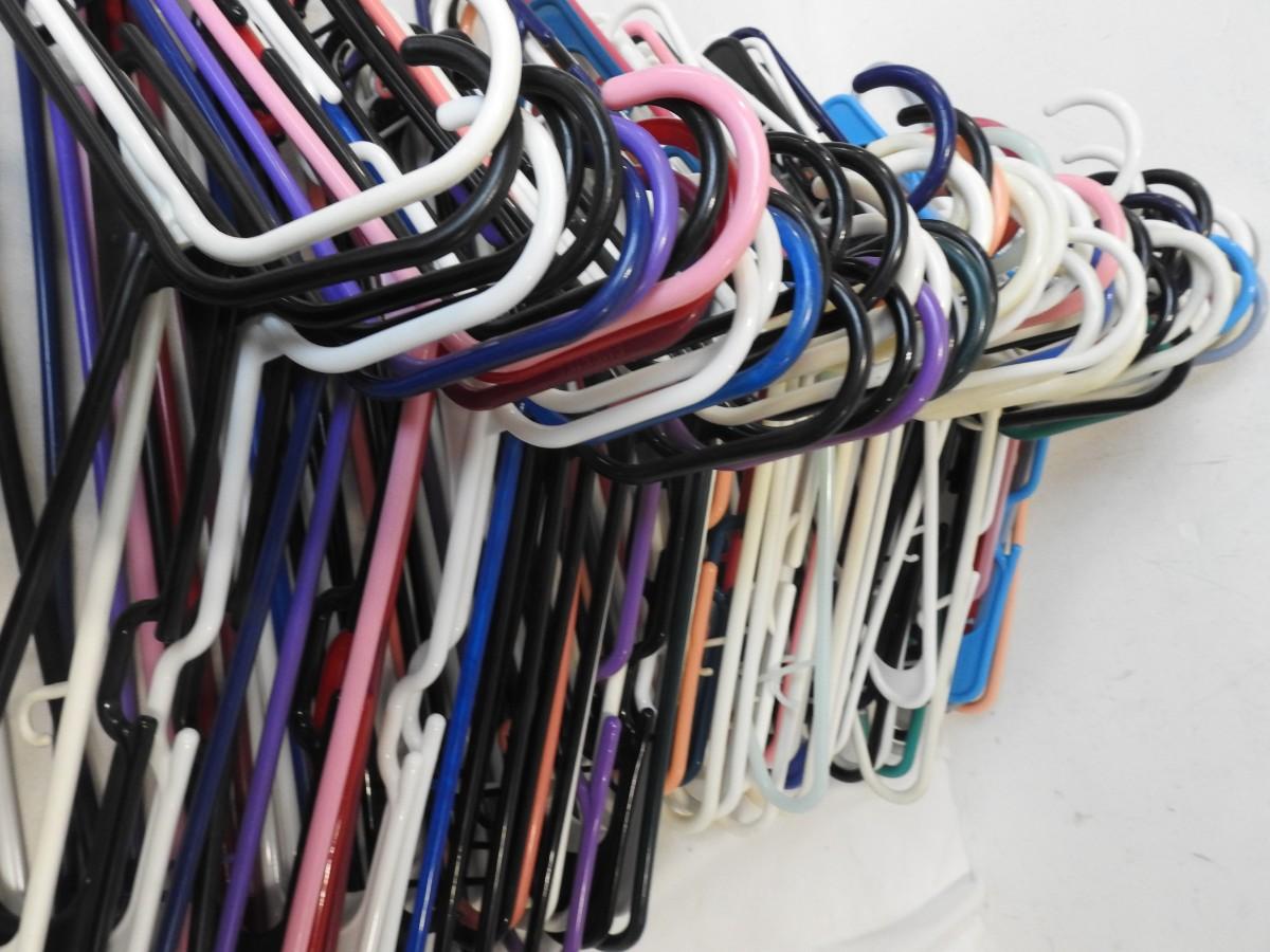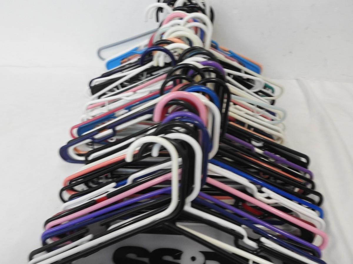 50+ Plastic Hangers, Various Colors: Black, Blue, Purple, White, Pink, Peach, Green