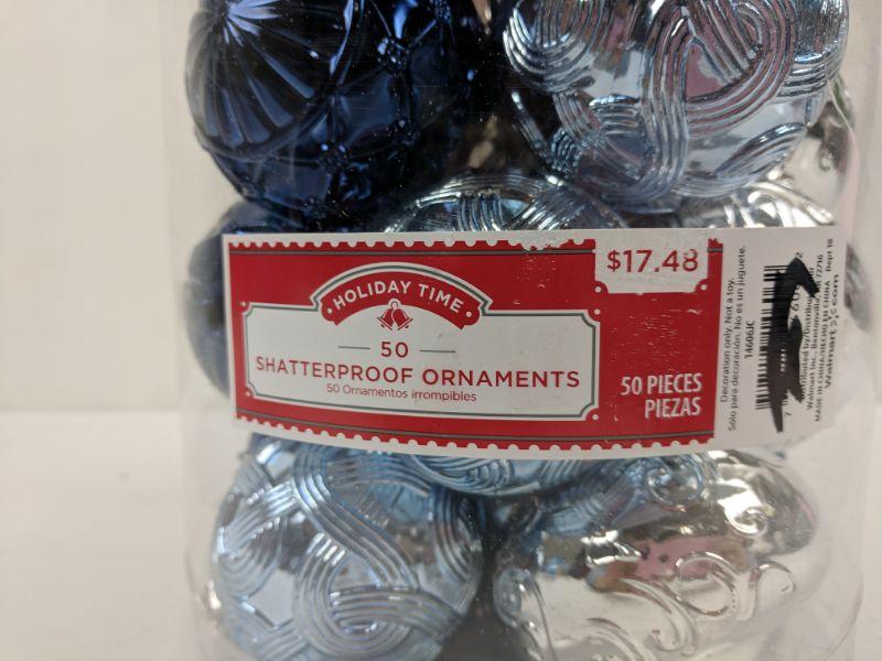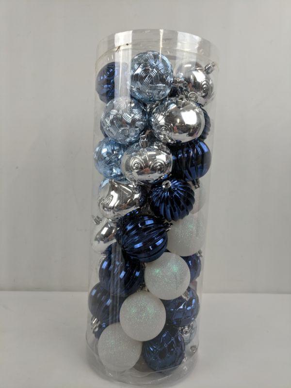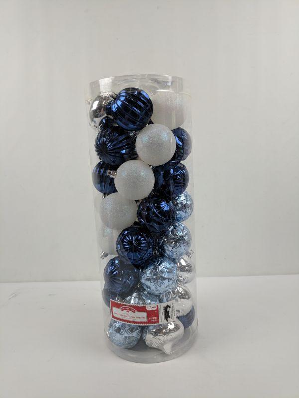 50 Shatterproof Ornaments, Blues, Silver & Sparkle, Pkg Damage - New