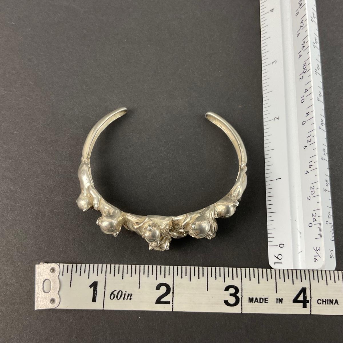 one vintage sterling silver marked Kabana cats bracelet. 36 grams in weight. Please see photos for details and condition. Any condition statement is given as a courtesy to a client, is an opinion, and should not be treated as a statement of fact. Reference to condition written, oral or within a condition report shall not be regarded as a full account of condition and may not include all defects, alterations, or restorations. Absence of a condition report does not imply a lot is flawless or lacking imperfections or damage. Katherine’s Auction & Appraisal Service shall have no responsibility for any error or omission. Returns shall not be accepted on the basis of condition. ::: Shipping is available on this lot. If you require shipping you must let us know at the close of the auction. We will coordinate with you after the item has been won. Shipping fees will include insurance up to or exceeding the value of all items being mailed. If you have any questions regarding this lot please contact the auctioneer either via this website, by direct email or by phone. PICK UP TIMES and other important information can be found in the TERMS and DESCRIPTION of the auction. Please take a look for pertinent information. Thanks!