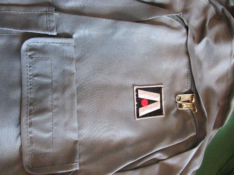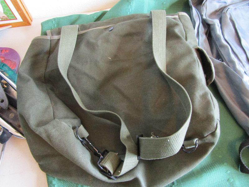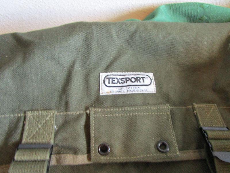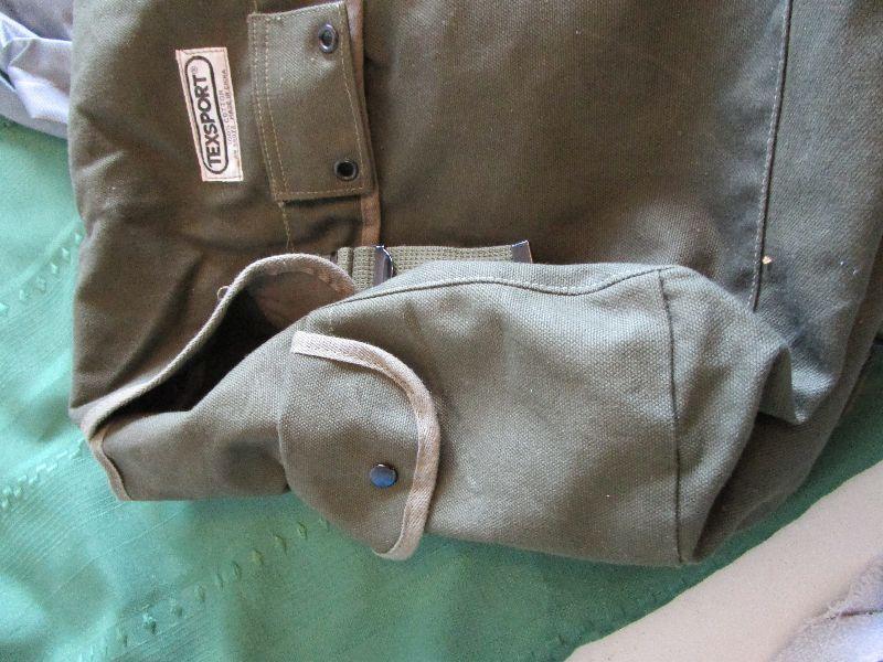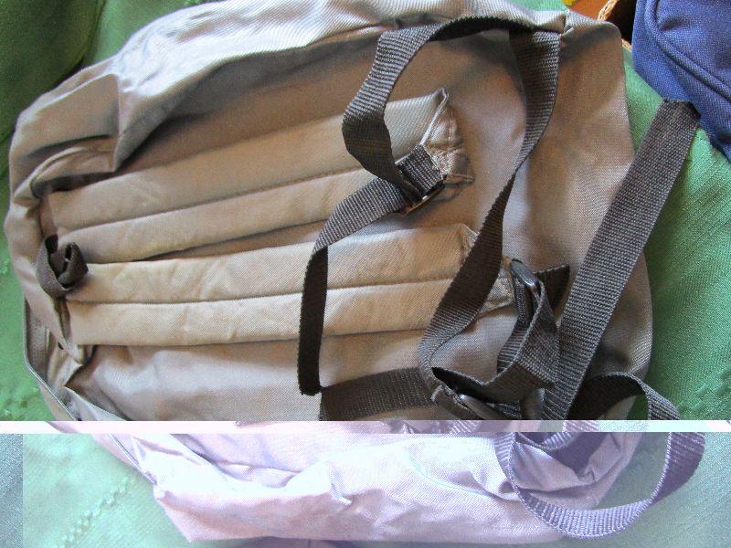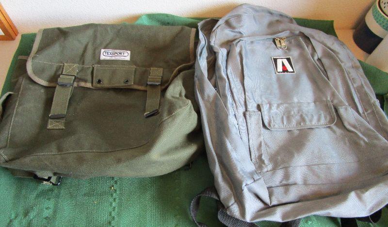 Gray Academy Sports backpack, new condition 11" x 14" x 4 1/2"; Olive green TexSport backpack 12" x 12" x 5 1/2"