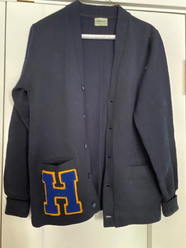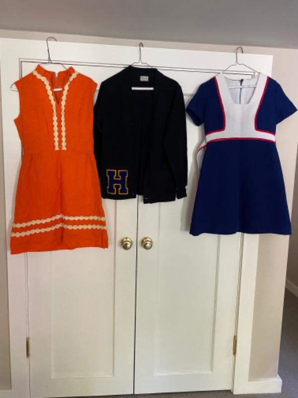 50. Vintage dresses (Saks Fifth Avenue),varsity sweater with letter “H”