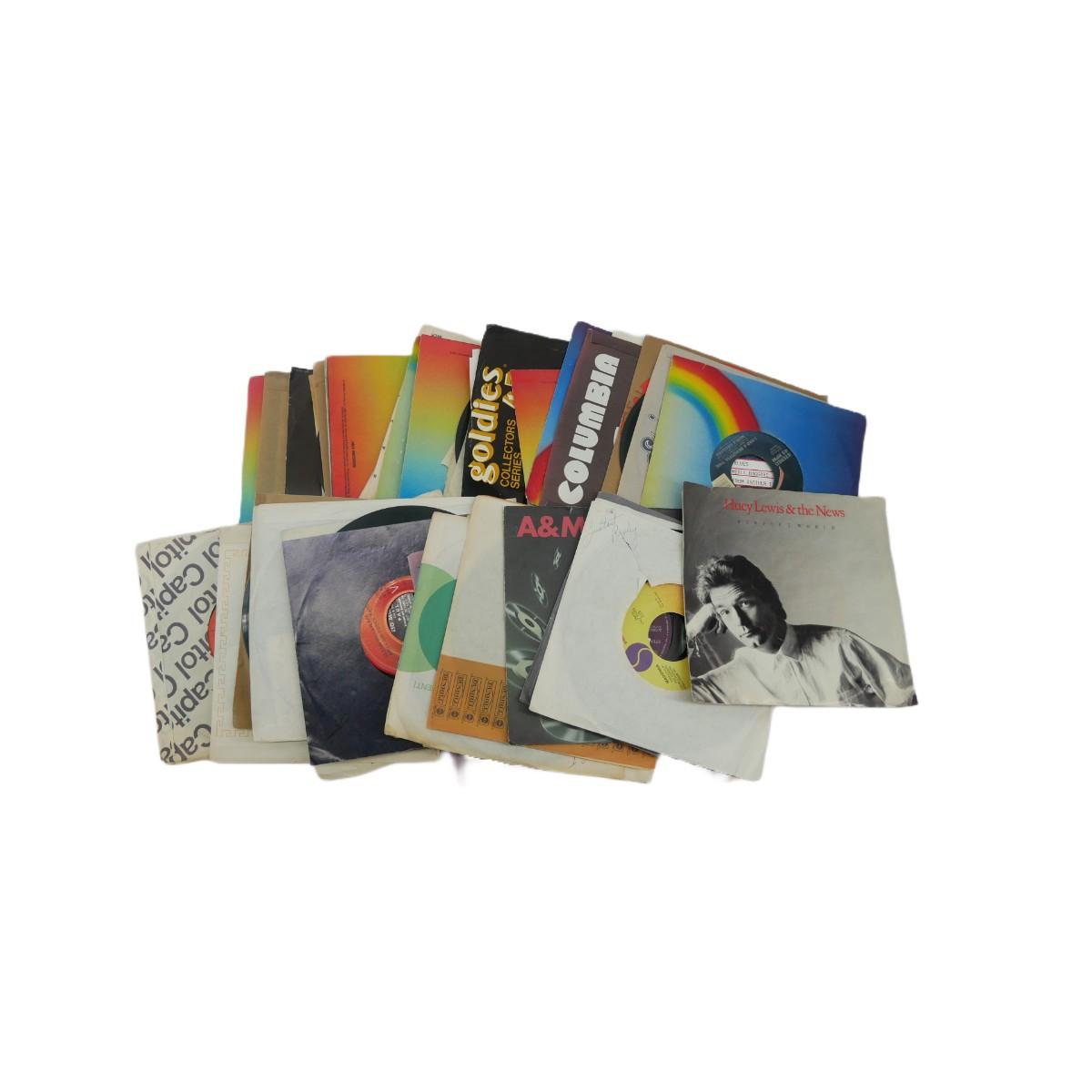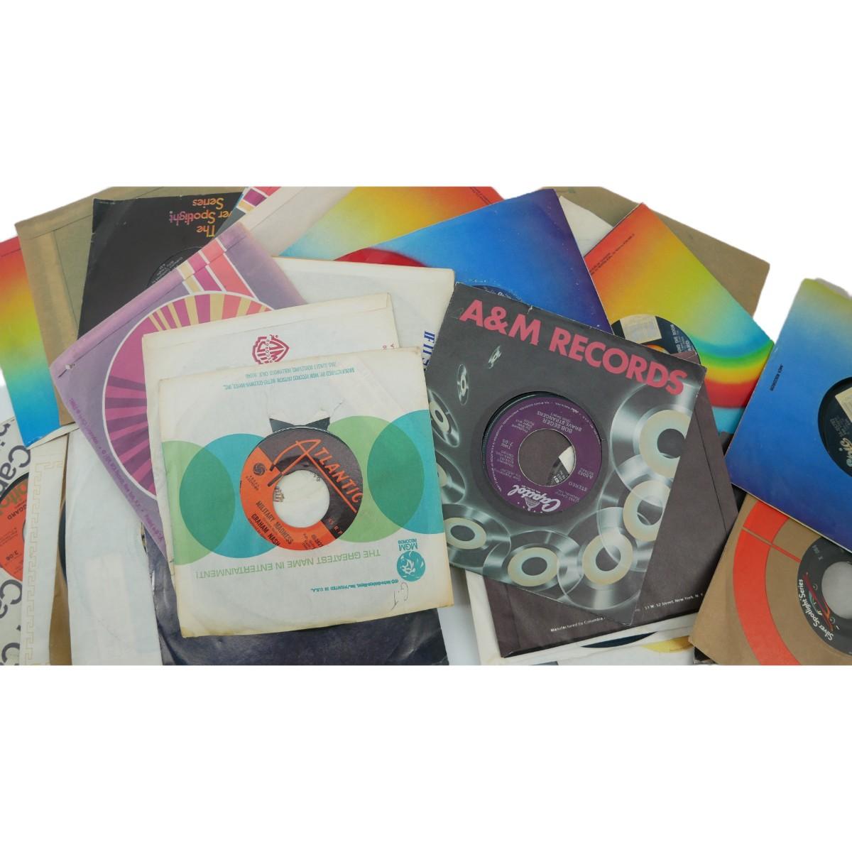 50 vintage 45 rpm vinyl records with sleeves. All used, good condition. Various aritsits and genres. Mostly rock, folk, country, motown, or easy-listening. Majority is 60s-80s music. Some records may be in incorrect sleeves, scractching, scuffs, and dust may be present. Lot weighs 5 lbs. (M24)