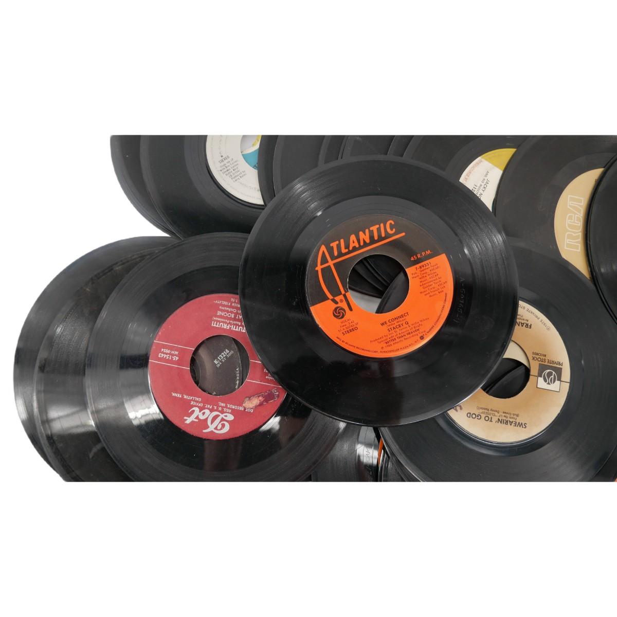 50 vintage loose/no sleeve 45 rpms records. Various aritsits and genres. Mostly rock, folk, country, and easy-listening. Majority is 60s-80s music. Good overall condition, there may be scratches, scuffing, and dust. Lot weighs 5 lb. (M20)