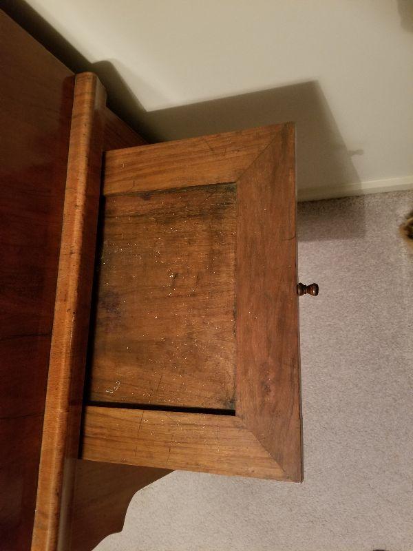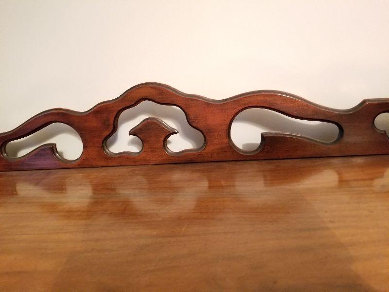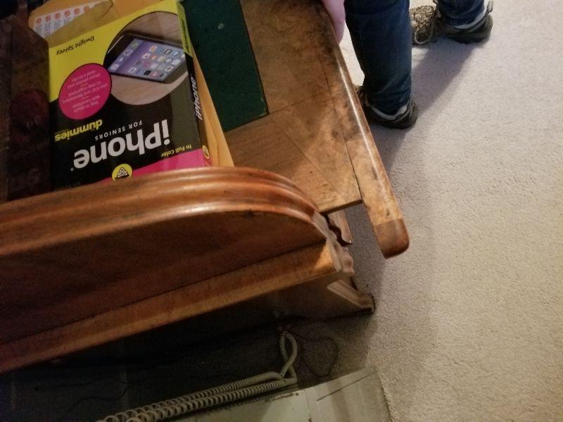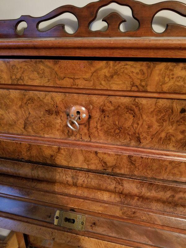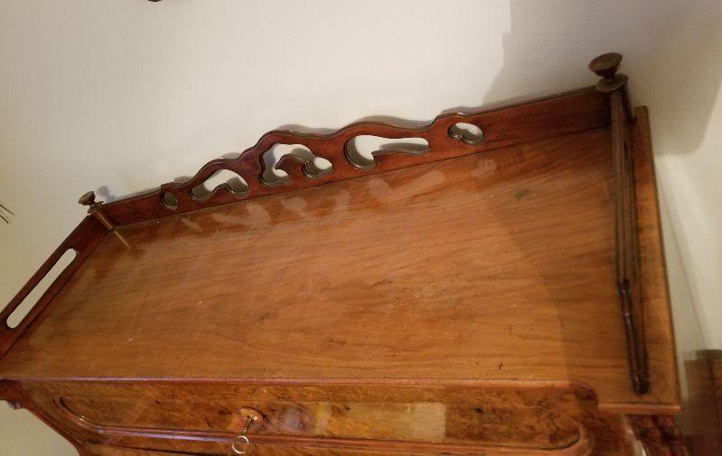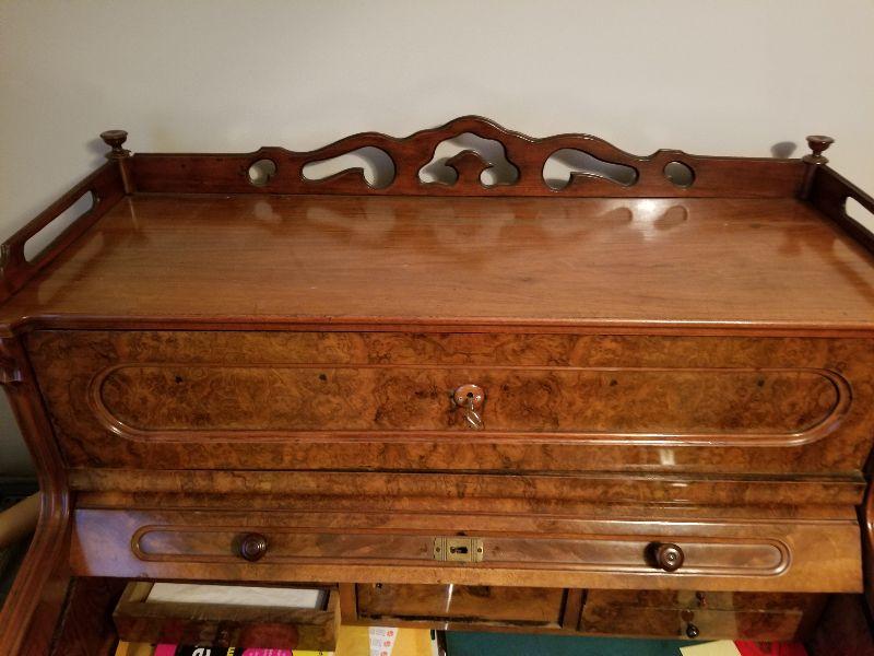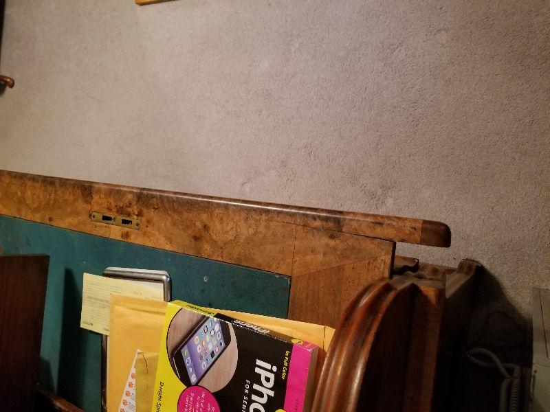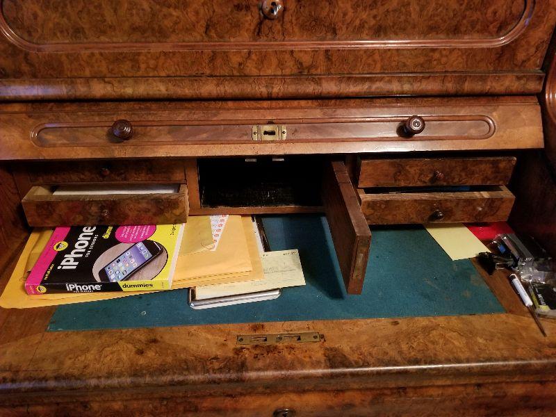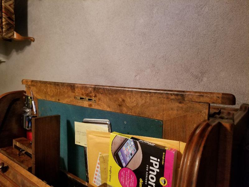 This beautiful roll top desk has all the features you would expect in this piece of furniture. The top has a simple scroll work border to keep items contained in that area. Top section can be locked and unlocked, but is difficult to open. Main working area has a felt base (Felt has wear from use) and pulled out for more working area and additional leg room. There are a couple of pictures that display the separation of the drawer from the desk with the edge overlapping the desk frame once pushed back in. Main working area compartment has various drawers and sections for organization. Desk is unique in that it has slide out candelabra/candle platforms that were used to provide additional lighting. A reasonable starting bid has been added to this item. ***You will need to bring your own help, tools, and equipment to remove this item. Auction company has no way of helping you remove this item from the house.