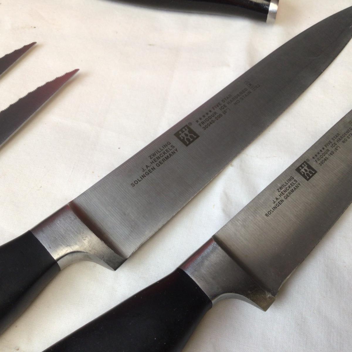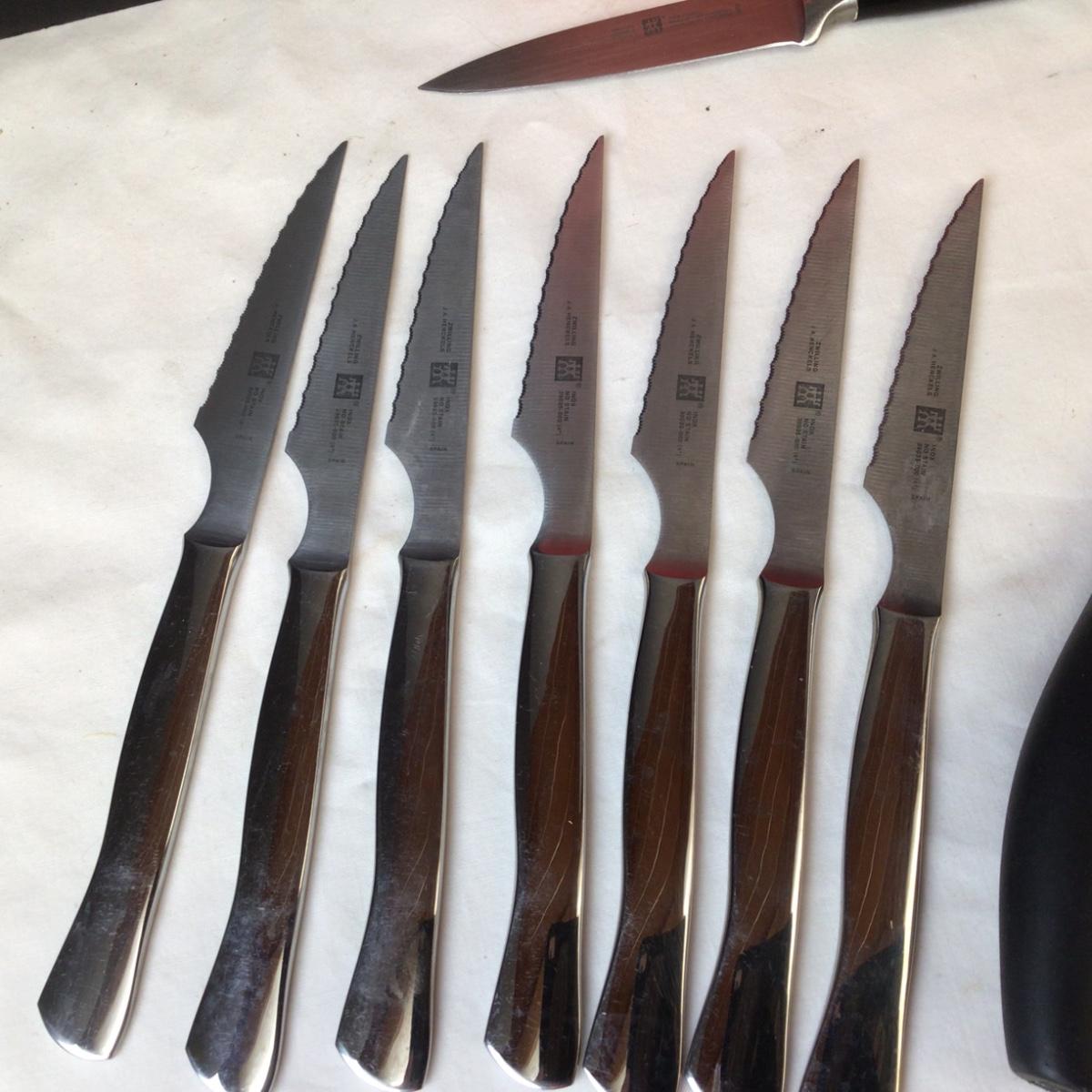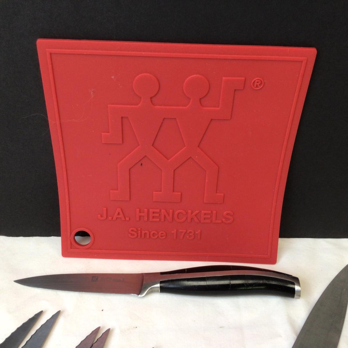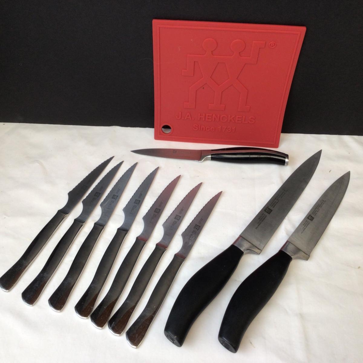 The lot contains 7 steak knives, 3 prep knives as well as a silicone pot holder, all are J.A. Henckels.