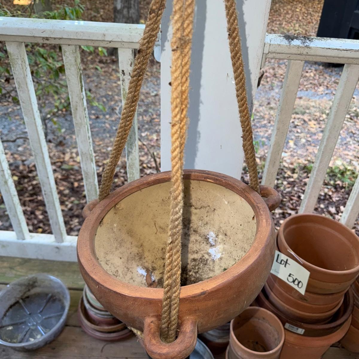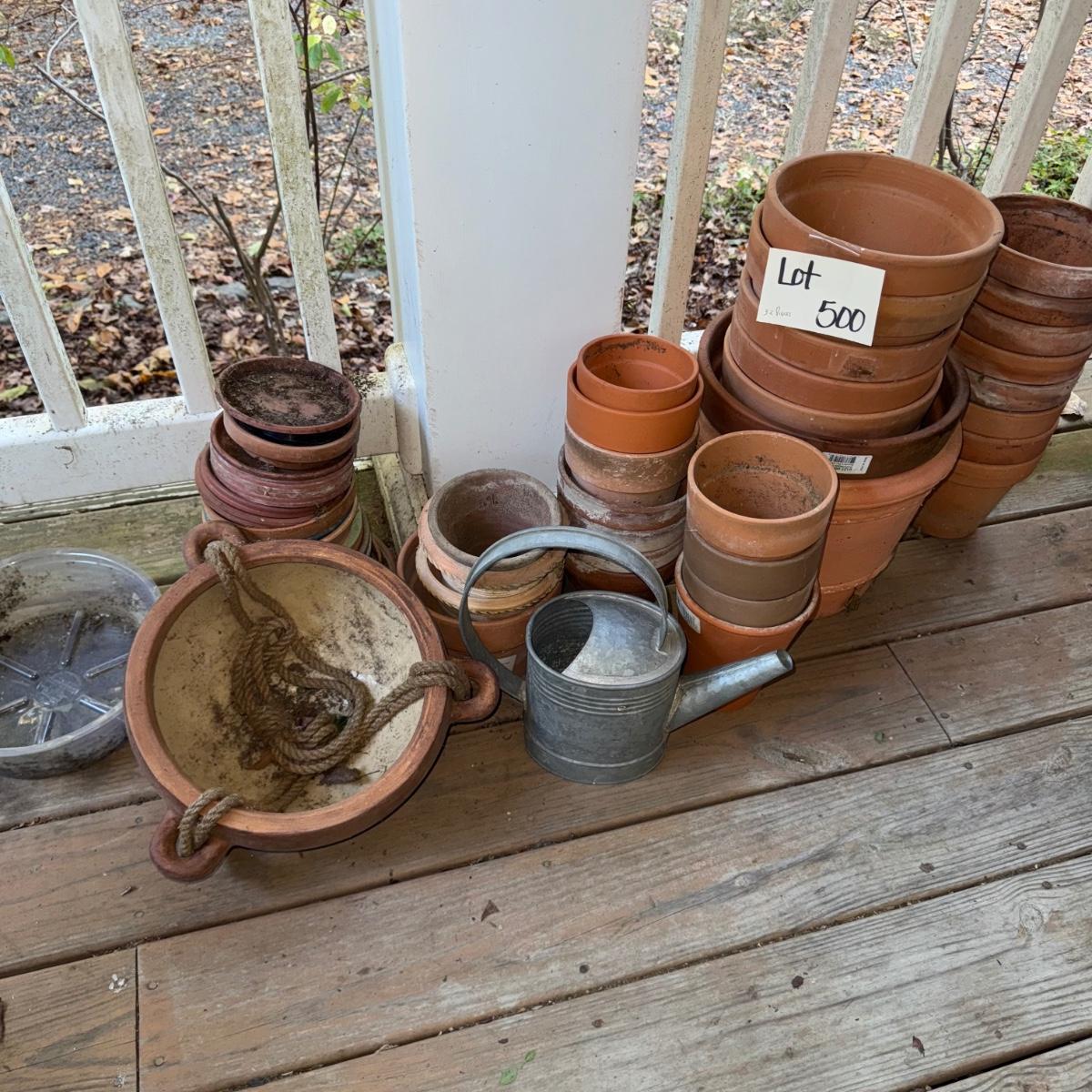 Large Mix Terra-Cotta Planter LOT approx 33 pieces. Some planters come with a removable base. Qty (1) hanging terra-cotta planter with ropes. Not also comes with small tin watering can. Planters diameter range from 5 inches to 11 inches.